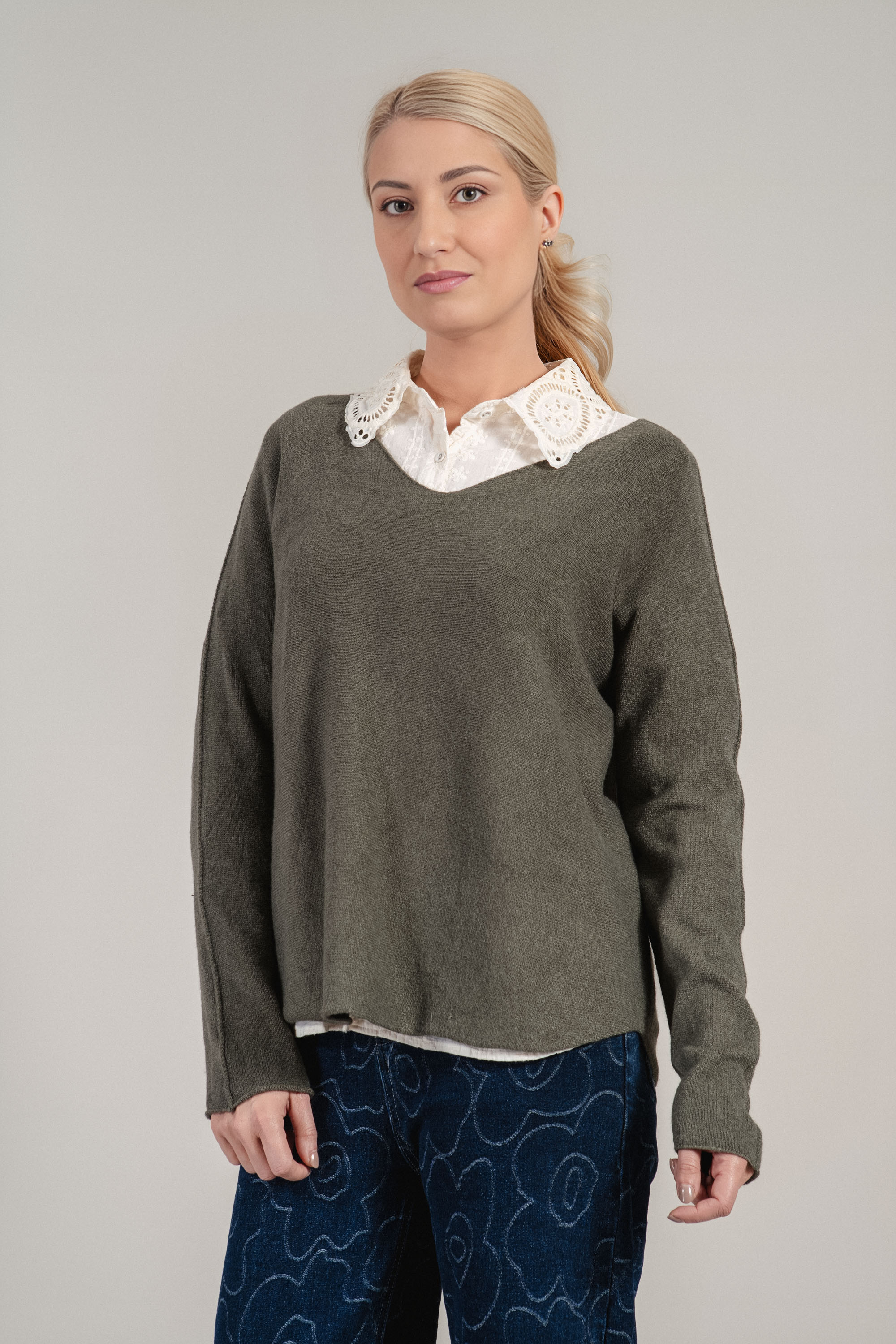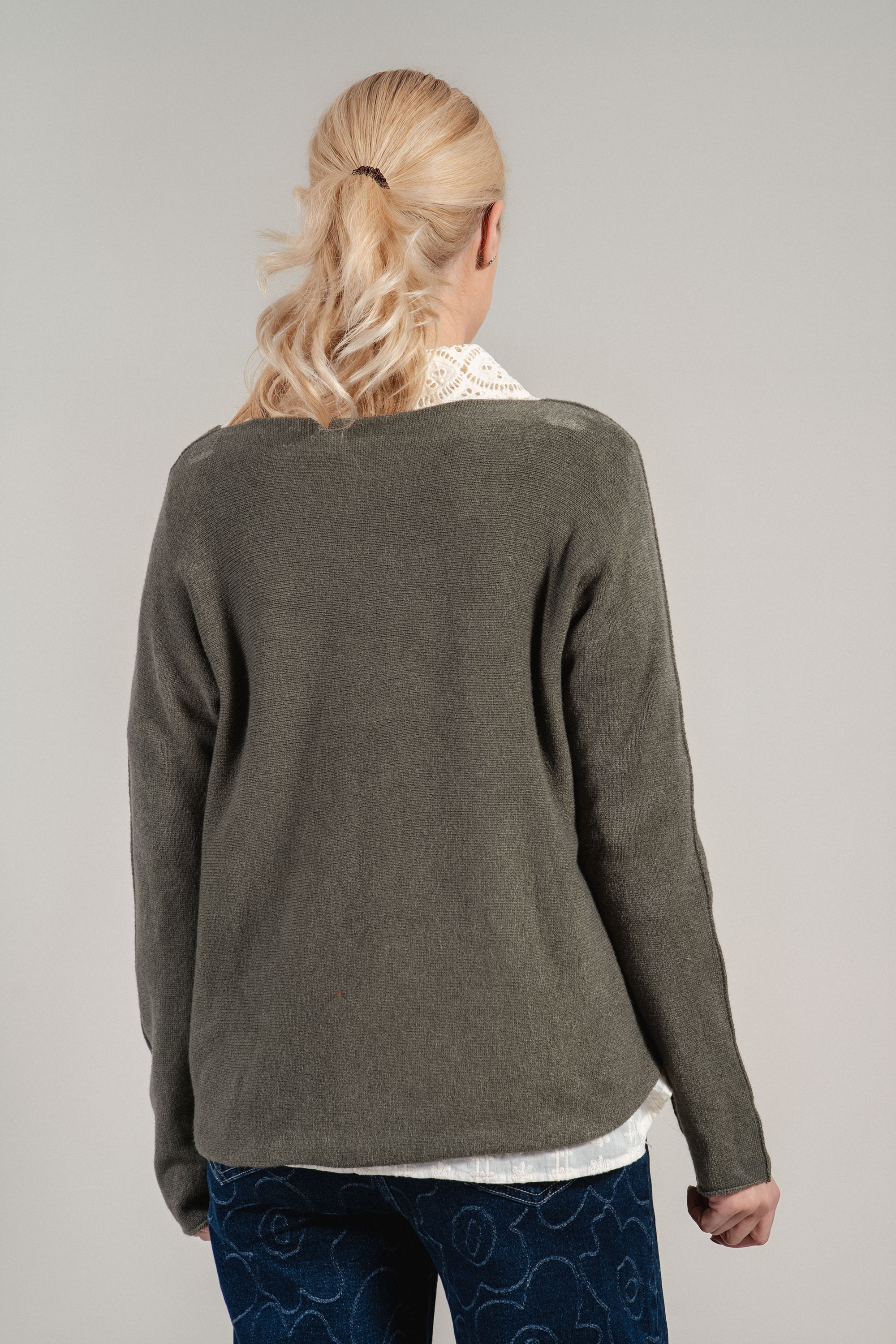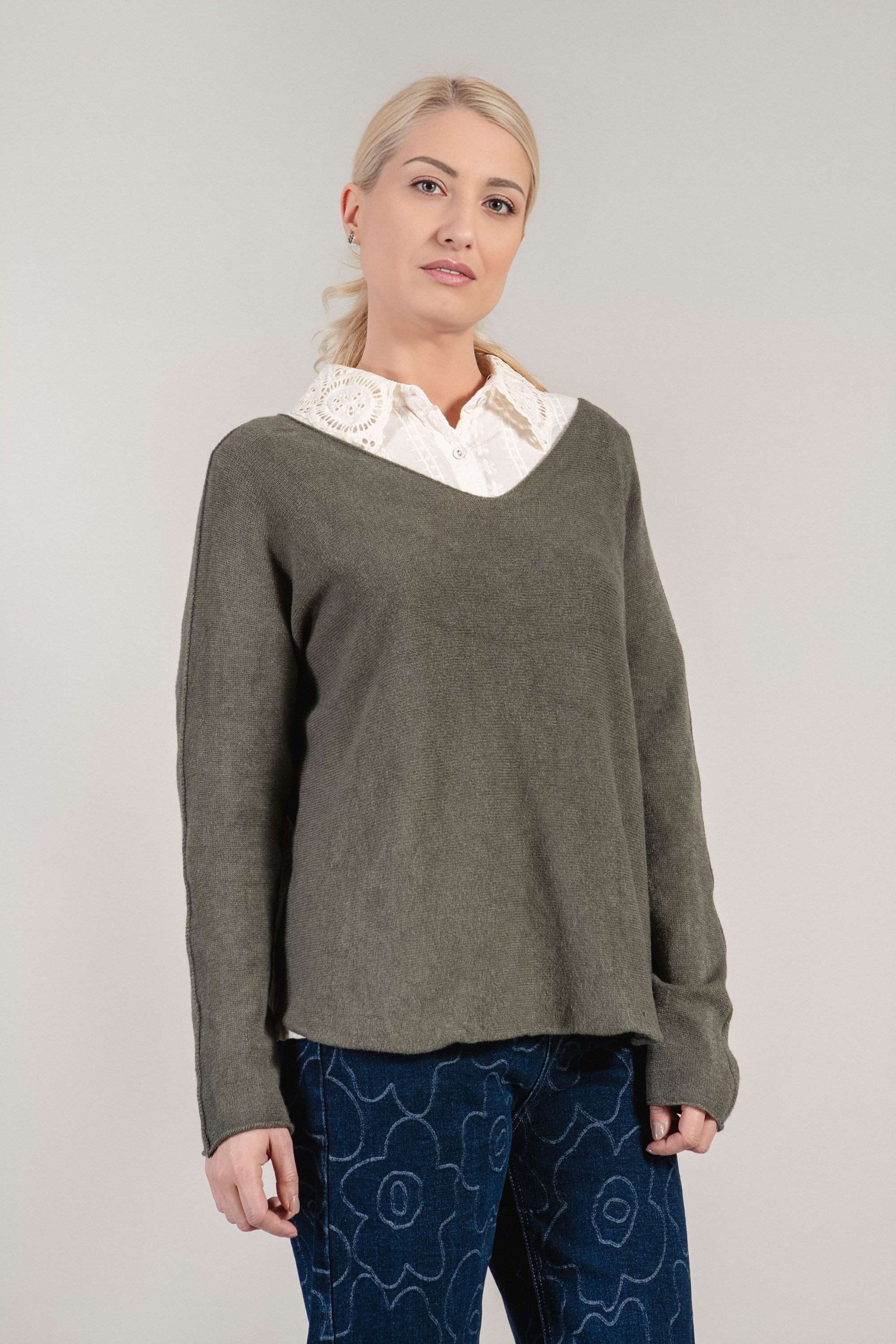 Дамски пуловер от фино плетиво в цвят милитъри с остро деколте