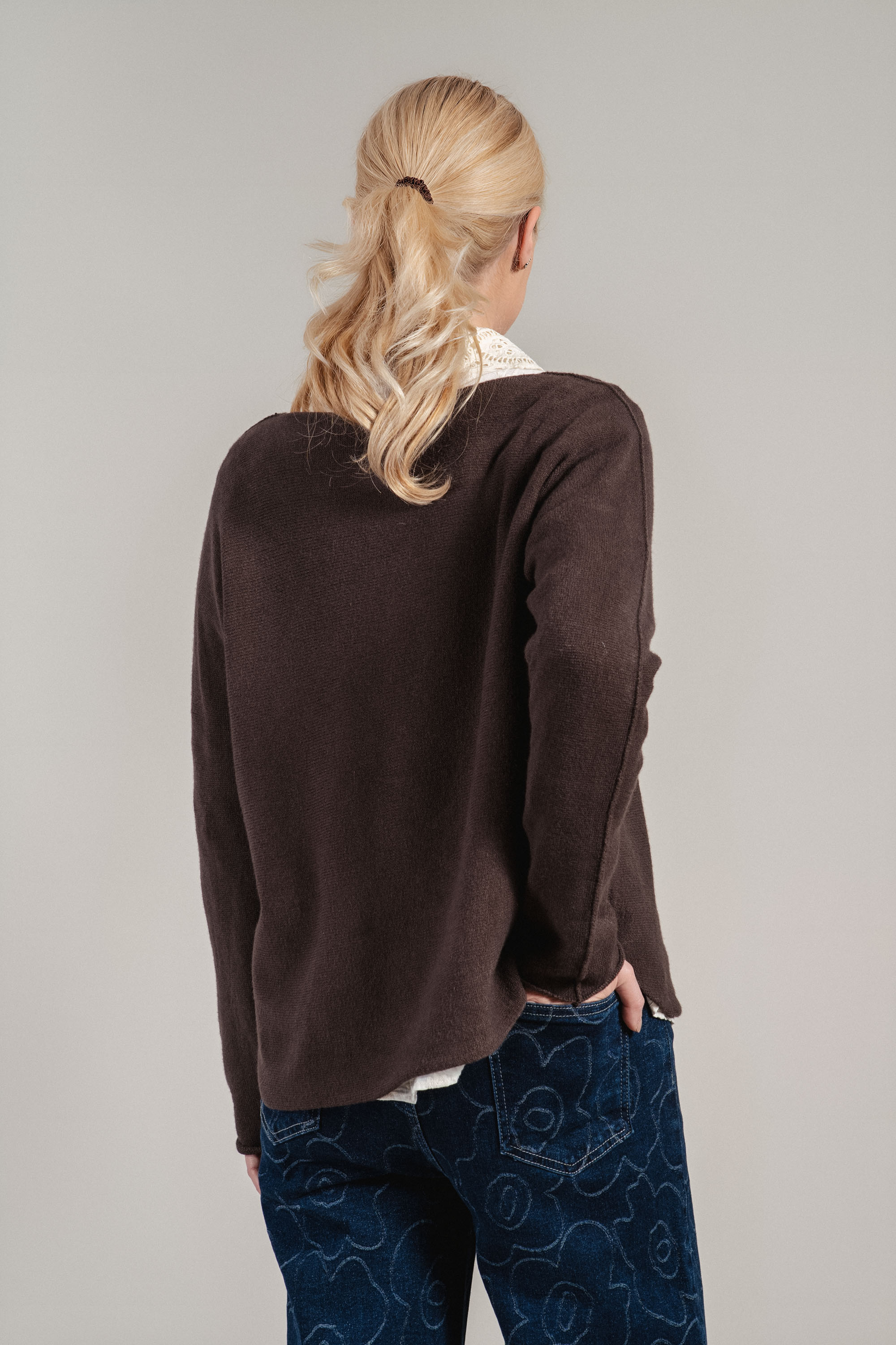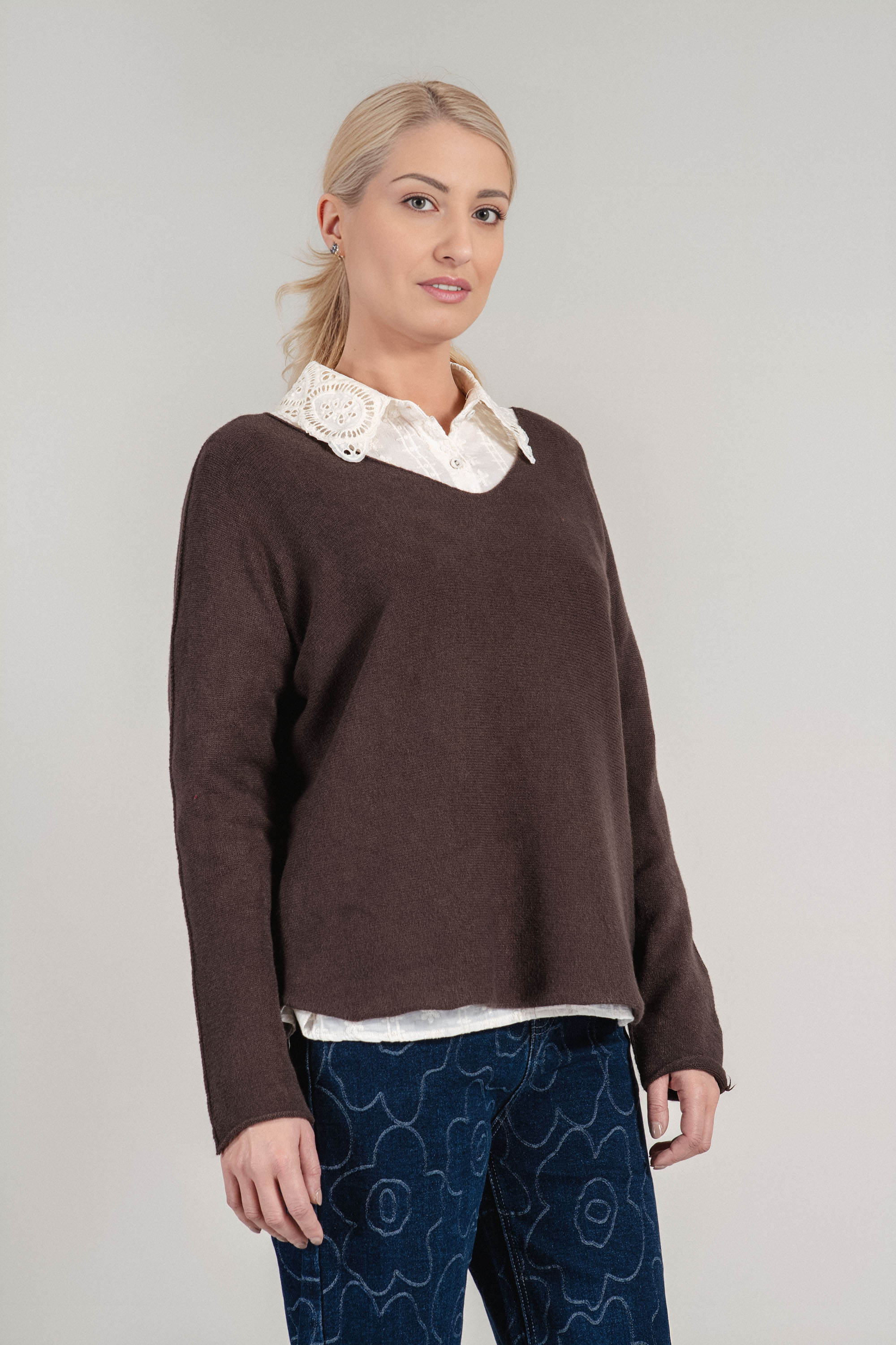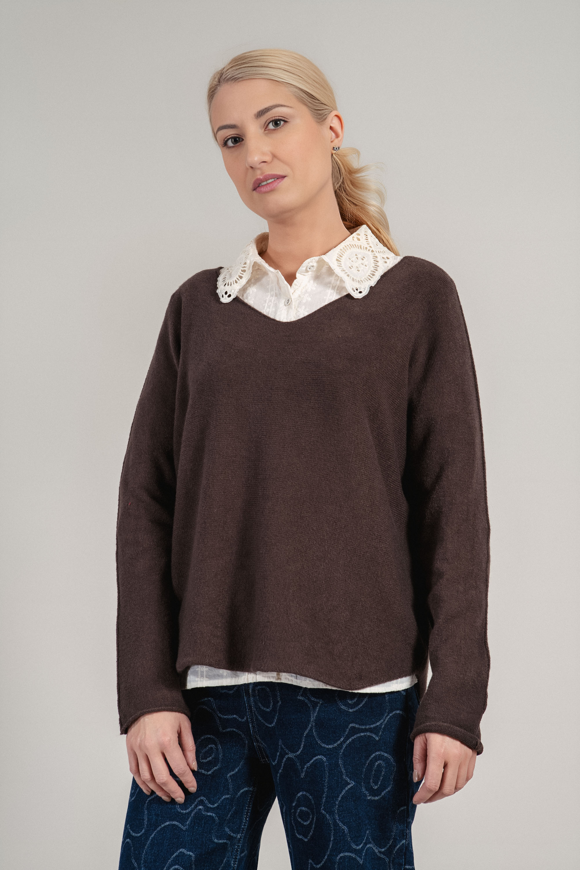 Пуловерът е изработен от меко фино плетиво, което съчетава комфорт и елегантност в едно. Свободният силует с остро деколте придава женственост и лекота на визията. Подходящ за носене както самостоятелно, така и под сако или палто. Кафявият цвят носи топлина и стил, идеален за есенно-зимния сезон.