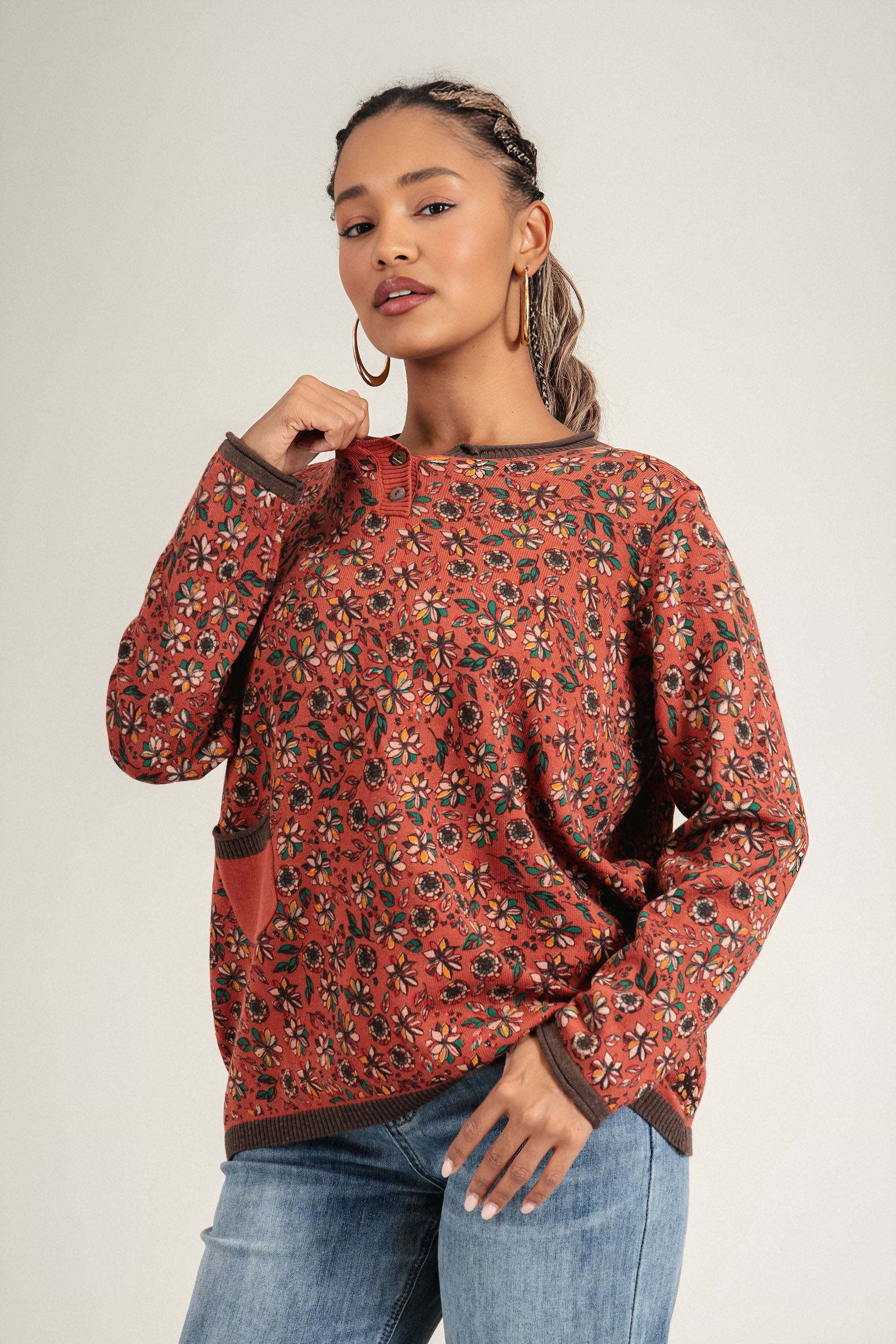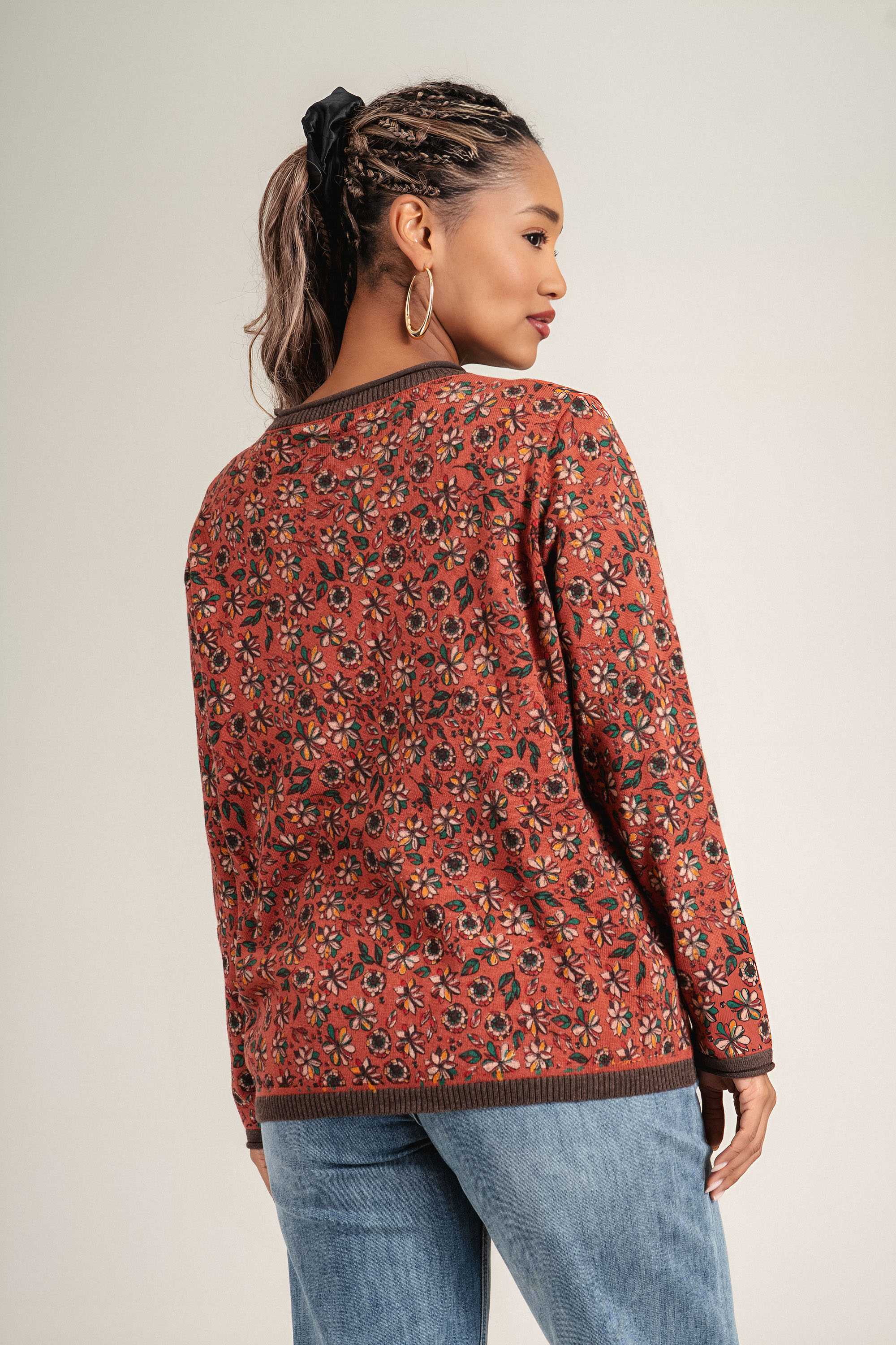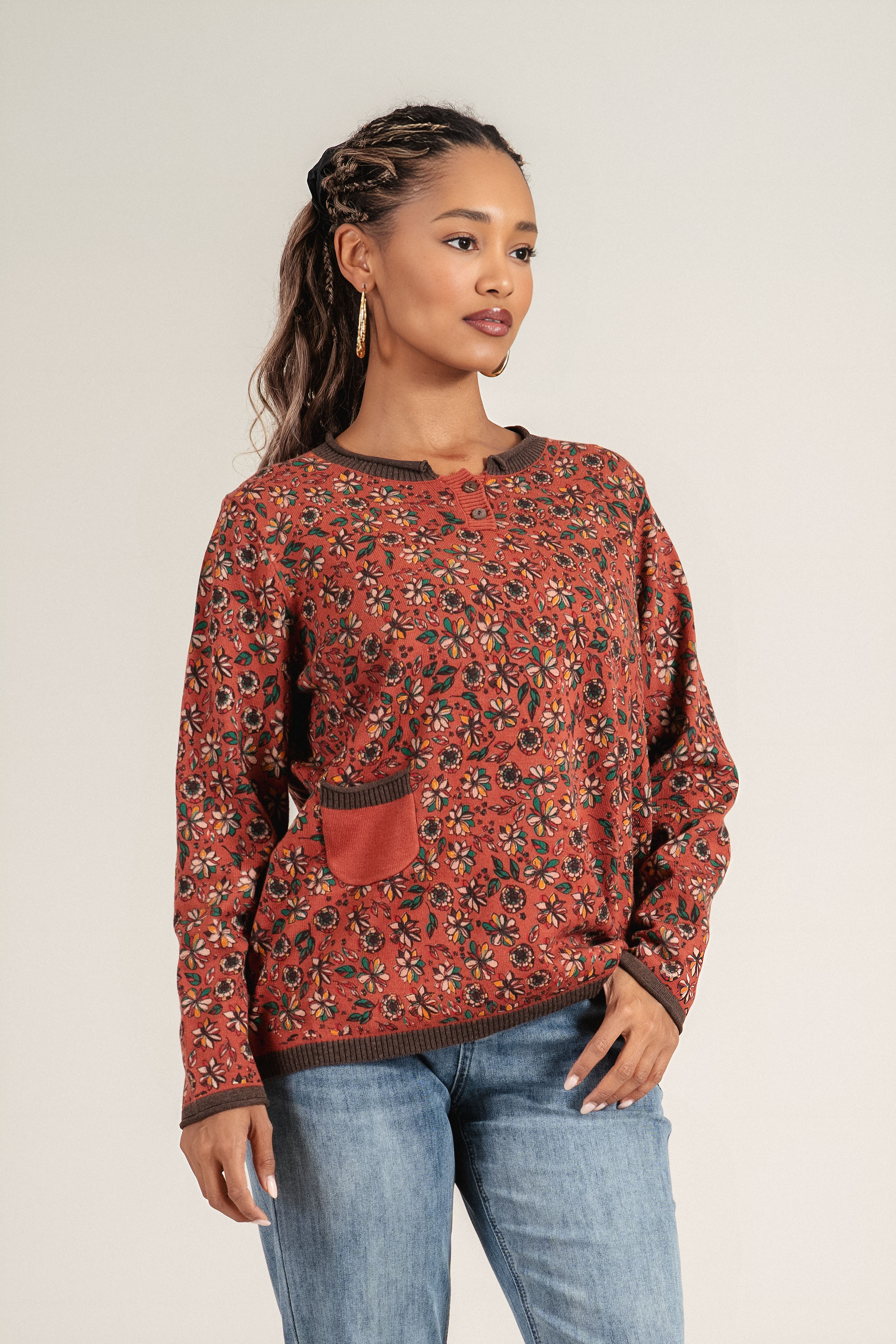 Този пуловер в топъл керемиден нюанс е създаден от фино плетиво, което осигурява мекота и комфорт при носене. Флоралният принт в предната част придава артистично излъчване. Подходящ за хладните дни на есента и зимата.