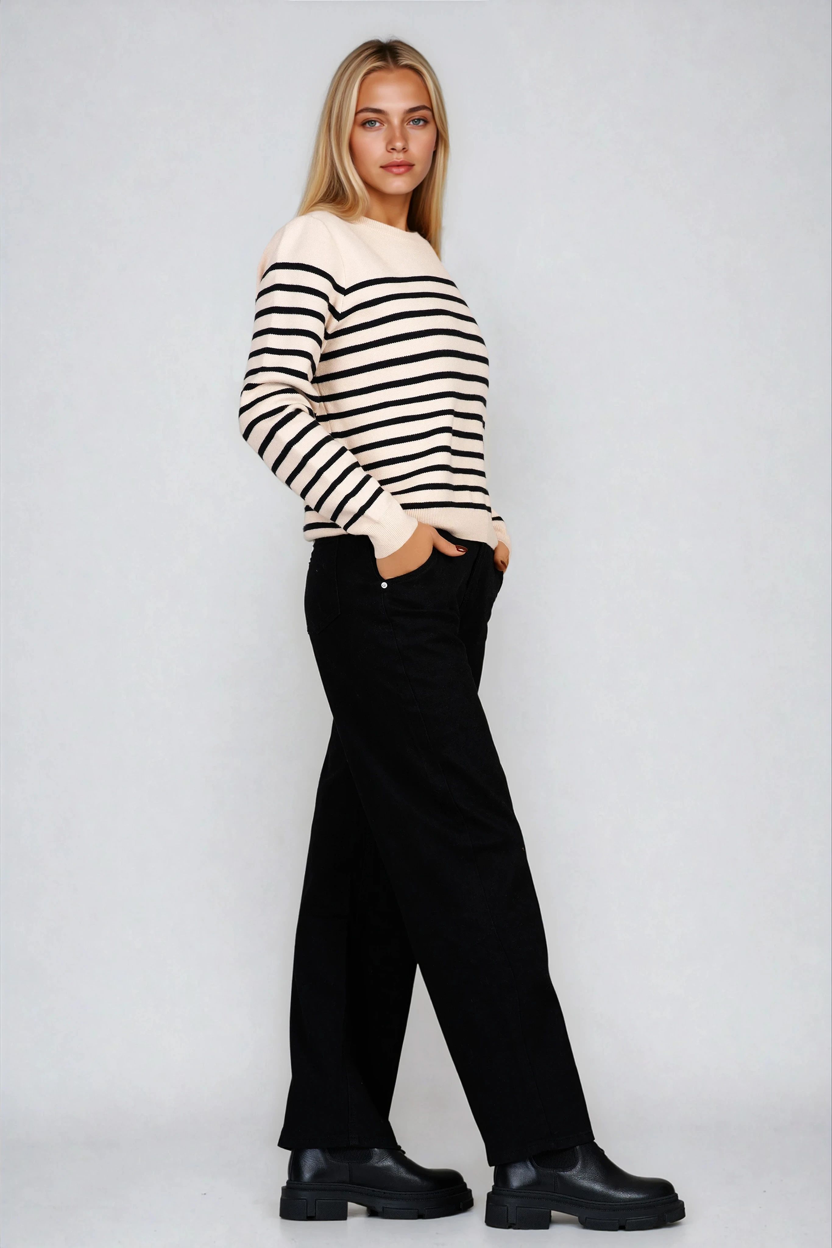 Елегантен пуловер от италианско фино плетиво с изчистена кройка и класическо черно райе. Акцентът пада върху златистите копчета на раменете, които придават изтънченост. Подходящ за офиса, градски разходки и вечерни излизания. Носи се отлично с панталони, поли или дънки.
