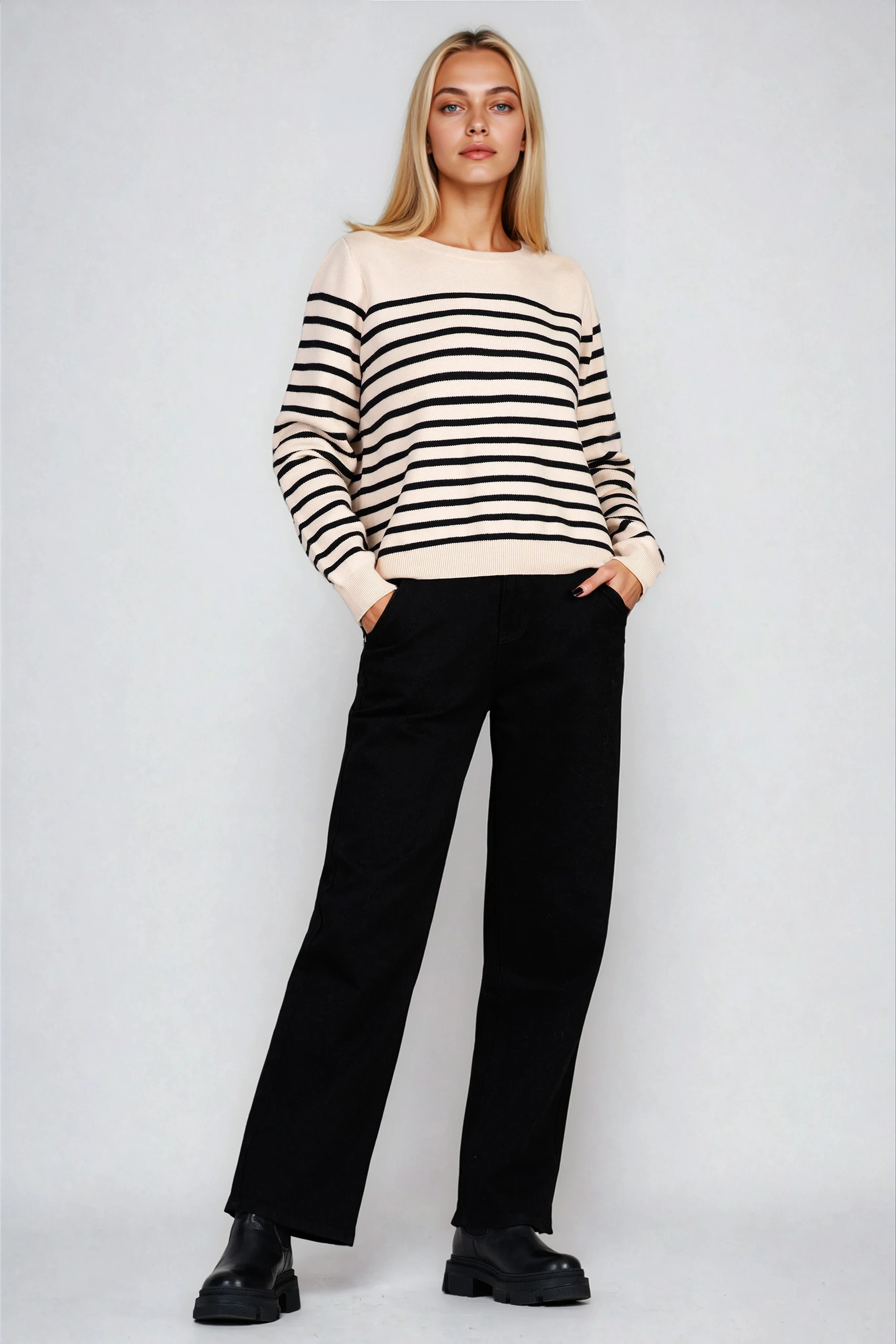 Дамски пуловер от фино плетиво в светлобежово с черно райе