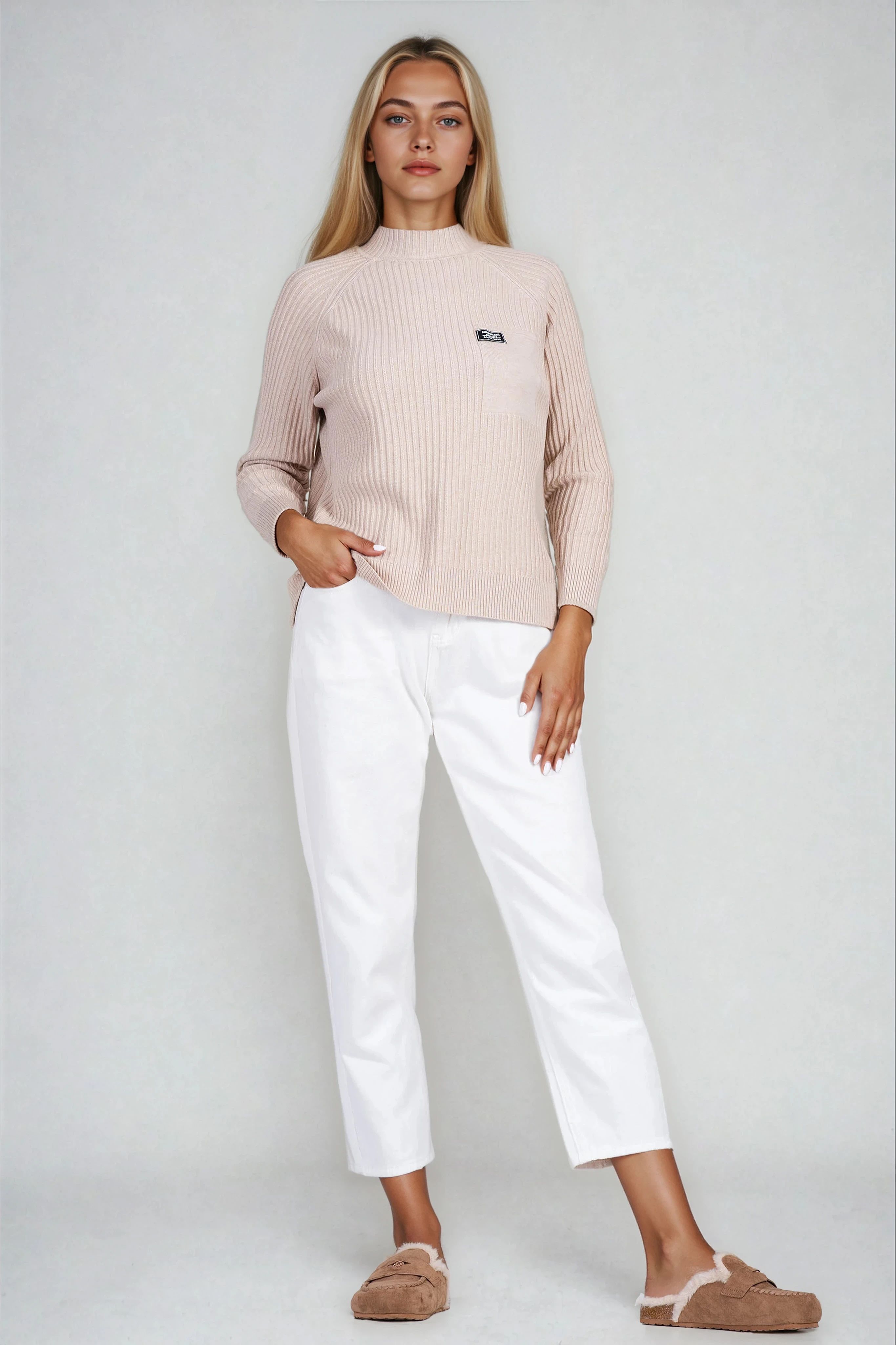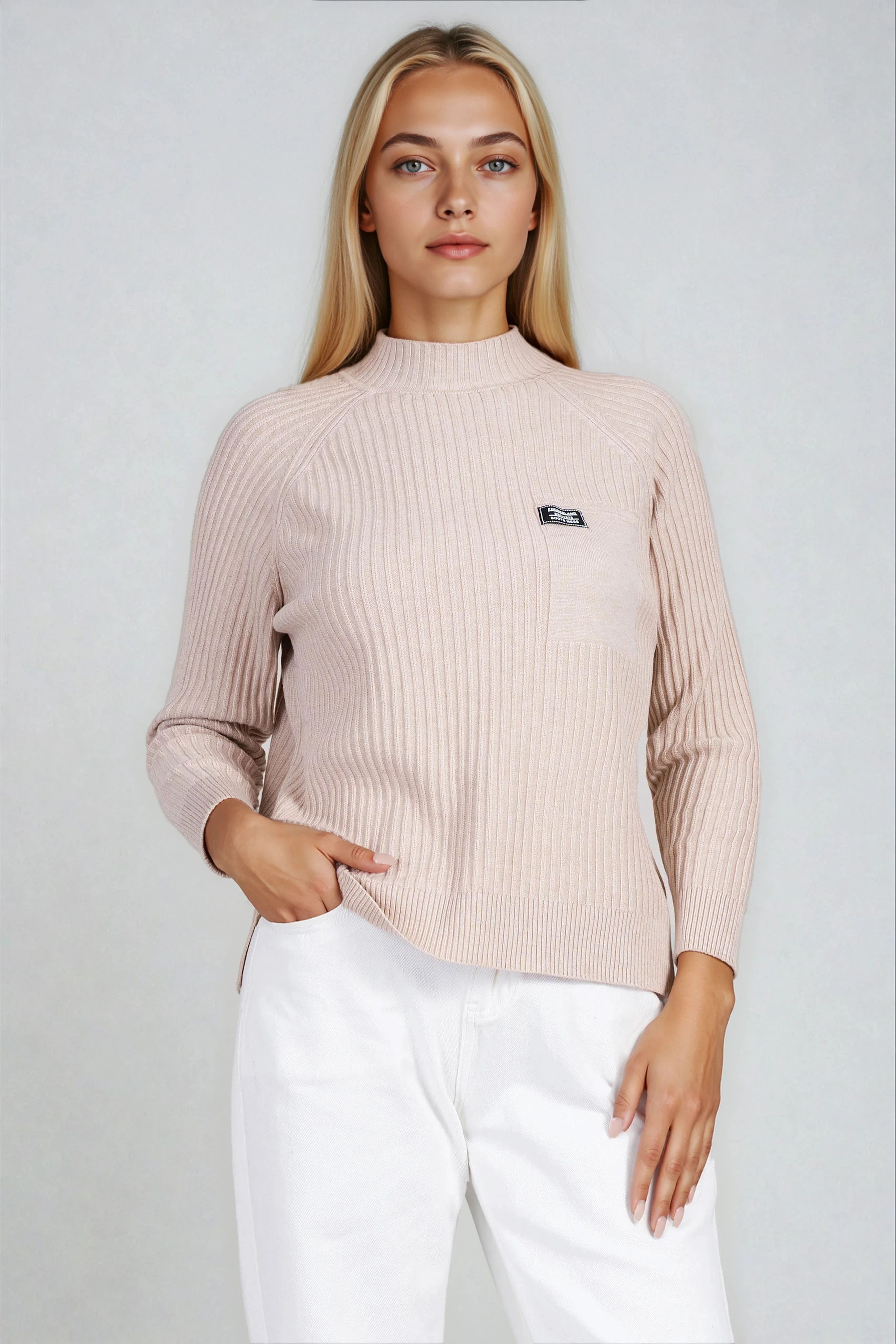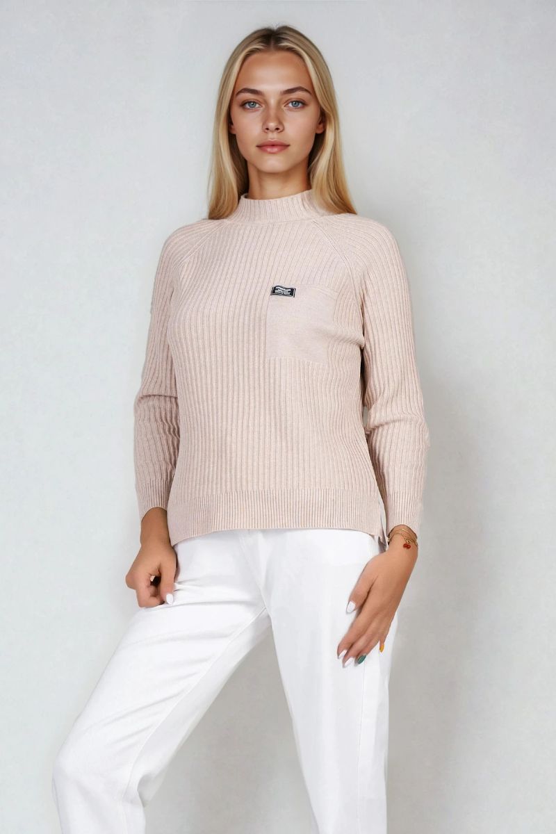 Този пуловер в неутрален бежов тон съчетава изчистена визия с практичен стил. Релефната плетка и полуполо яката подчертават елегантността на силуета, докато декоративният джоб на гърдите с контрастен надпис внася модерен акцент. Идеален за ежедневни визии с дънки или панталон.