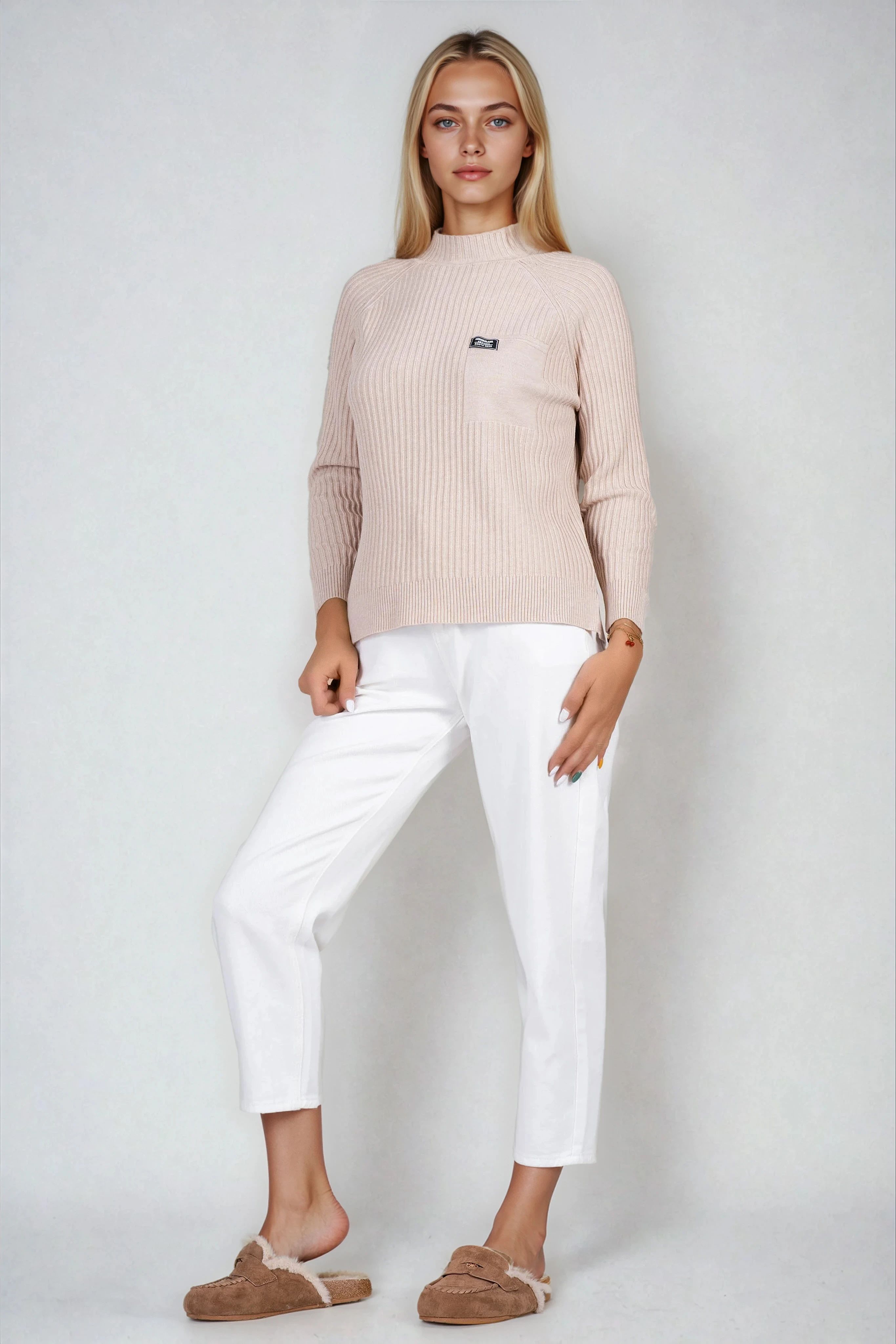 Дамски пуловер от фино релефно плетиво в бежово с имитация на джоб