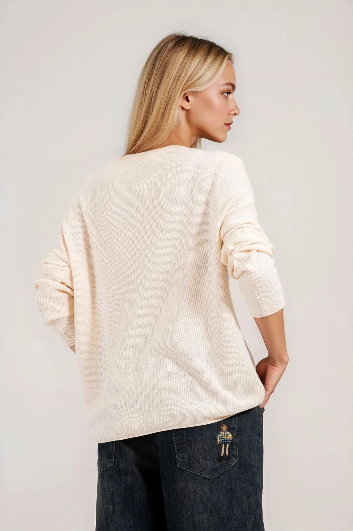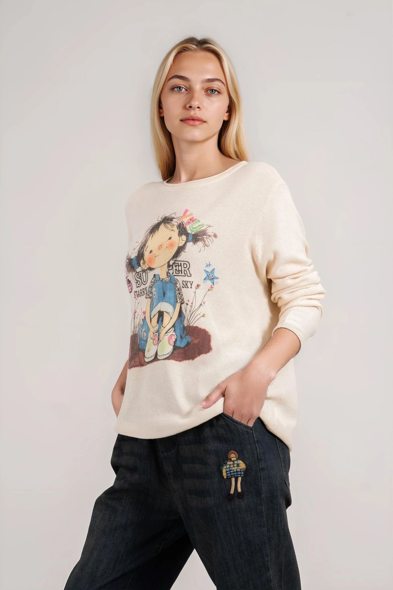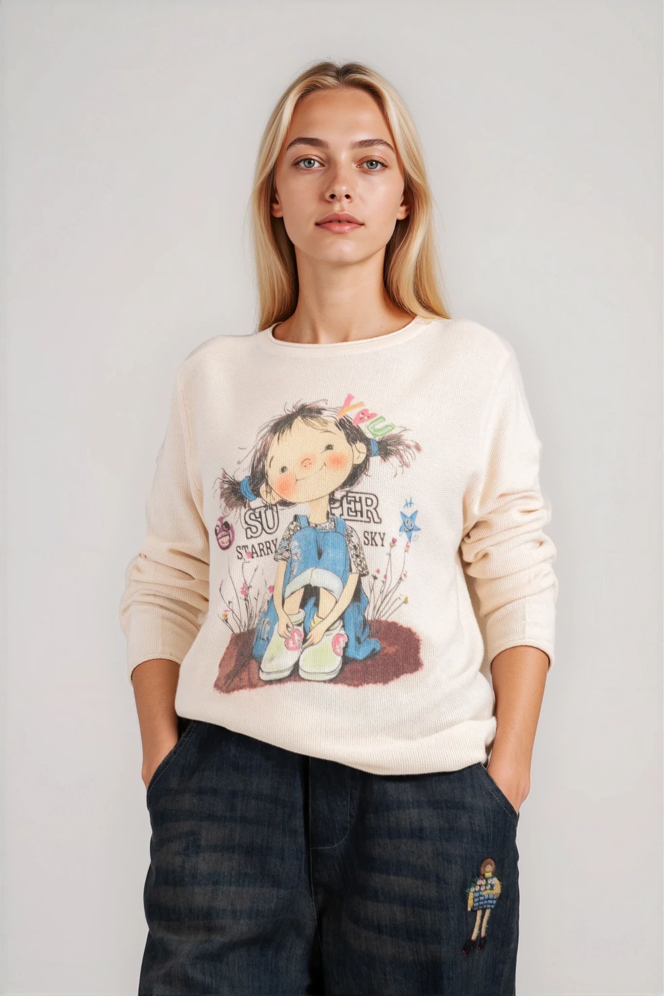 Изработен от меко плетиво, този пуловер в елегантен цвят екрю е чудесно допълнение към ежедневния гардероб. Щампата в пастелни тонове и стилният надпис „you super starry sky“ придават артистичен акцент. Облото деколте и класическата кройка осигуряват удобство и свобода на движение. Подходящ за носене през преходните сезони.