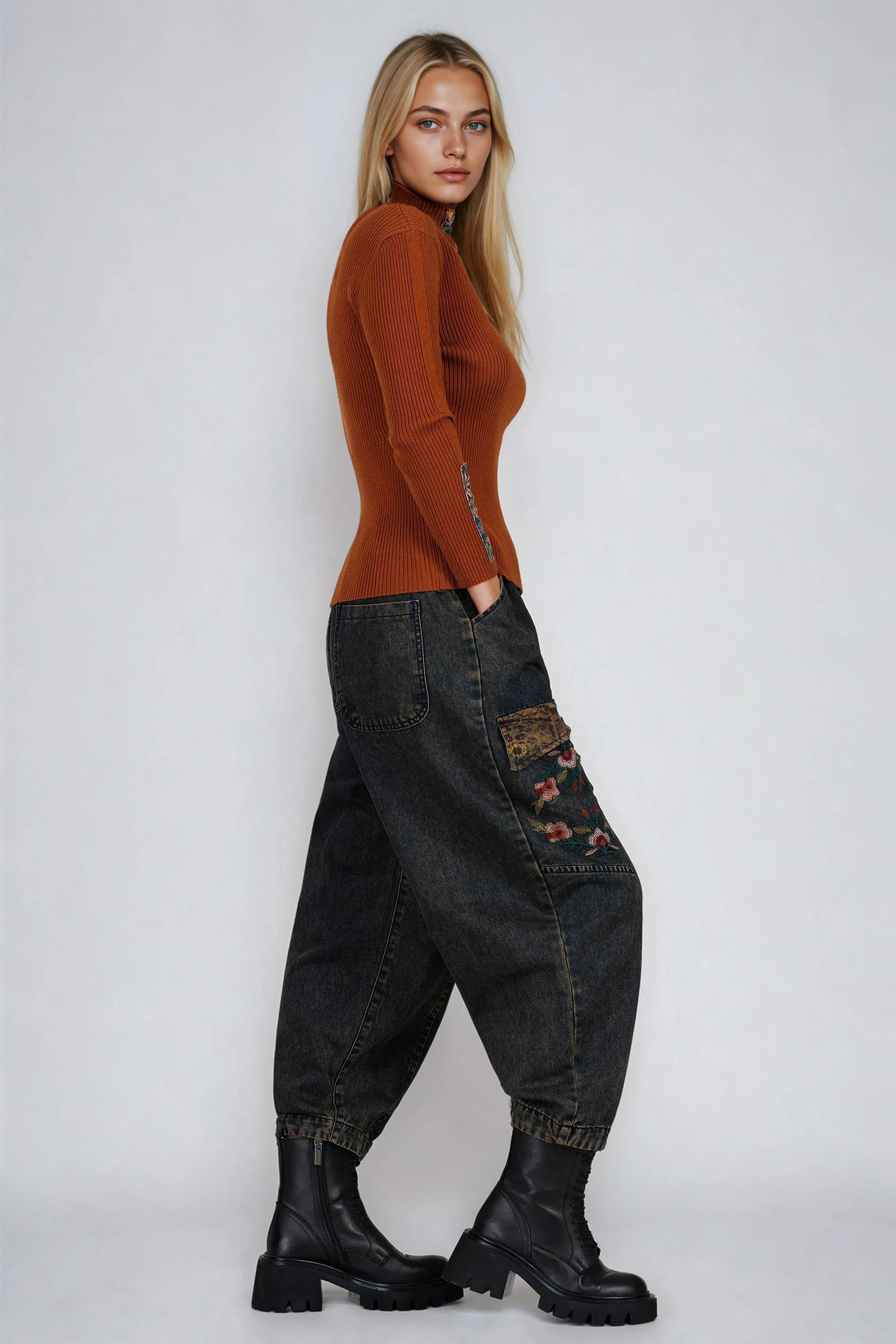 Модерен пуловер в керемидено оранжев нюанс с интересна вертикална апликация в цветен мотив. Поло яката осигурява допълнителна топлина. Подходящ за ежедневно носене, този модел съчетава мекота и стил.