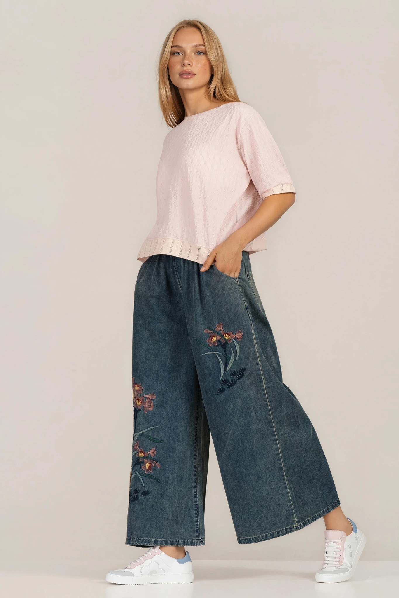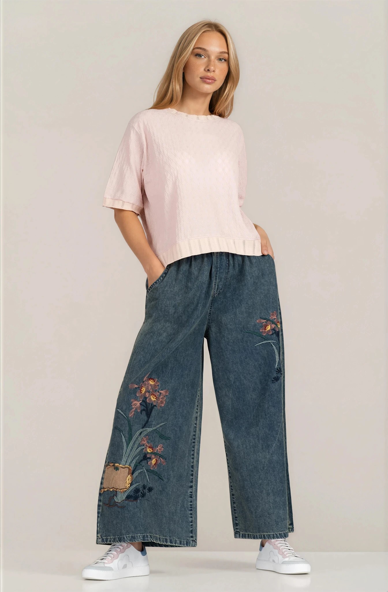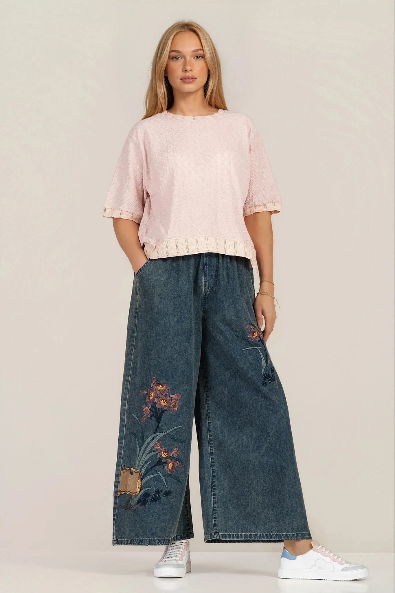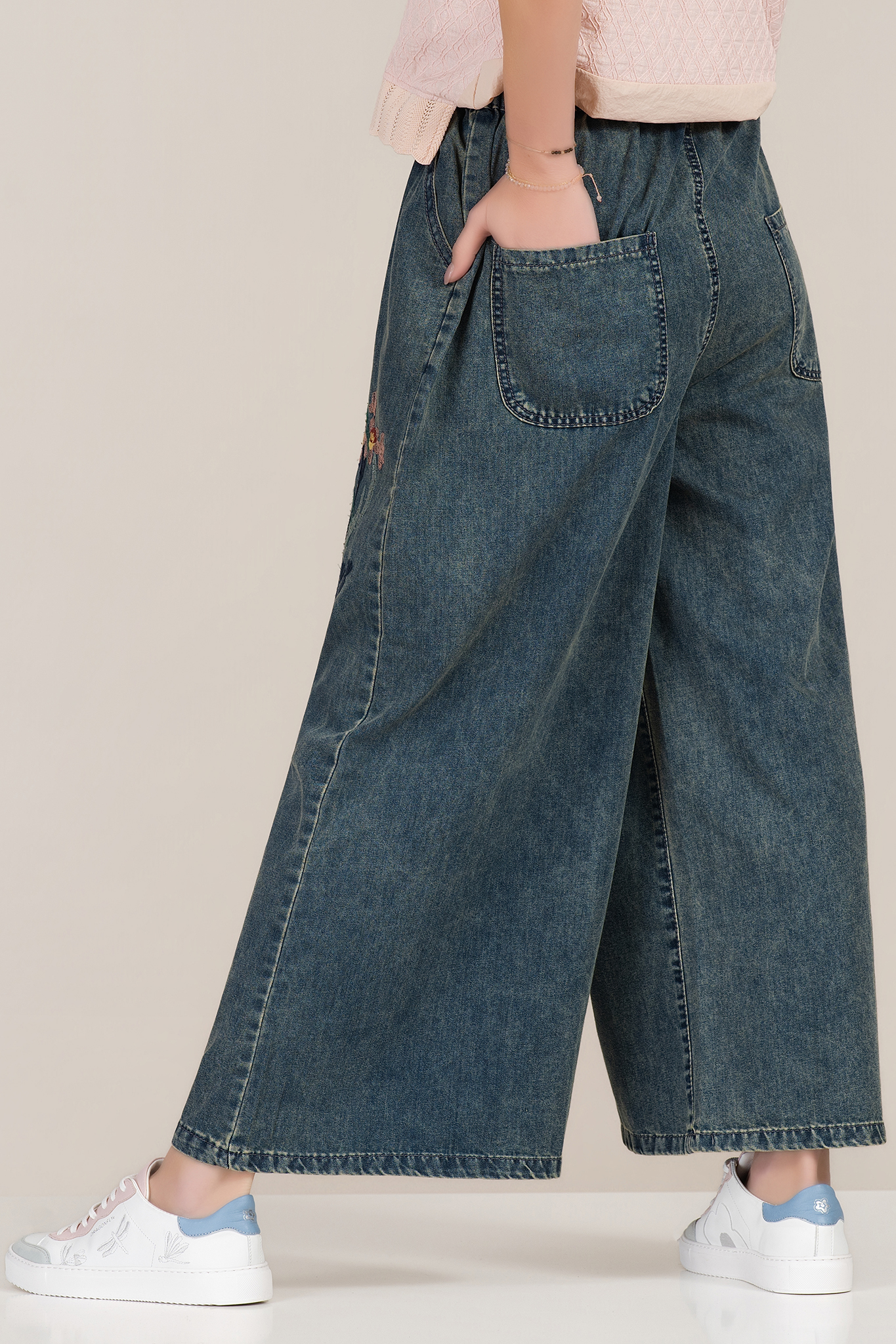 Стилни дънки с характерен дизайн и деликатни бродирани мотиви, които създават отличителен акцент. Деним материята е приятна на допир и подходяща за целодневно носене. Широкият крачол придава актуален силует, а еластичната талия с връзки гарантира практичност и комфорт. Перфектни за небрежни визии с модерен почерк.