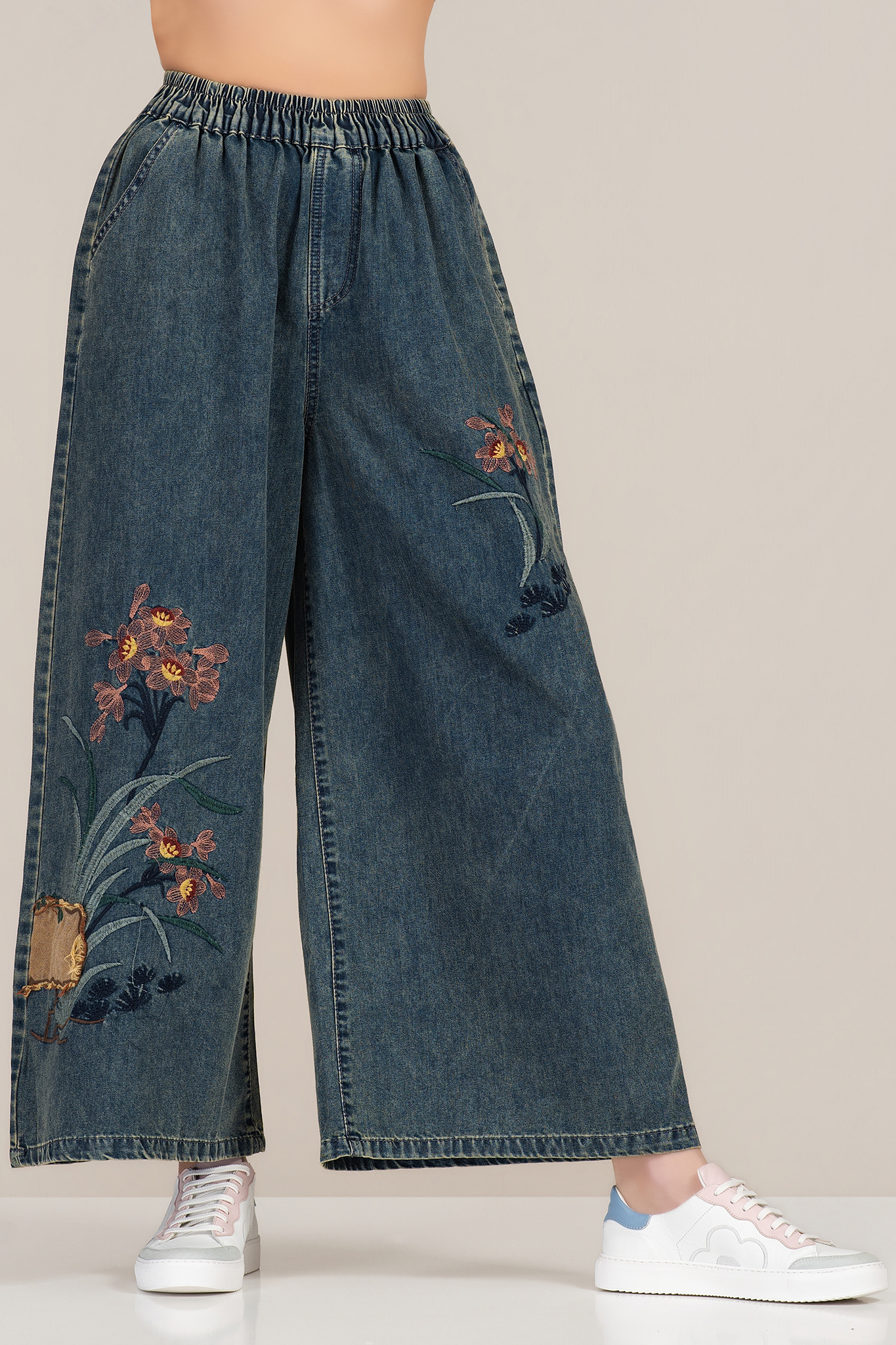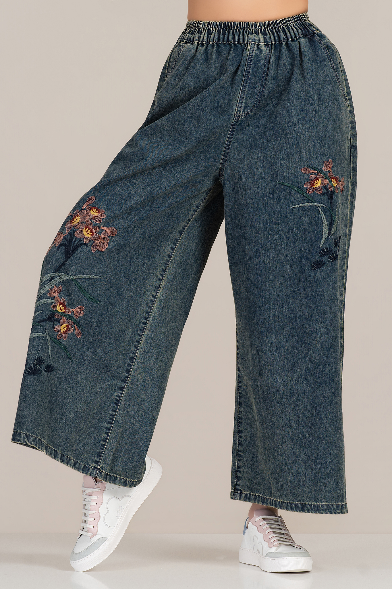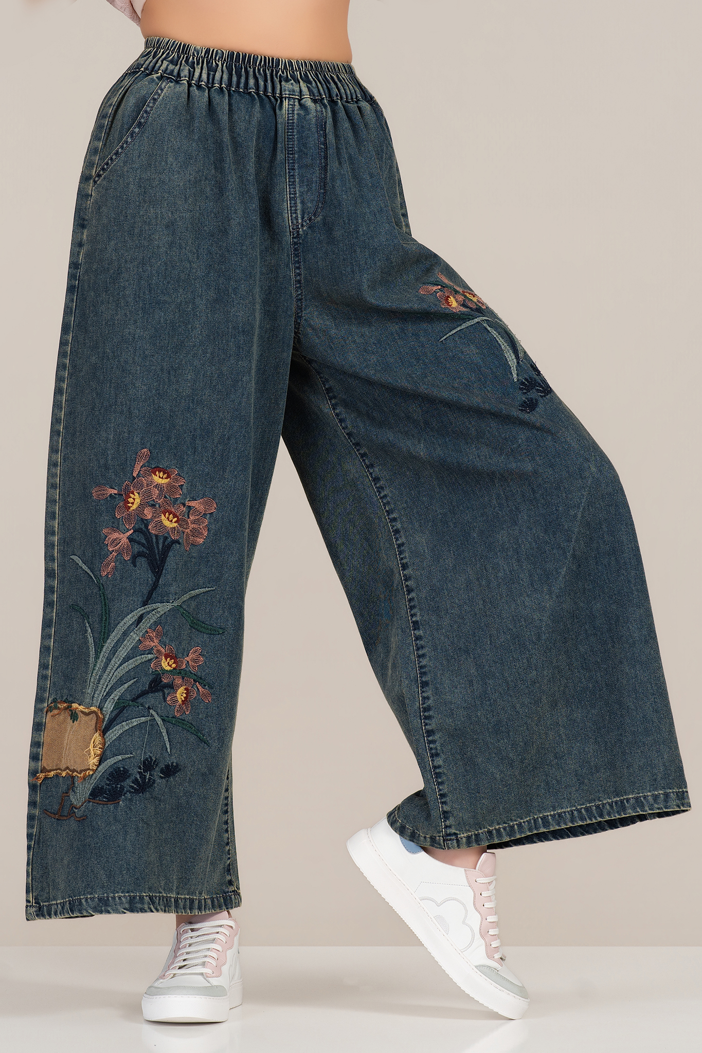 Дамски широки дънки с връзки на талията и бродирани цветни мотиви