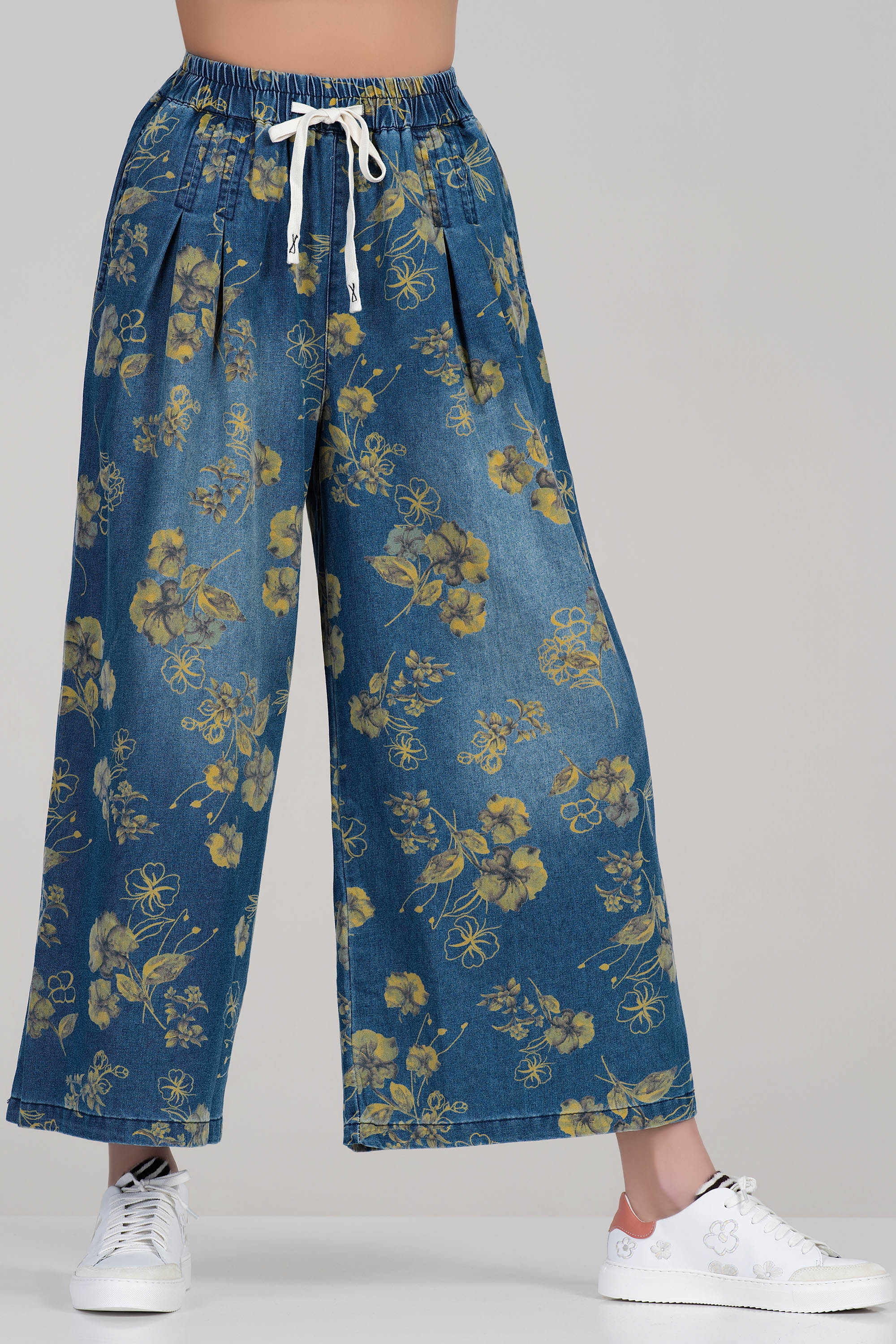Дамски широки флорални дънки с ластик и бели връзки