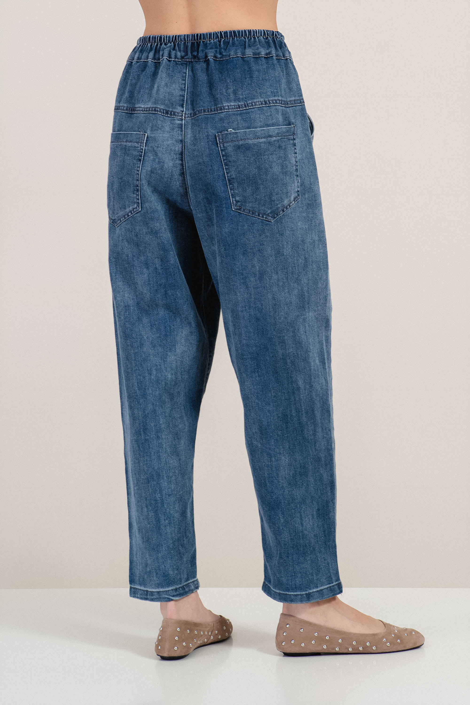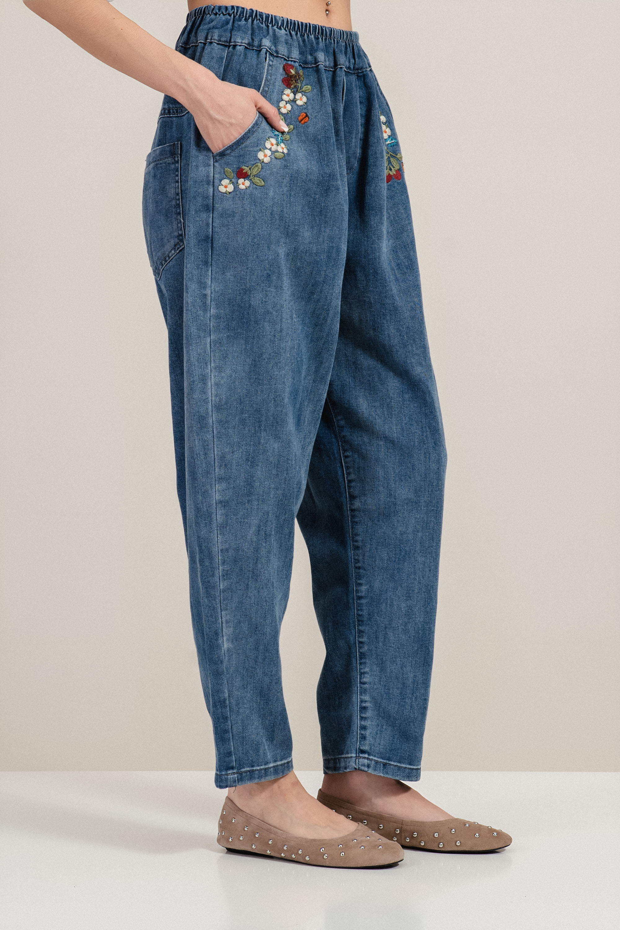 Моделът впечатлява със съчетание от класически деним и деликатни декоративни елементи. Дънките са изработени от памучна материя, която осигурява комфорт и естествено усещане при носене. Еластичната талия допринася за удобство и свобода на движение, а стесненият крачол оформя модерна и женствена линия. Бродираните цветя около джобовете придават свеж и отличителен акцент. Идеални са за ежедневни градски визии през пролетния и летния сезон.