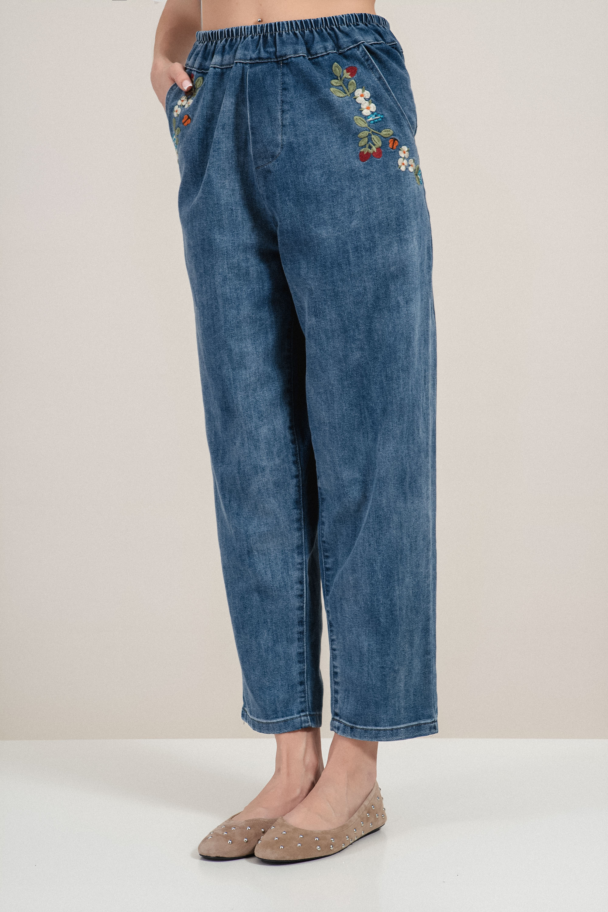 Дамски сини дънки с еластична талия и бродирани цветя