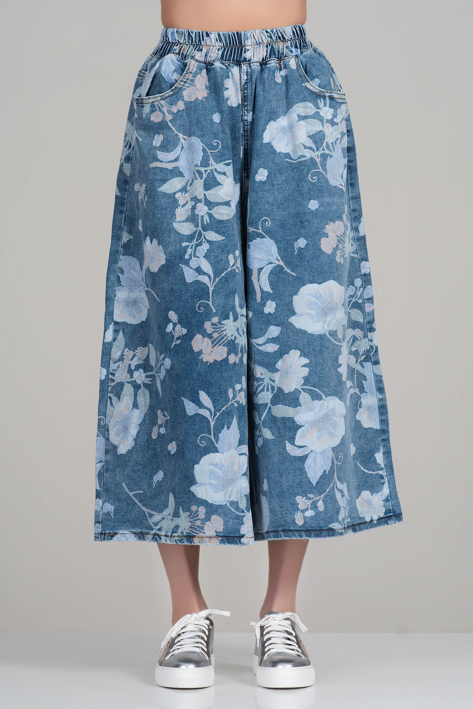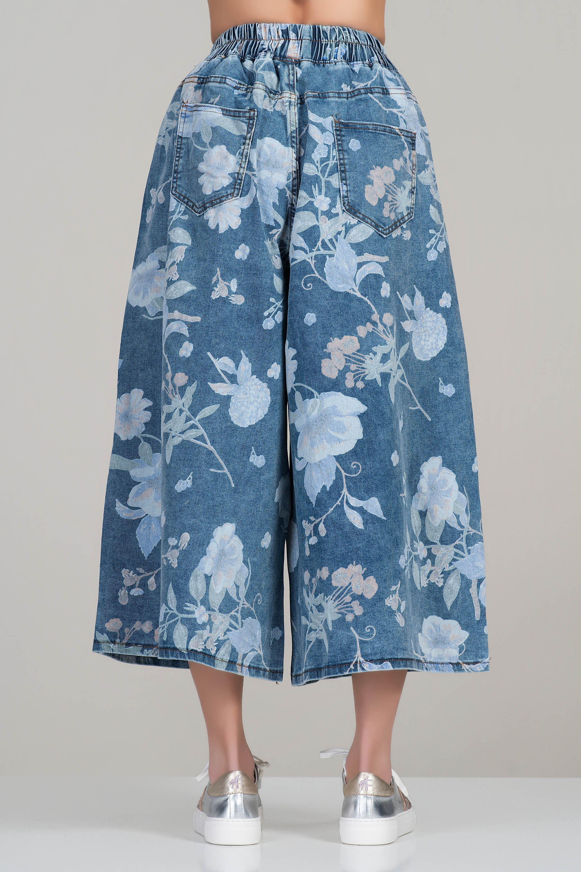 Дамски светлосини дънки "Dragonfly" с широк крачол, цветен флорален принт и 7/8 дължина