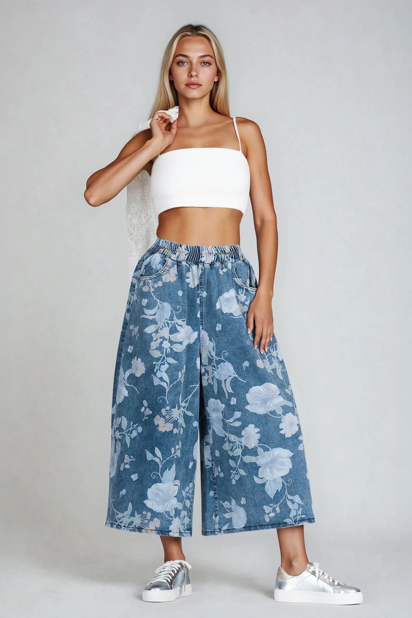 Този модел на "Dragonfly" се откроява със светъл флорален десен върху класически деним. Широките 7/8 крачоли създават модерен обем, докато еластичната талия осигурява комфорт през целия ден. Двата предни и задни джоба добавят функционалност, а пастелните цветове правят дънките подходящи за пролетно-летни съчетания с кецове, еспадрили или сандали.