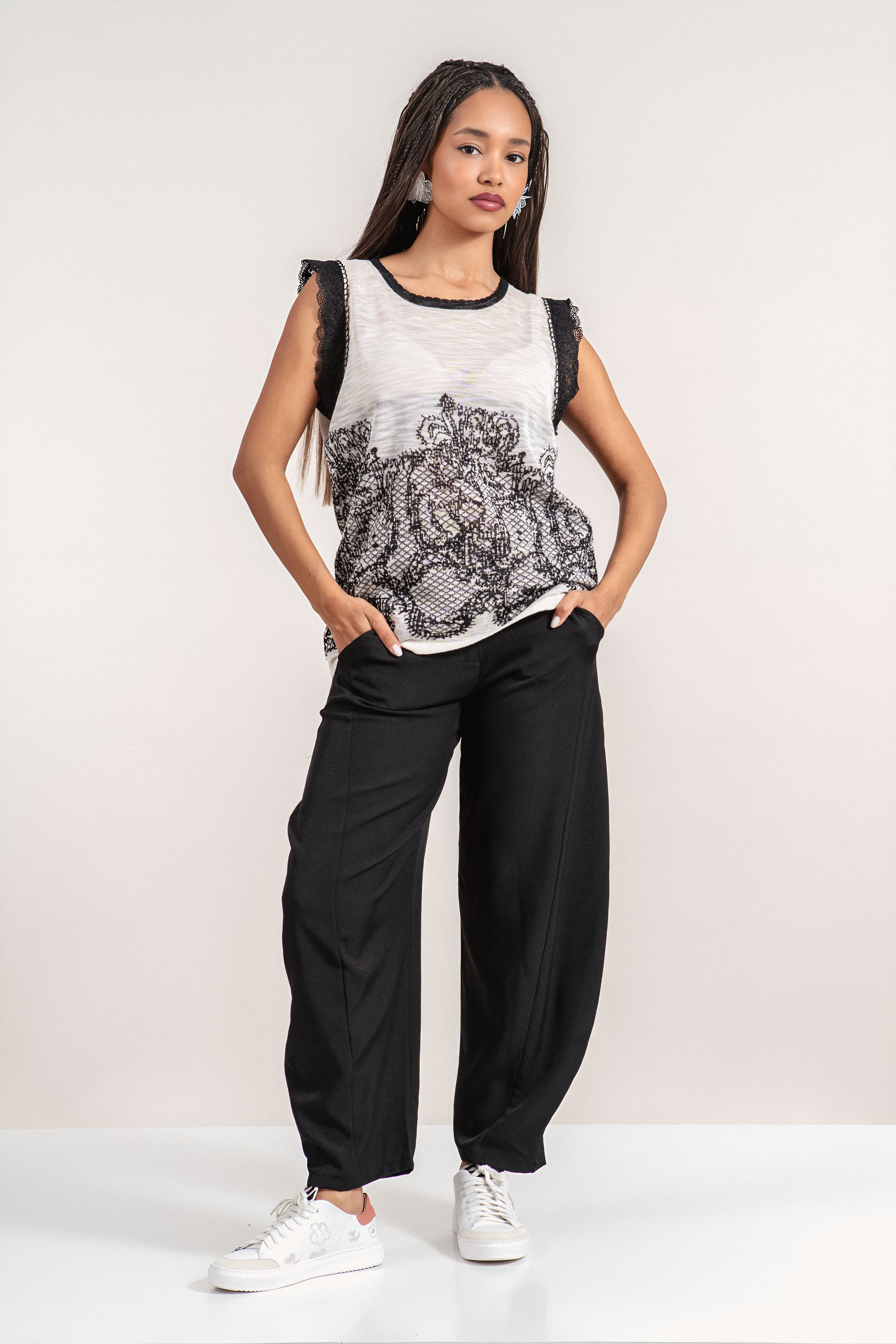 Стилeн дамски топ с модерно излъчване, създадена за комфорт и женствена визия. Фината плетка с високо съдържание на вискоза осигурява лекота и мекота при носене, като същевременно запазва формата си. Акцентите от черна бродерия при презрамките и обло деколте добавят деликатна елегантност, а контрастният десен в долната част придава характер на модела. Свободната линия позволява свобода на движение и е подходяща за динамично ежедневие или неформални поводи.