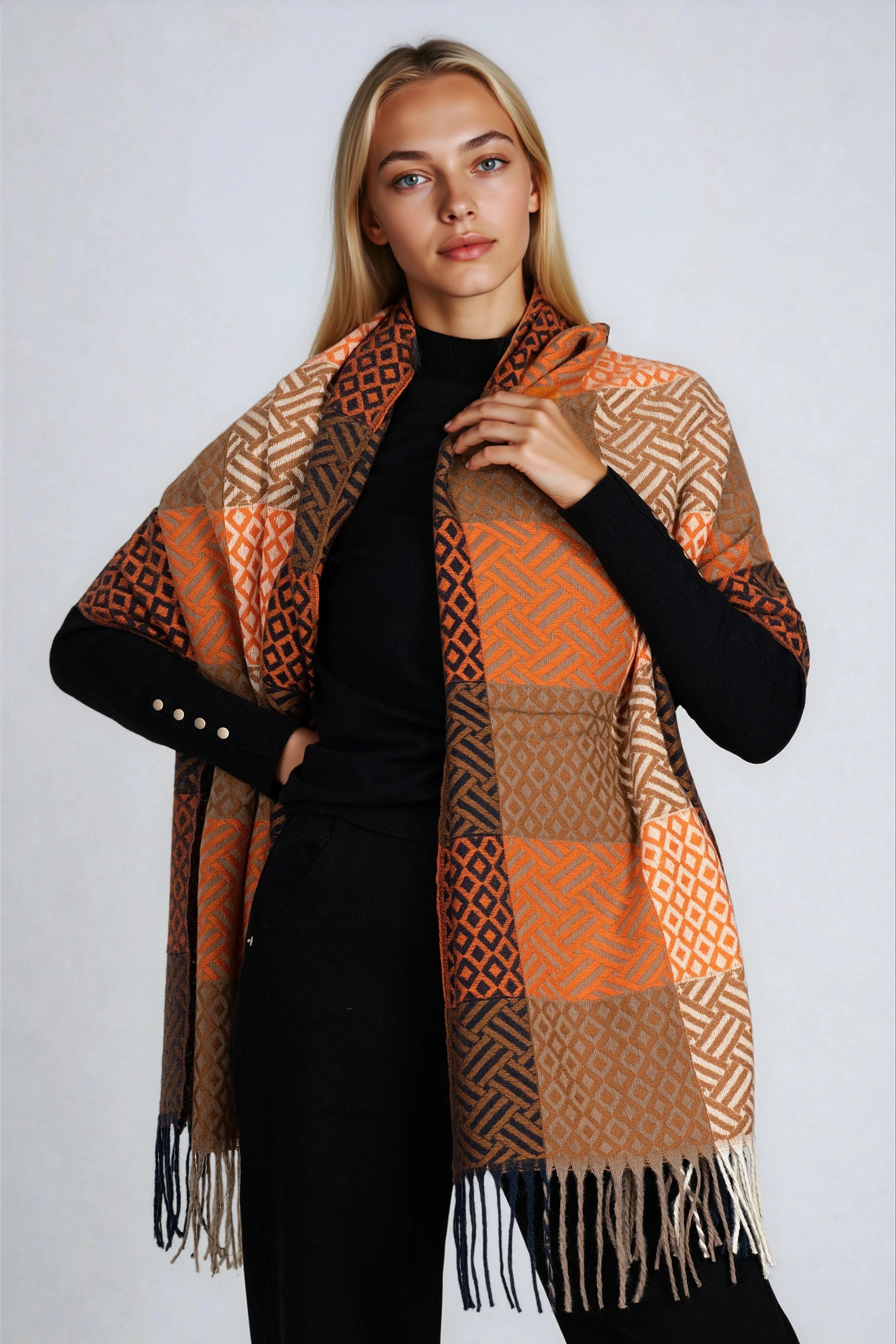 Дамски топъл шал с фигурален принт в кафяво и оранжево