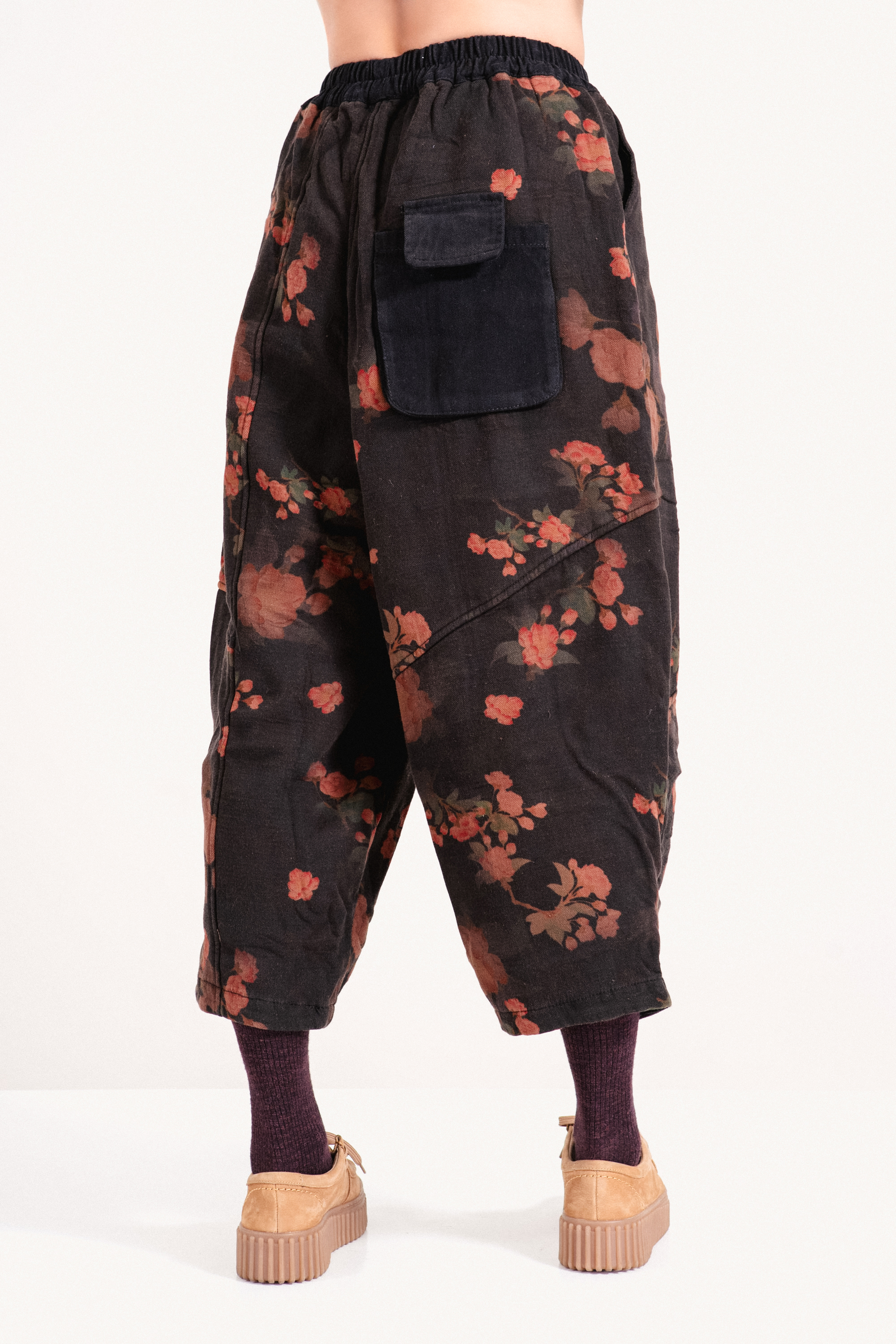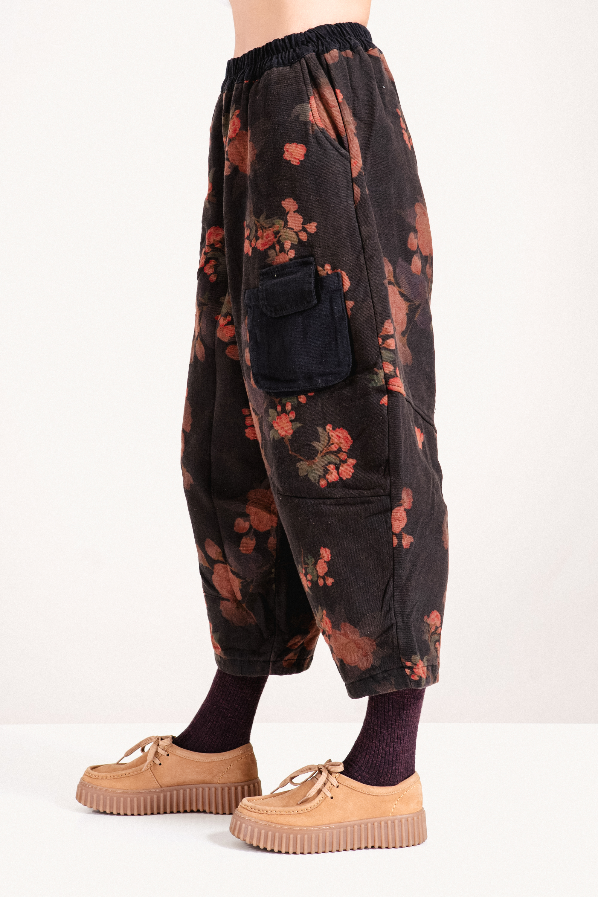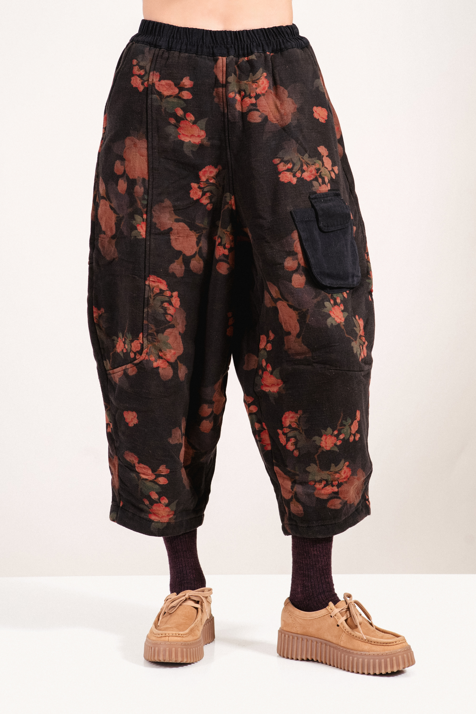 Дамски ватиран панталон в черно с широка кройка, флорален принт в топли тонове и джобове