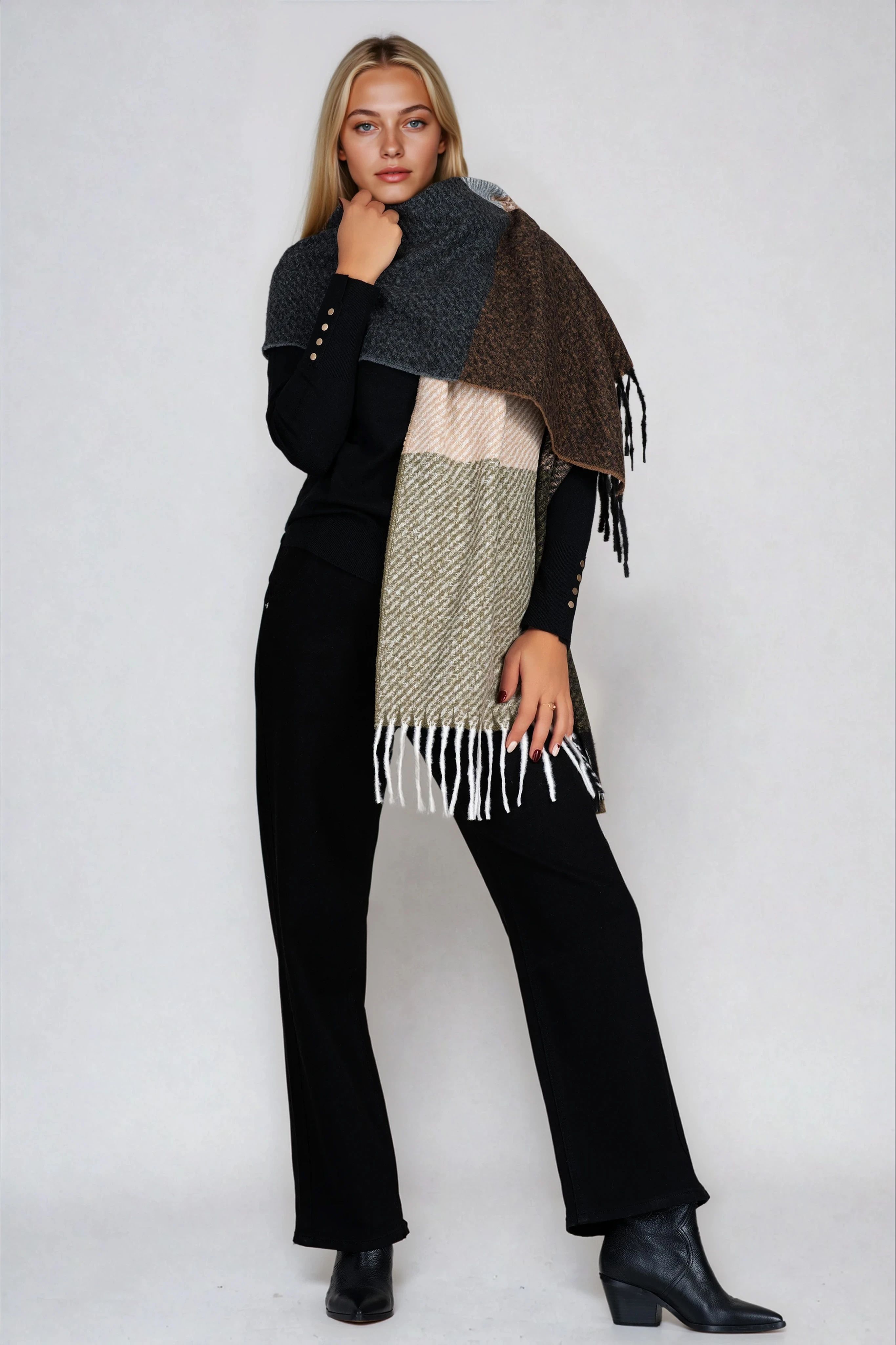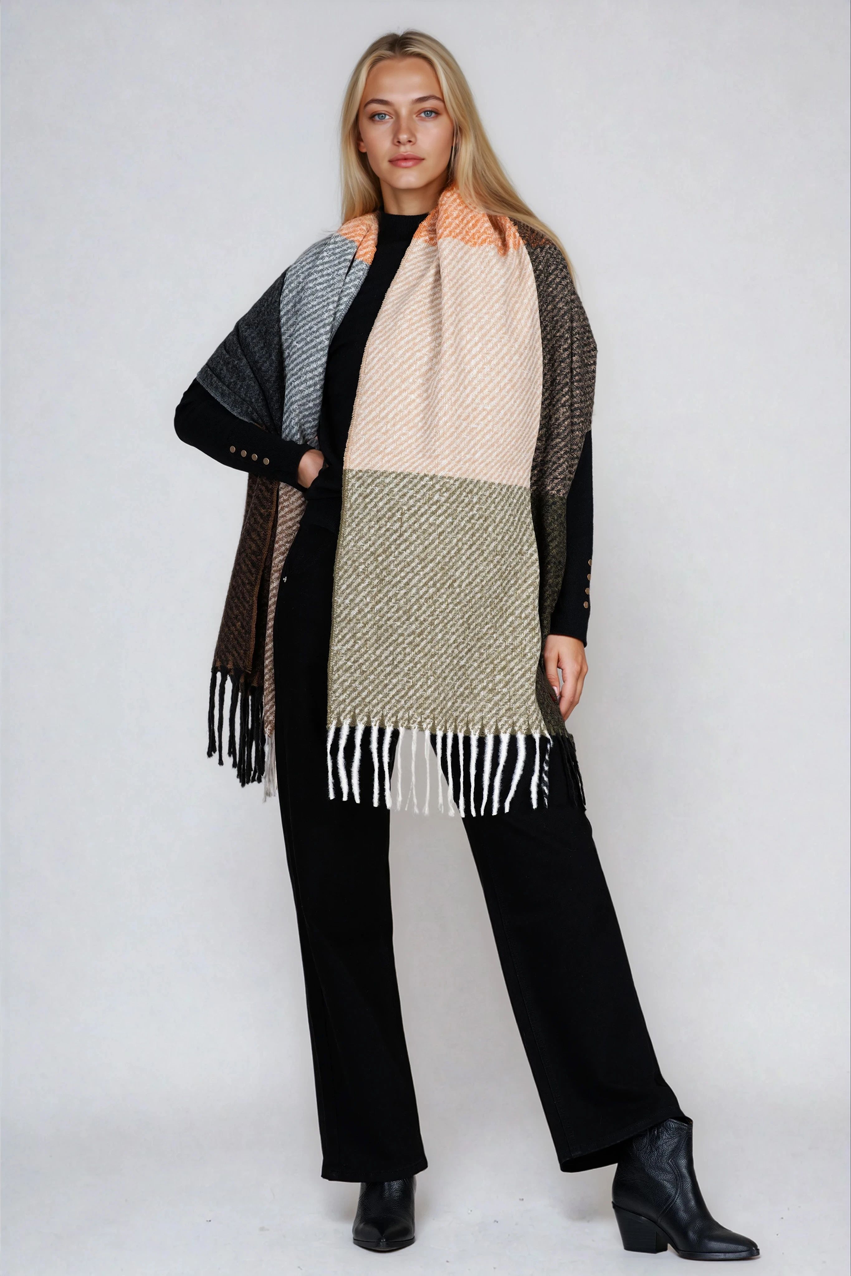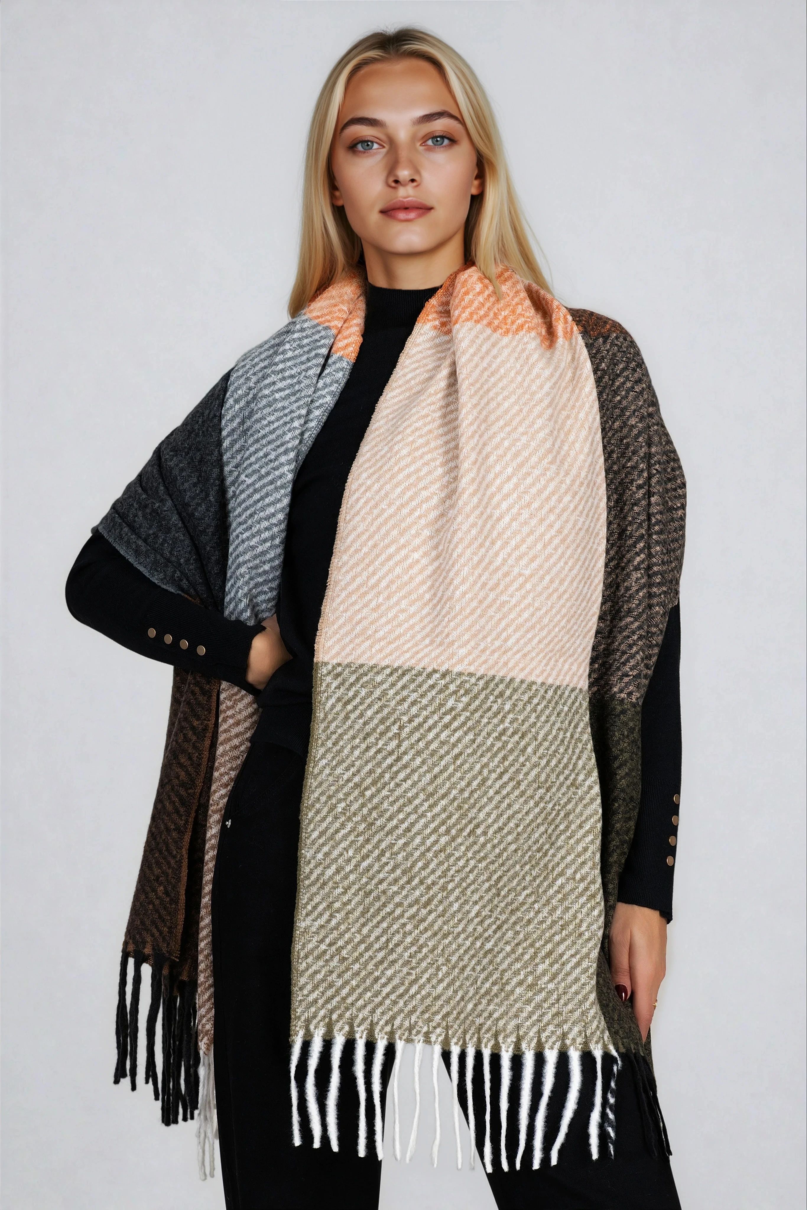 Дамски зимен шал с цветни правоъгълници в сиво,оранжево, бежово и кафяво