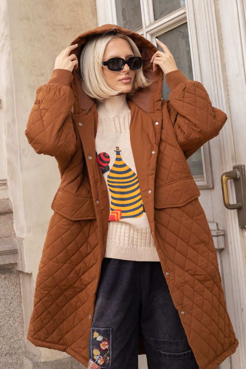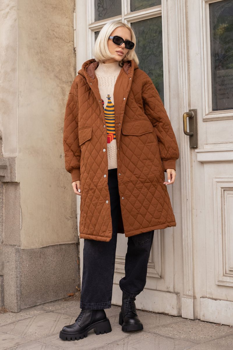 Дамско дълго капитонирано яке от памук в кафяво с качулка и джоб с капак