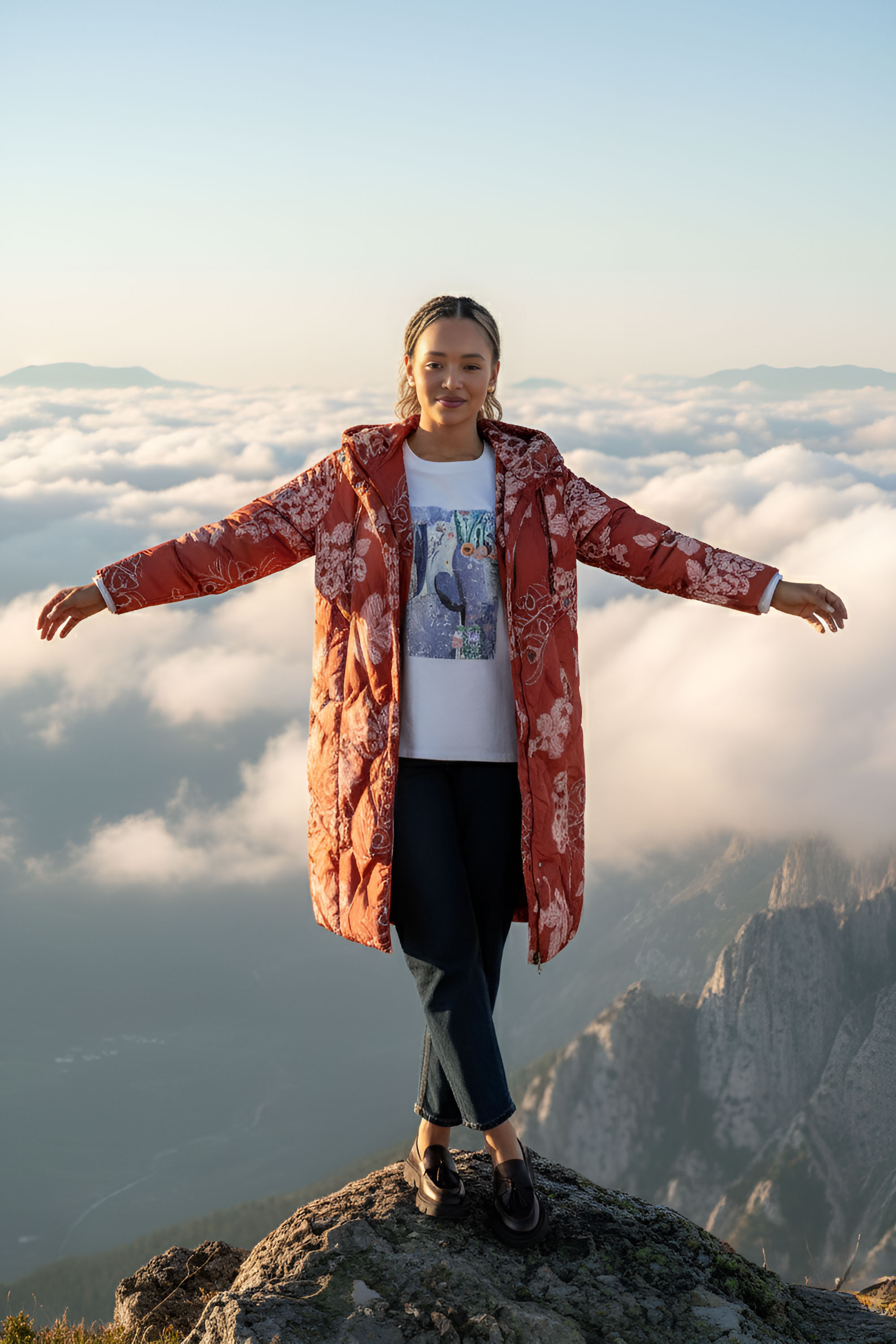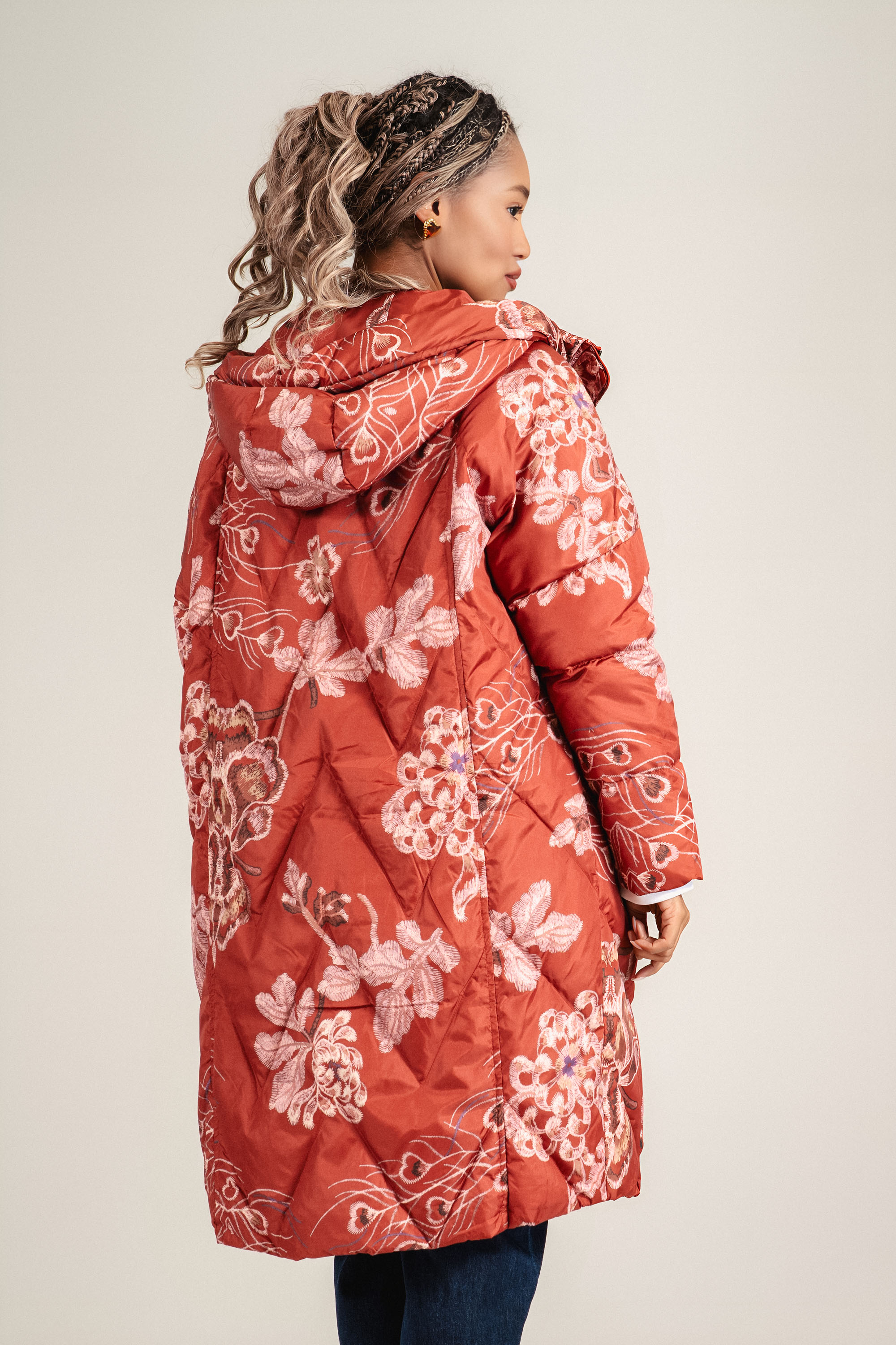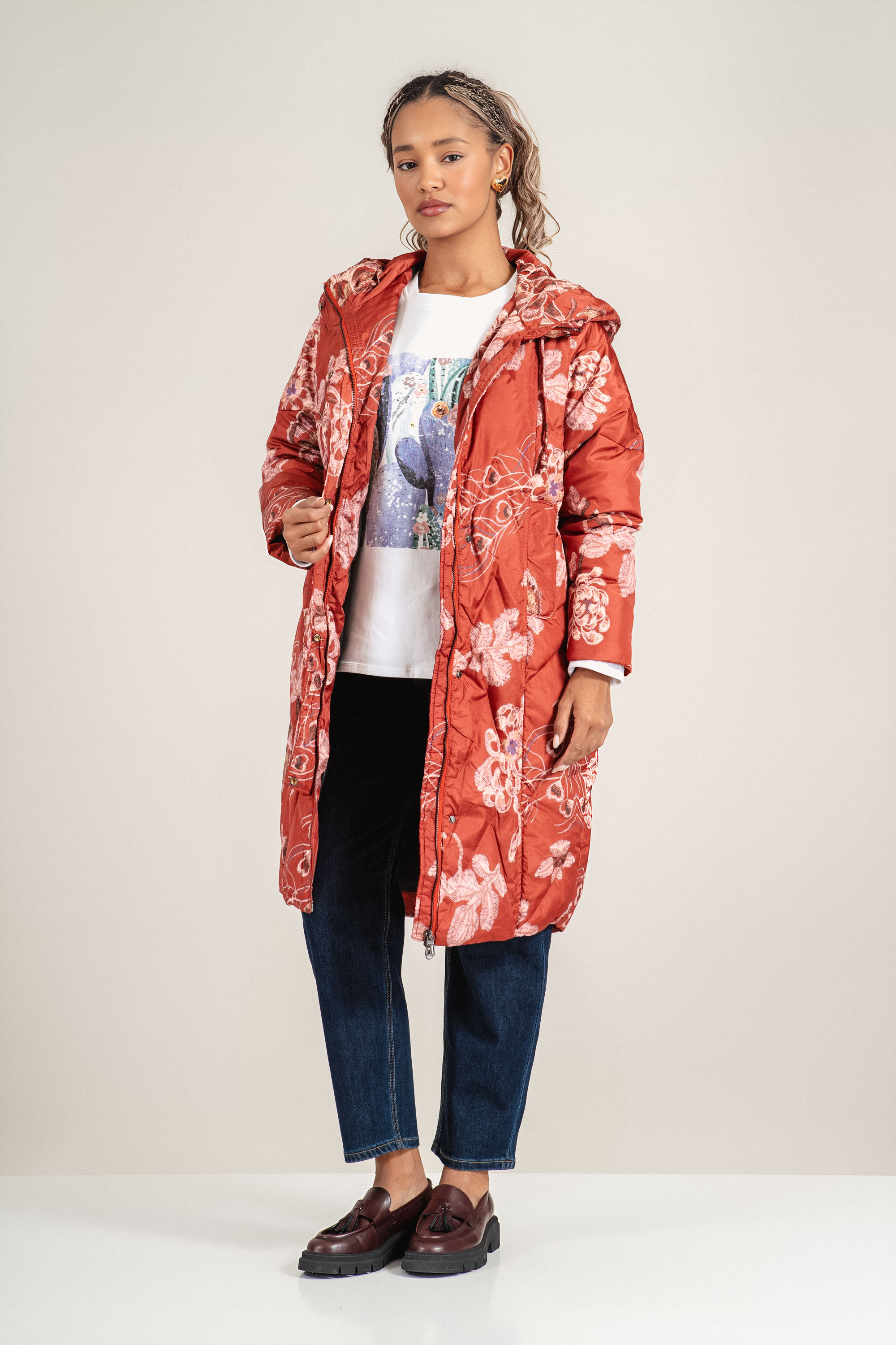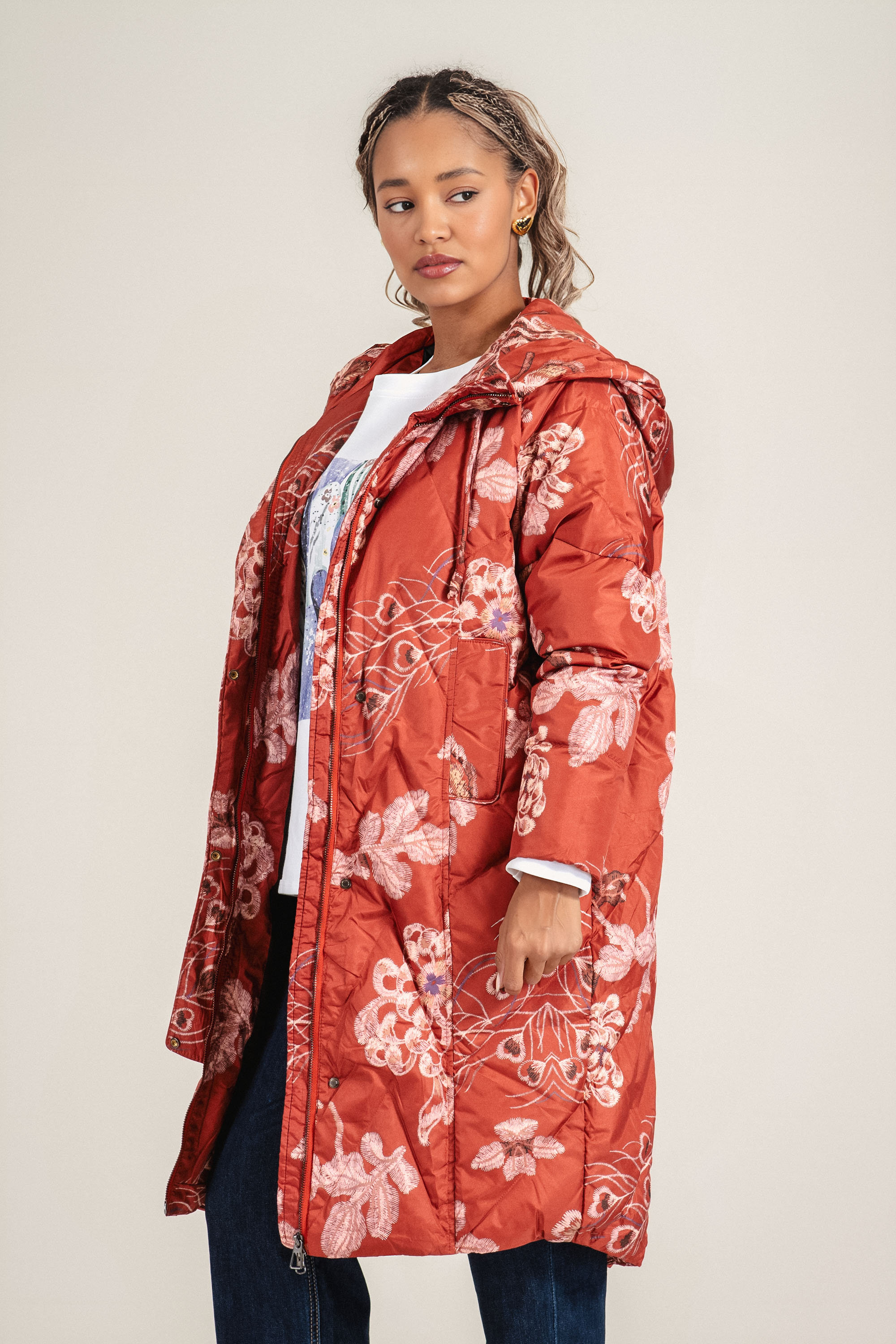 Топло дълго яке с ефектен флорален принт в розови тонове върху керемидено-оранжева основа. Моделът е с удобна качулка с връзки, закопчаване с цип и тик-так копчета за допълнителна защита от студ. Леката материя е устойчива на вятър и създава комфорт при движение. Подходящо за есенно-зимния сезон и ежедневни визии с дънки или панталон.