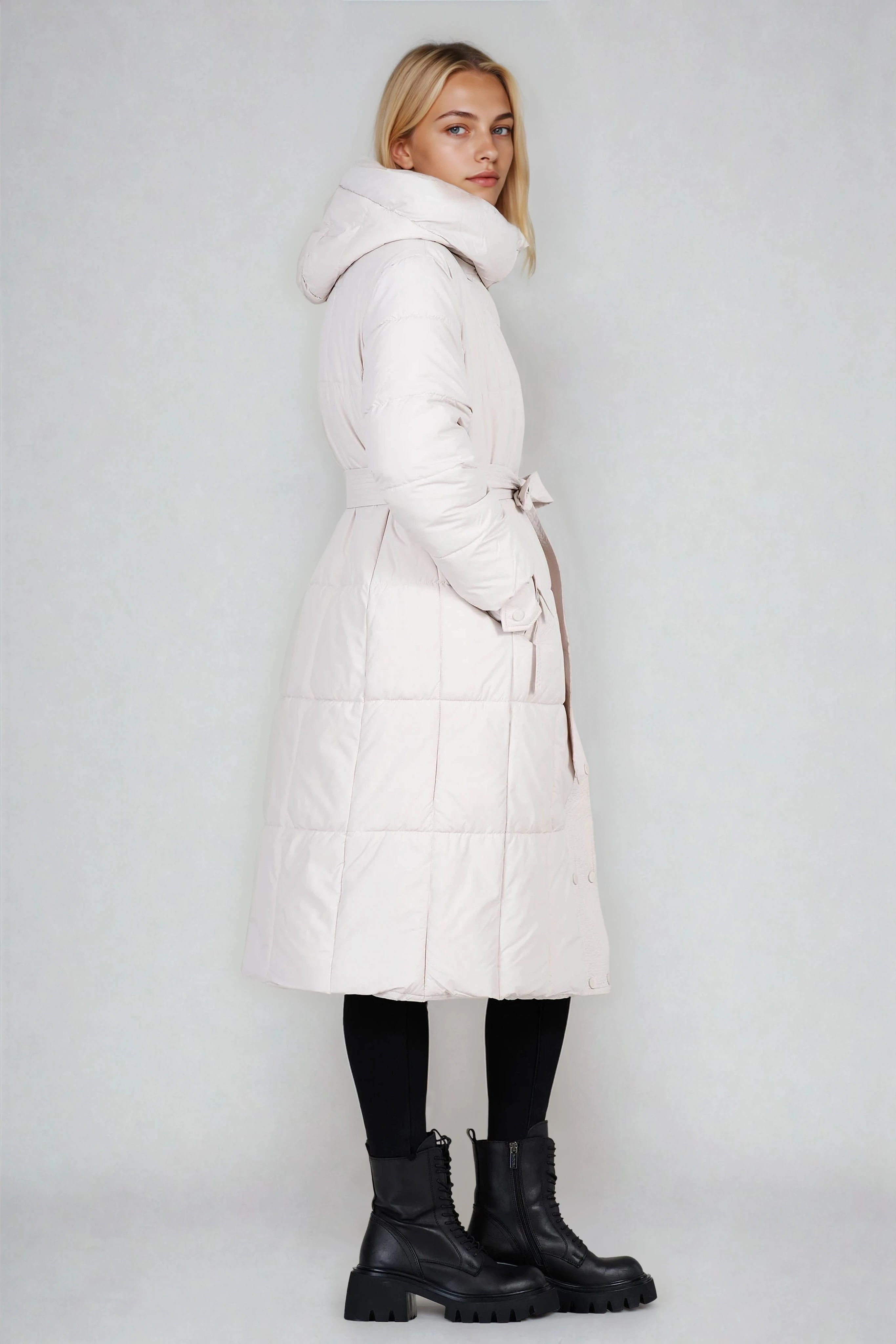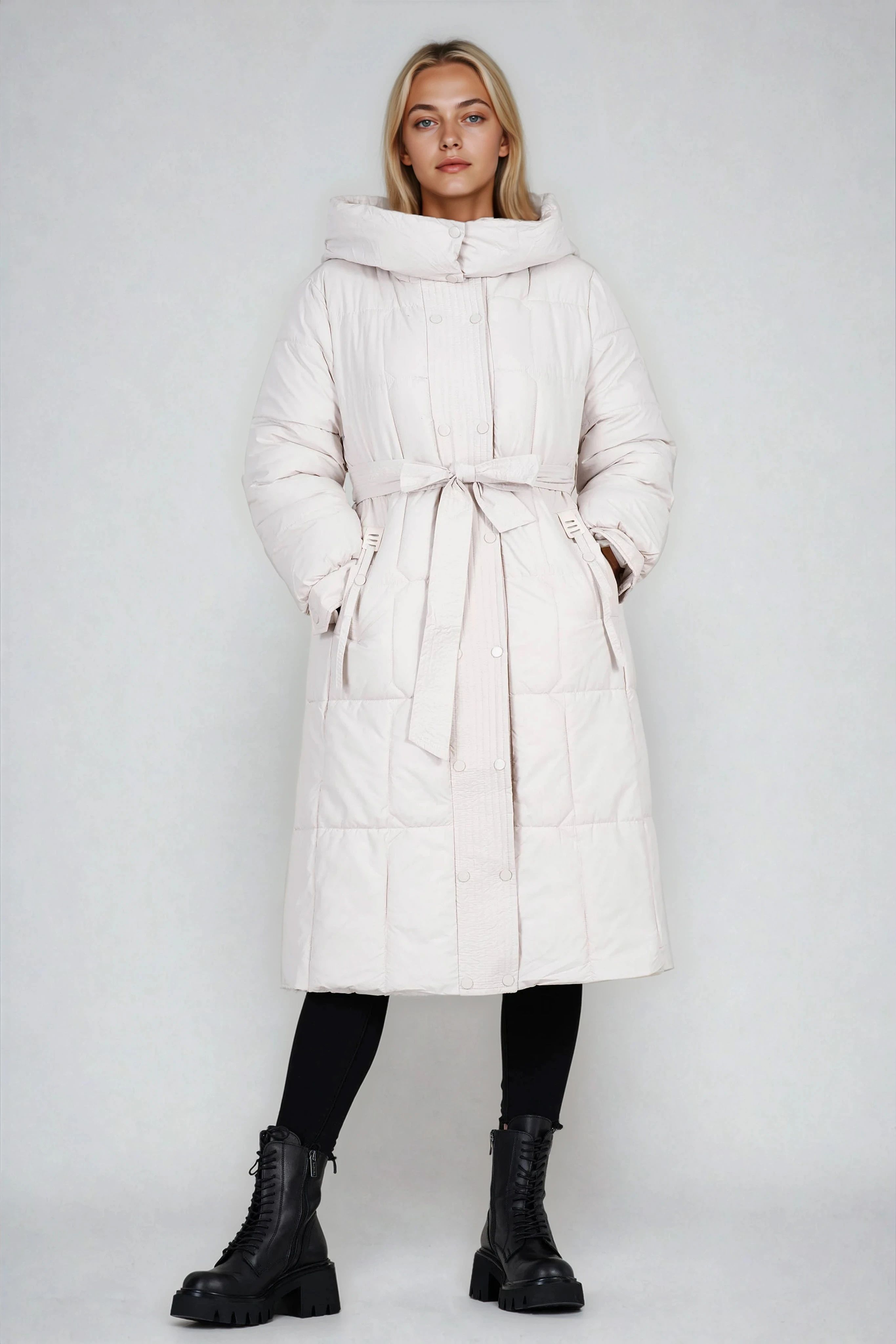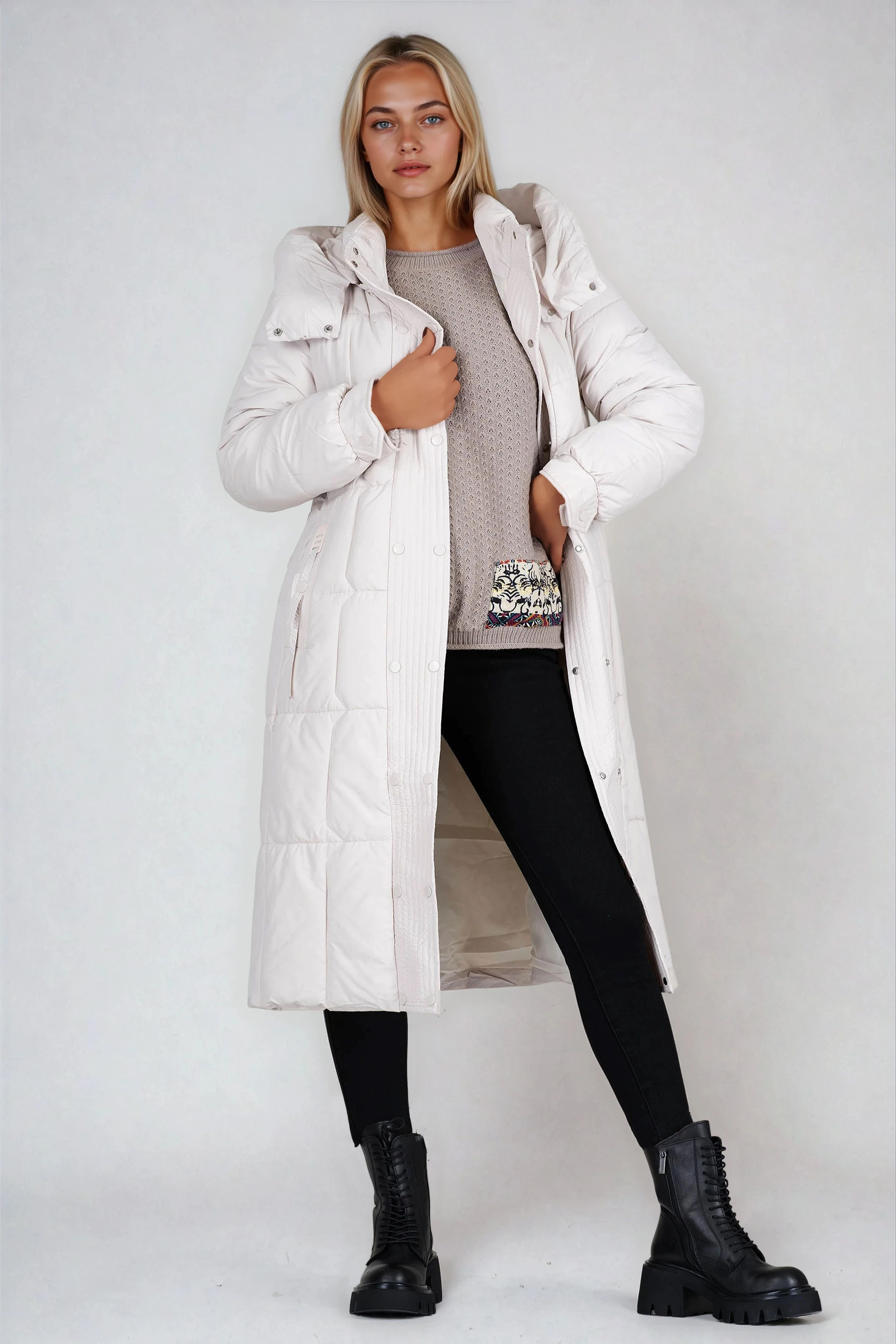 Елегантно зимно яке в светлобежов тон, създадено за комфорт и защита от студа. Капитонираната структура и качулката осигуряват топлина, а кожените капачета на джобовете придават стилен акцент. Благодарение на двойното закопчаване и оформящия колан, моделът е отличен избор за ежедневна визия с елегантен завършек.