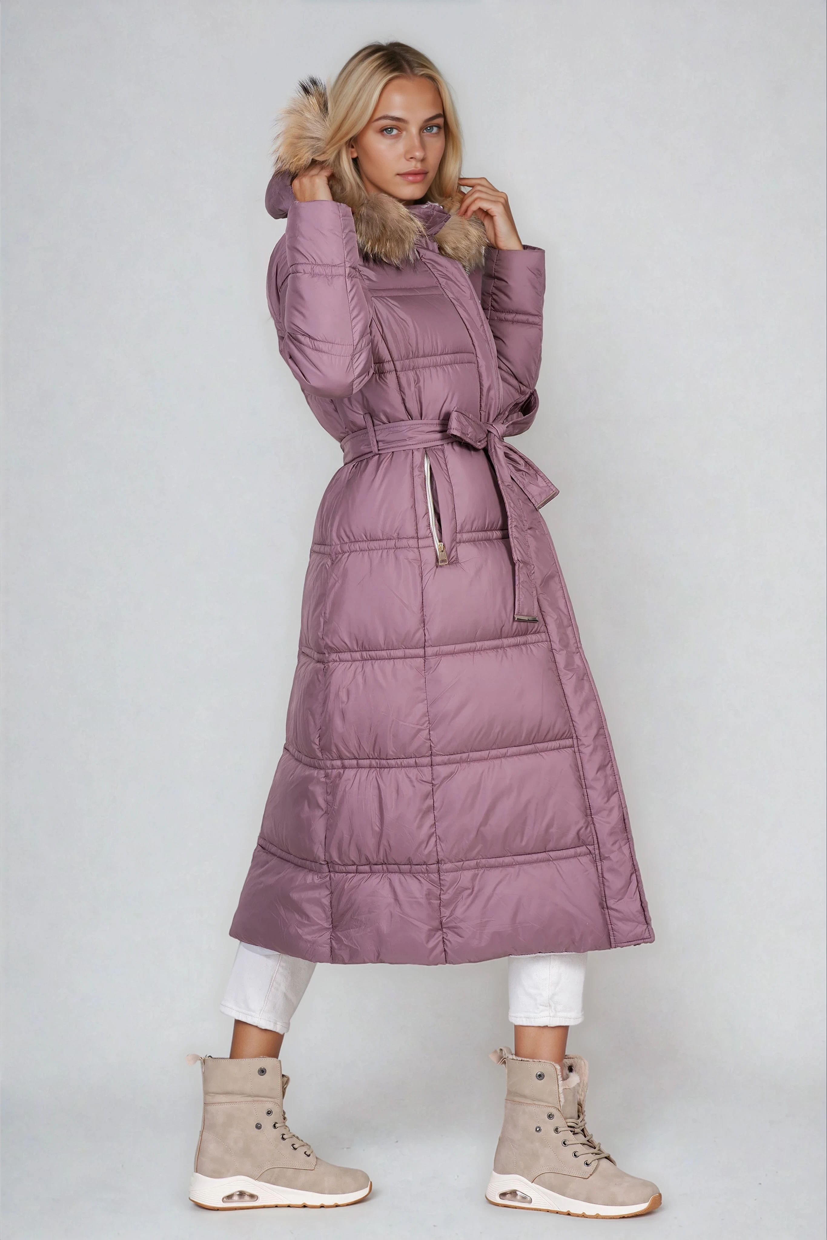 Дамско дълго зимно яке в лилаво с колан на талията и качулка с пух