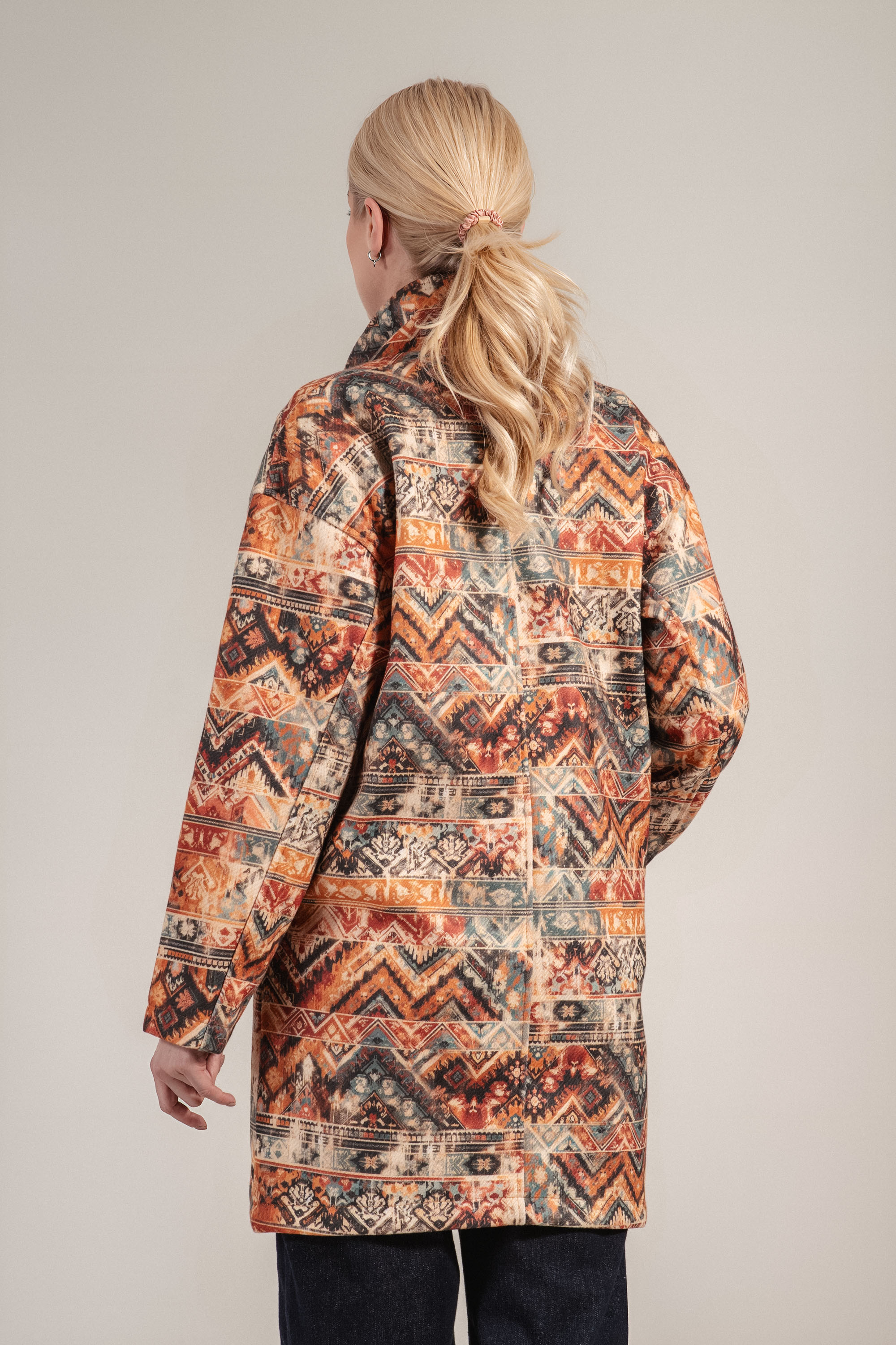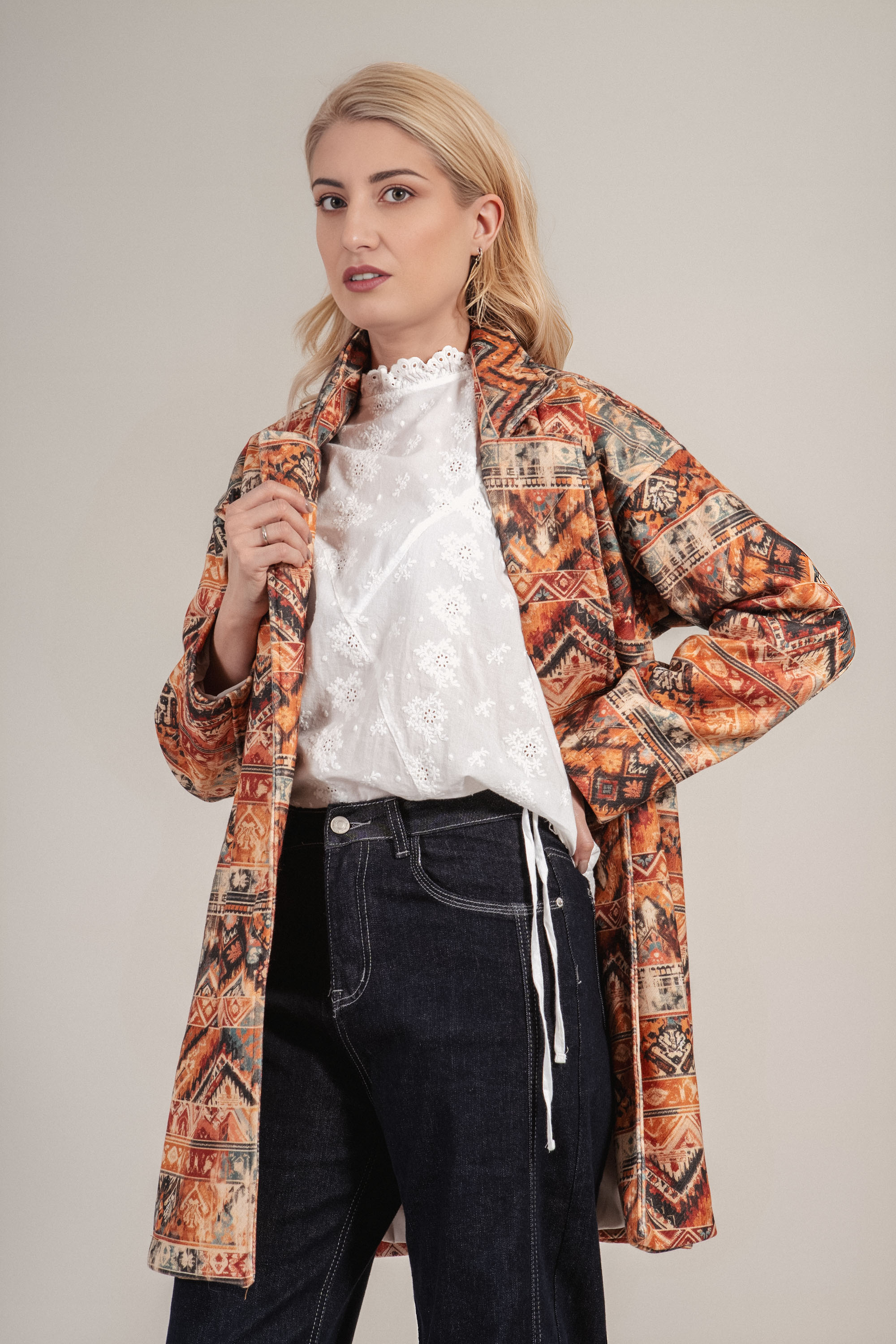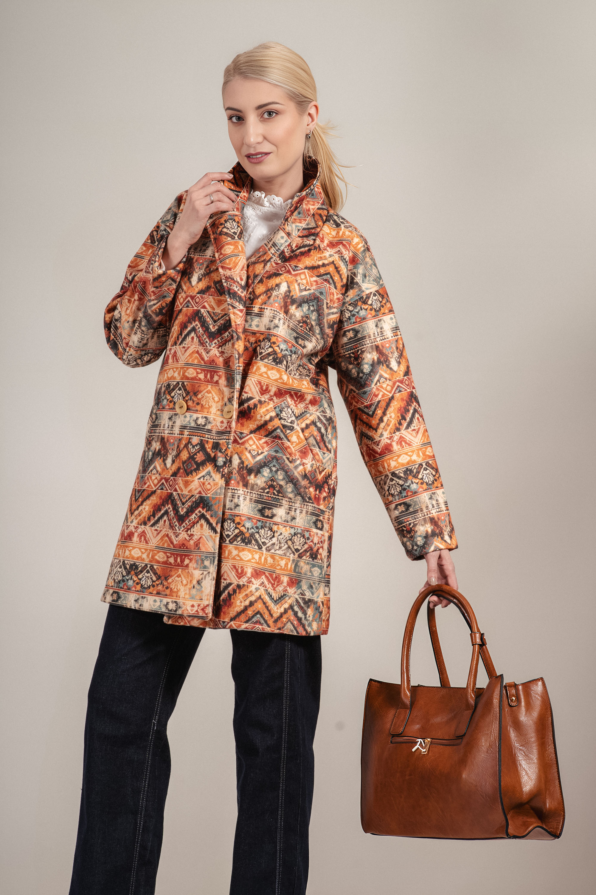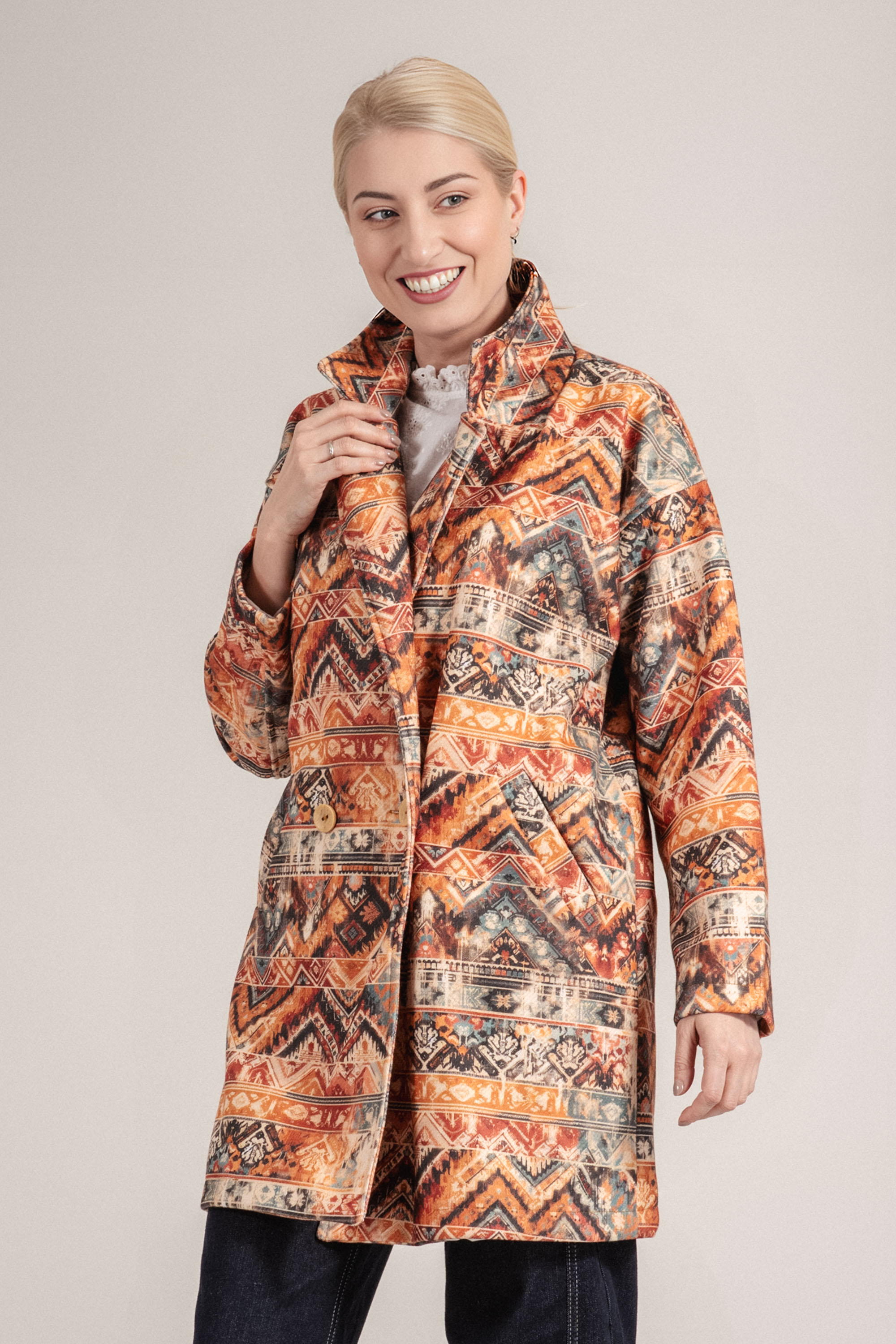 Това палто изпъква с богат етно принт в топли оранжеви и жълти нюанси. Материята е устойчива и с приятна структура, а кройката – леко свободна и комфортна. Този модел добавя артистично излъчване към визията и се комбинира отлично с изчистени цветове.