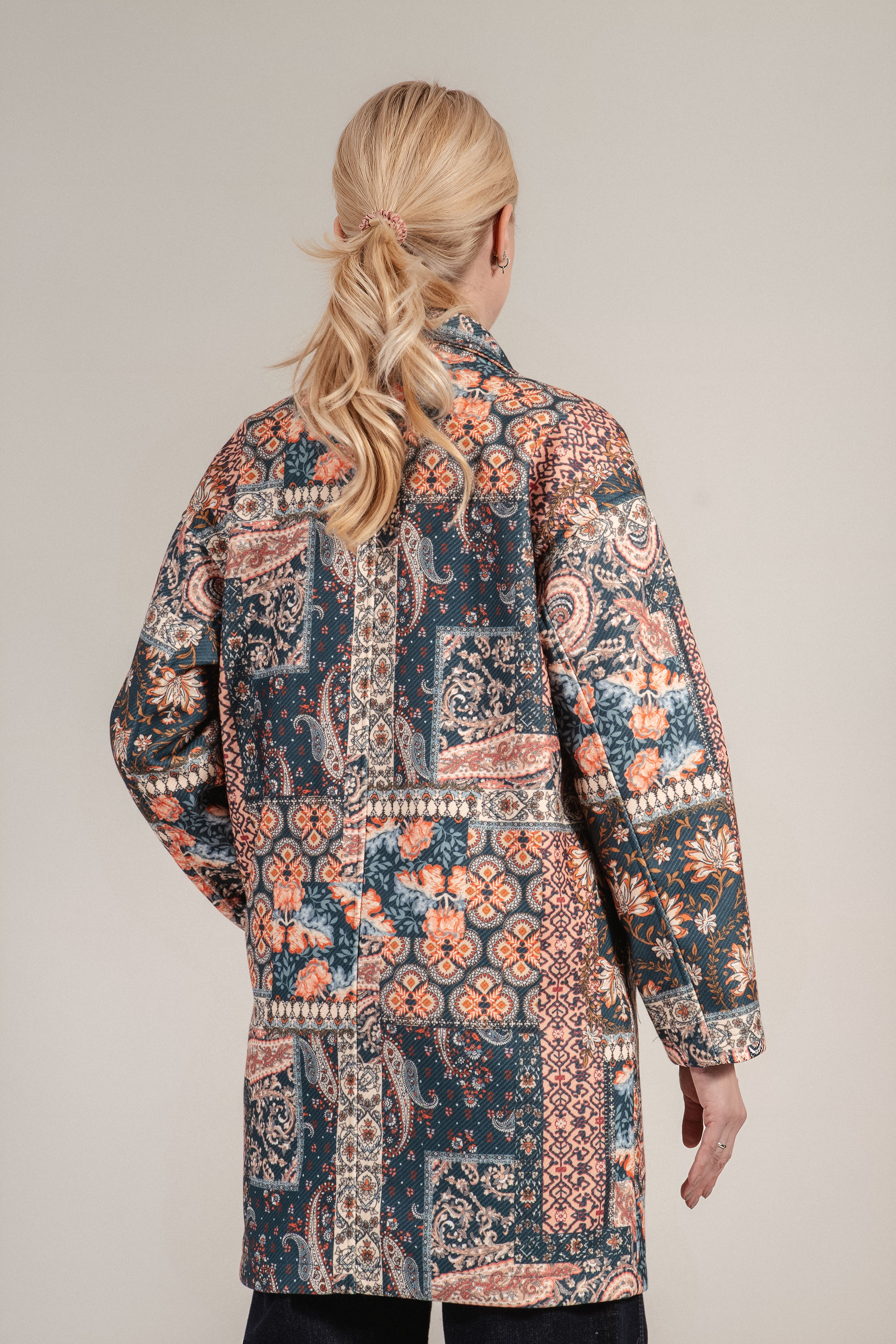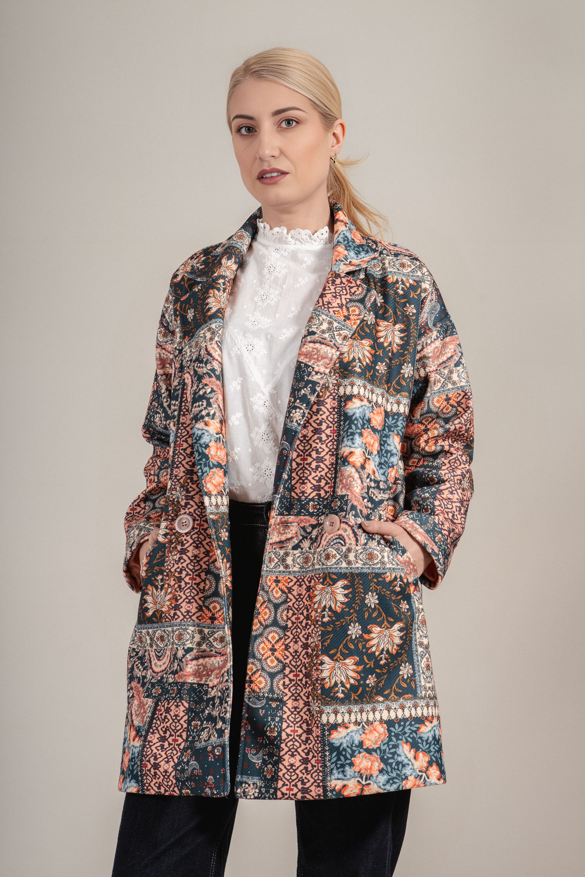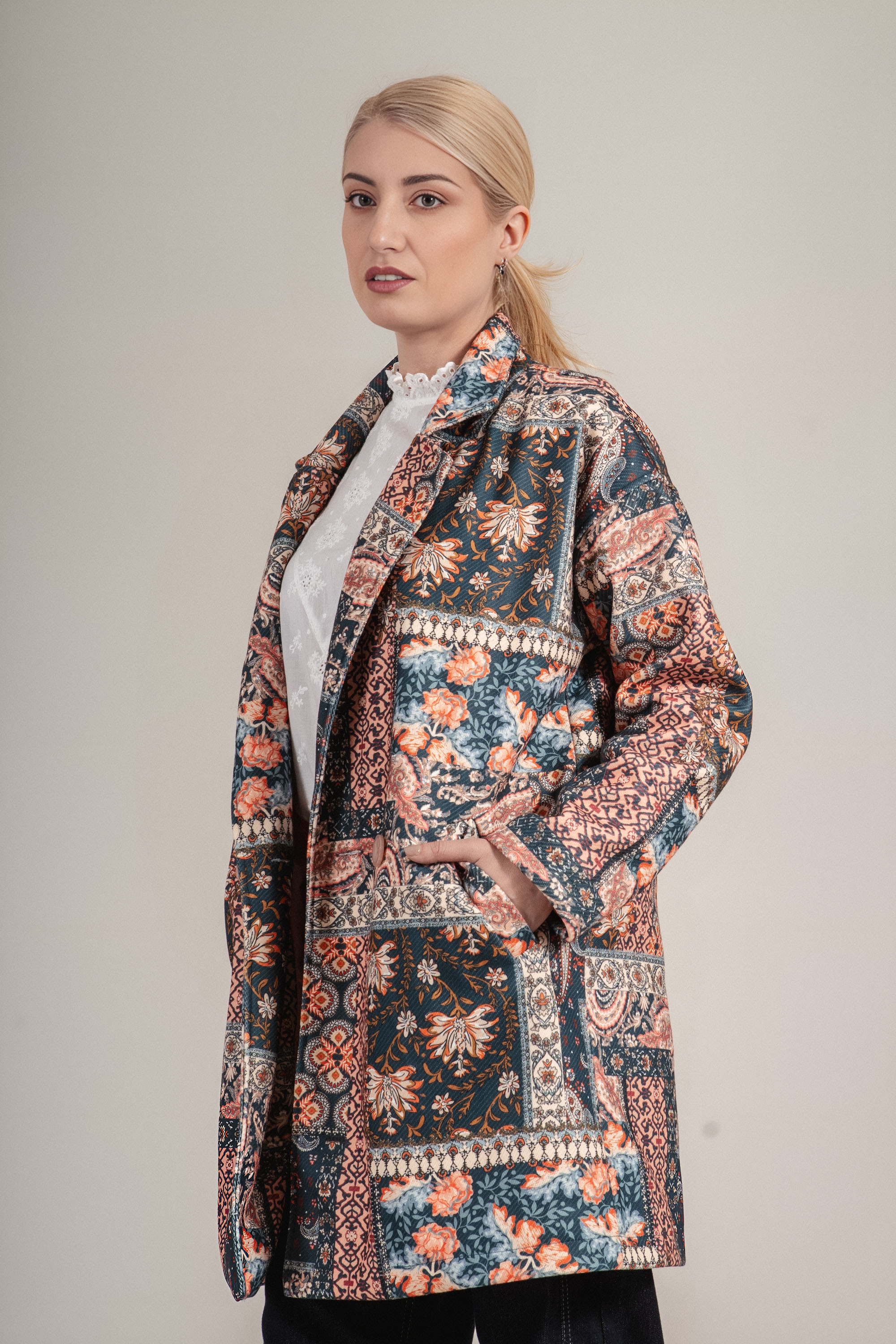 Това палто в петролено зелено изпъква с богат етно принт в топли оранжеви и кремави нюанси. Материята е устойчива и с приятна структура, а кройката – леко свободна и комфортна. Този модел добавя артистично излъчване към визията и се комбинира отлично с изчистени цветове.