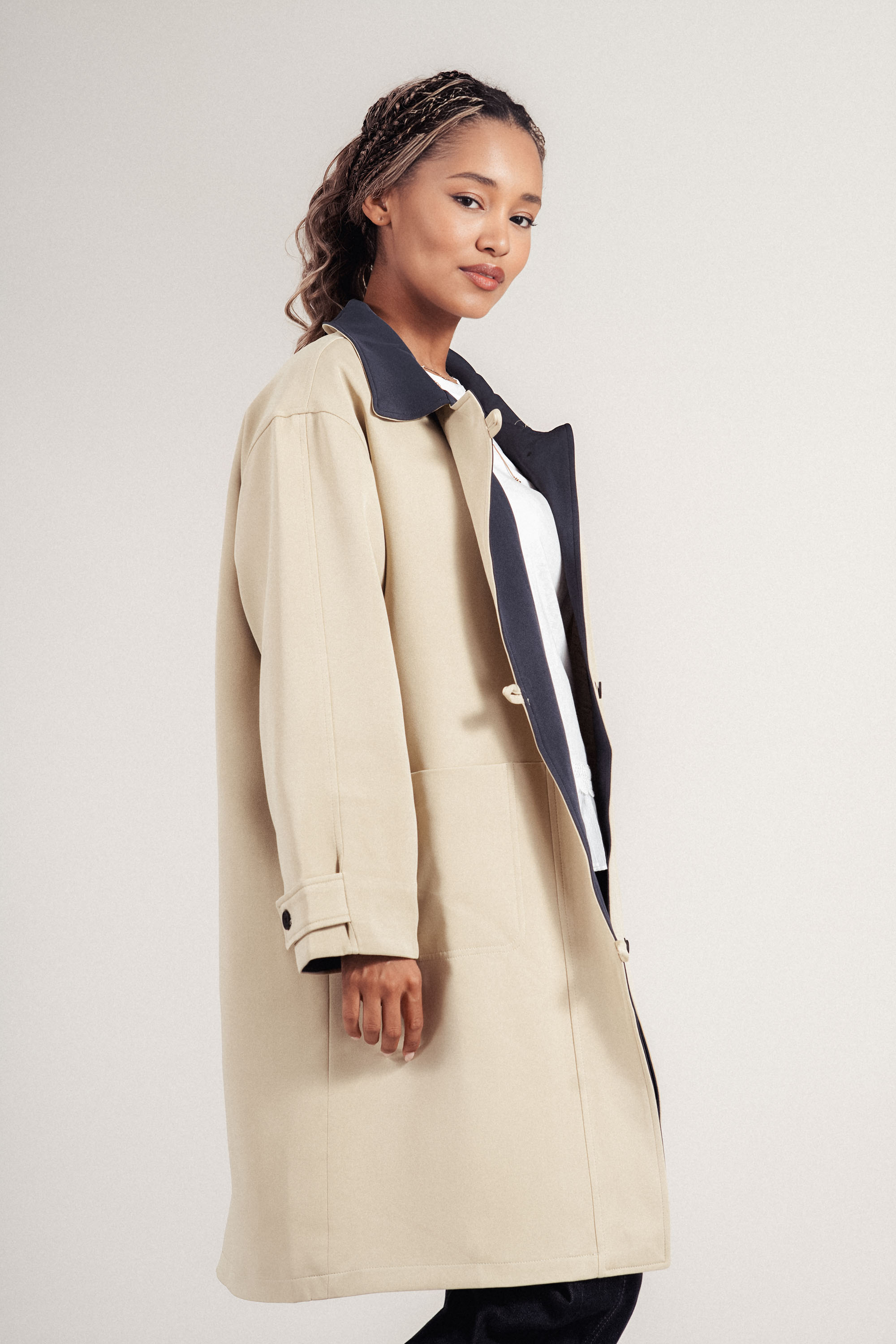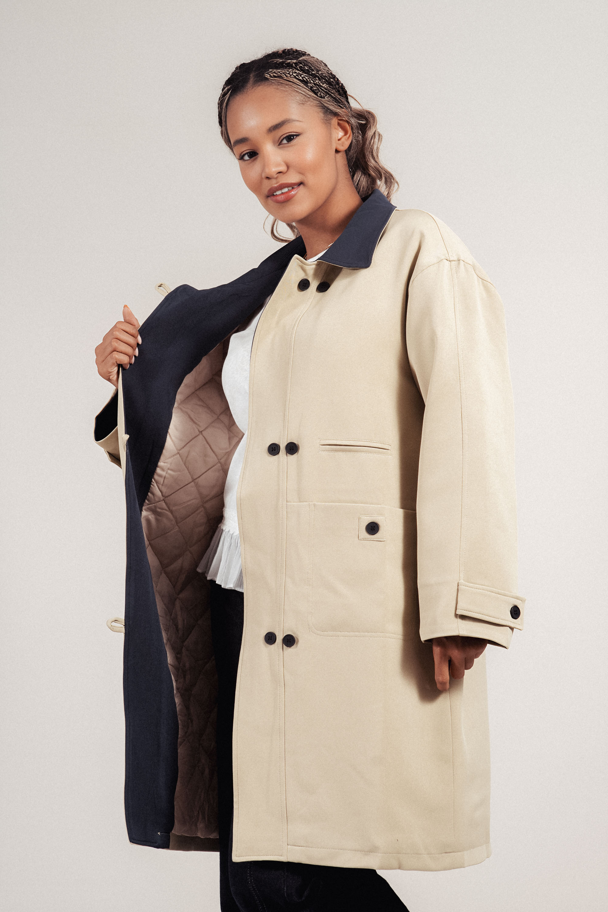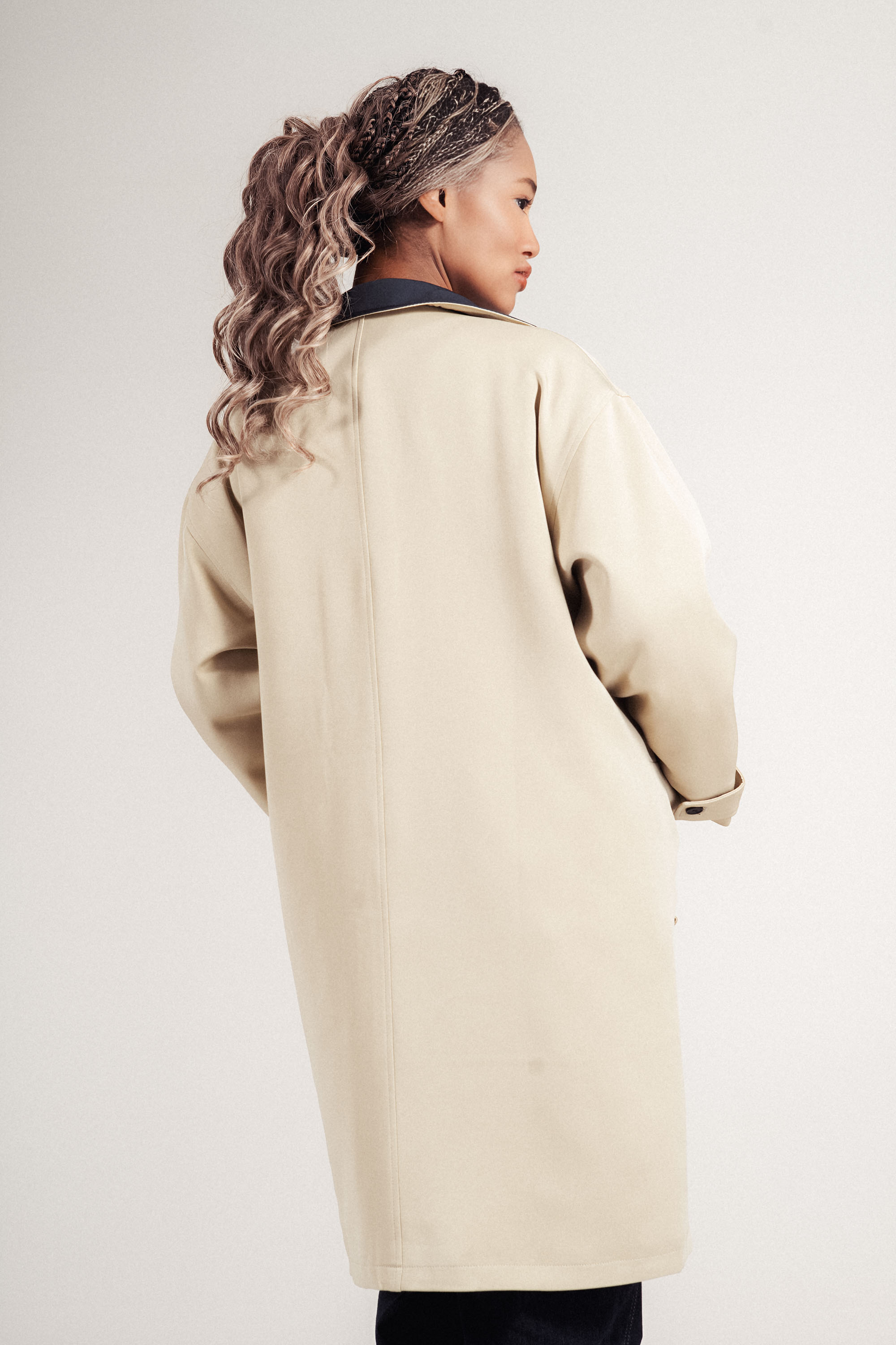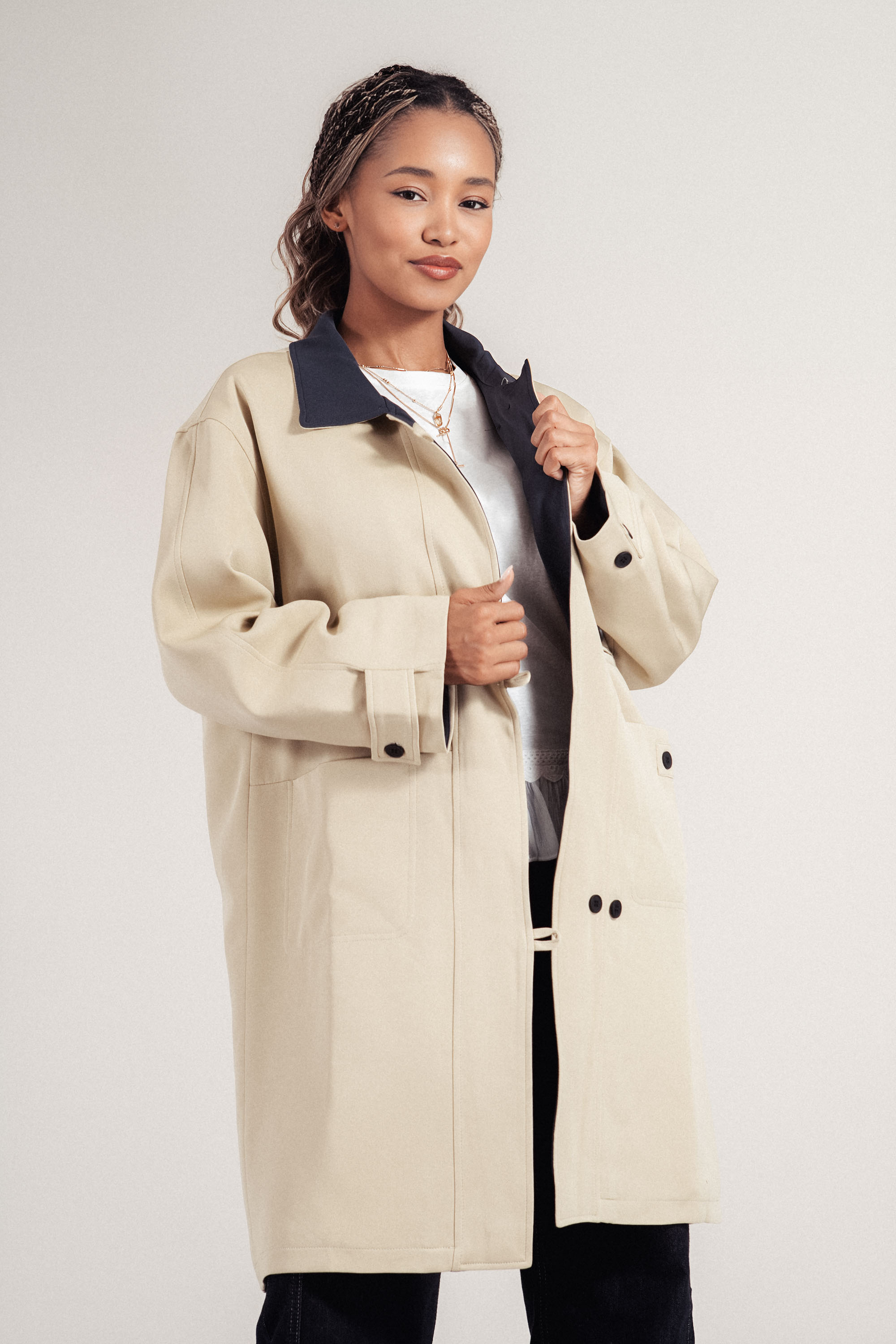 Модерен прочит на класическо яке, изработено от лека материя, подходяща за преходните сезони. Контрастната яка и ревер в тъмносиньо създават отличителна визия. Двуредовото закопчаване с черни копчета и джобовете добавят елегантен акцент. Комфортно и стилно допълнение към градската визия.