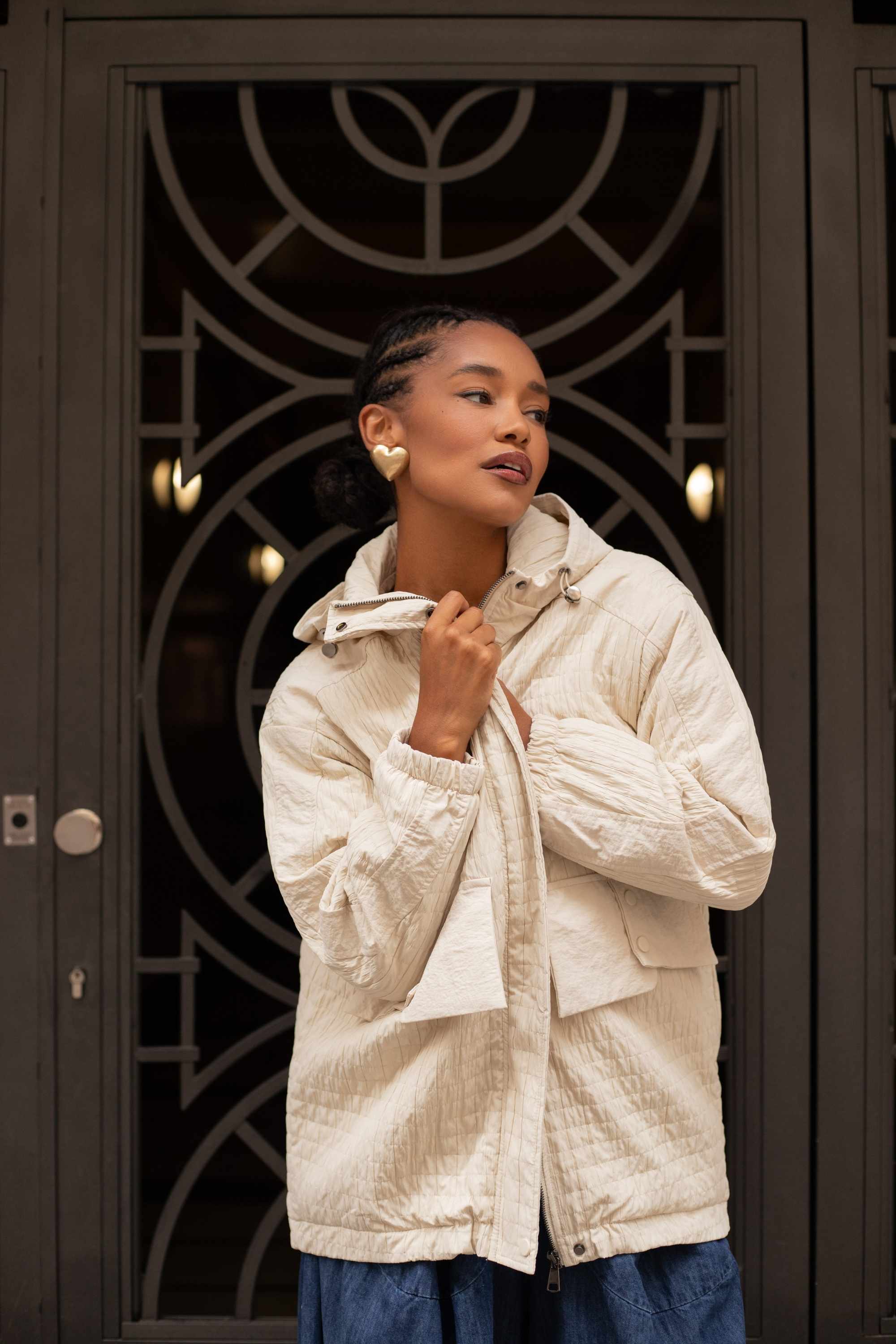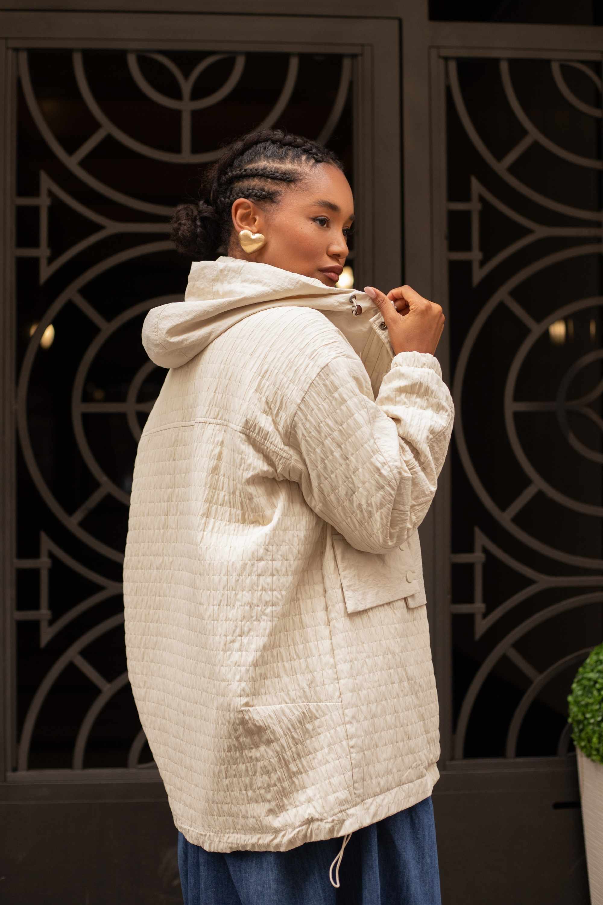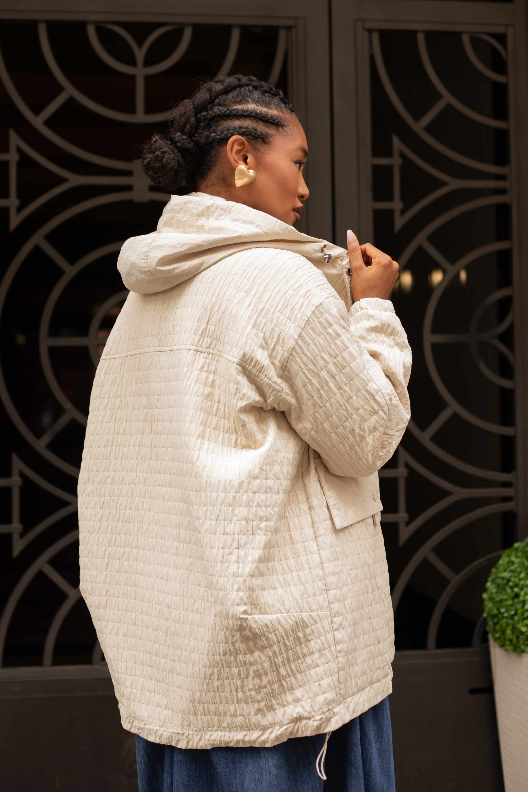 Леко, удобно и лесно за съчетаване, това пролетно яке комбинира функционалност и семпла елегантност. Капитонираната текстура и джобовете с капаци придават завършен вид, а практичната качулка го прави идеално за преходно време. Подходящо за носене с дънки, рокли или спортно-елегантен панталон.