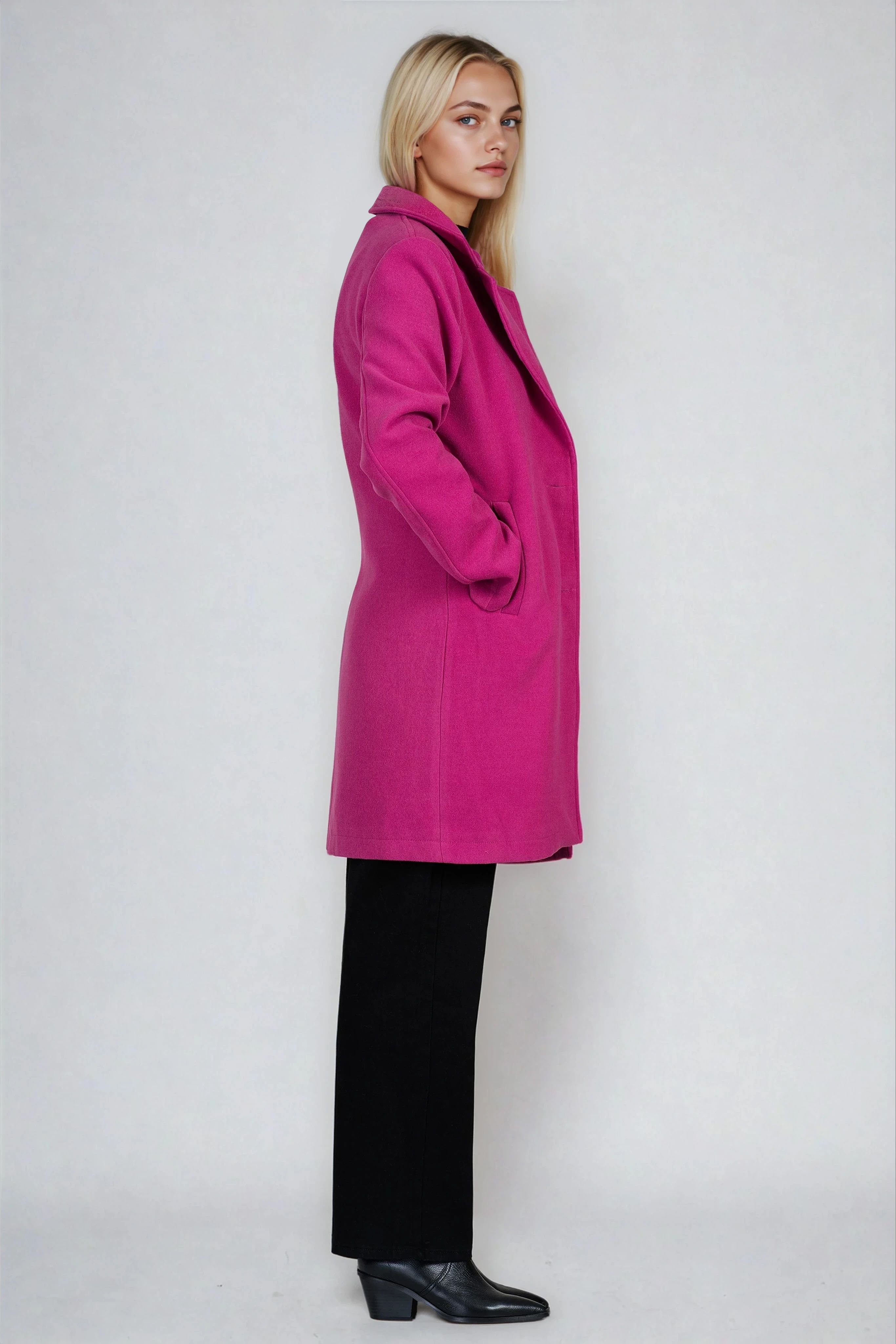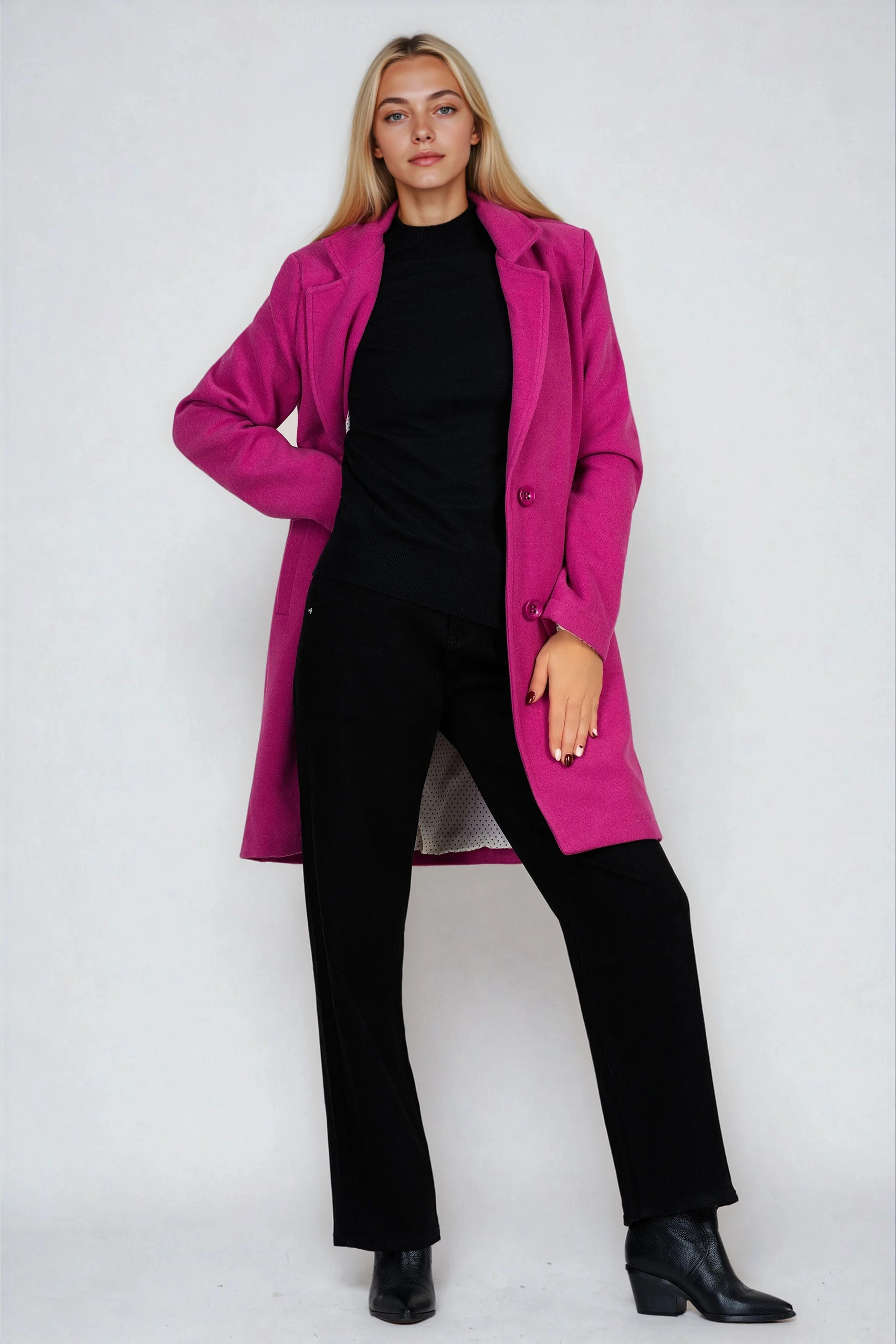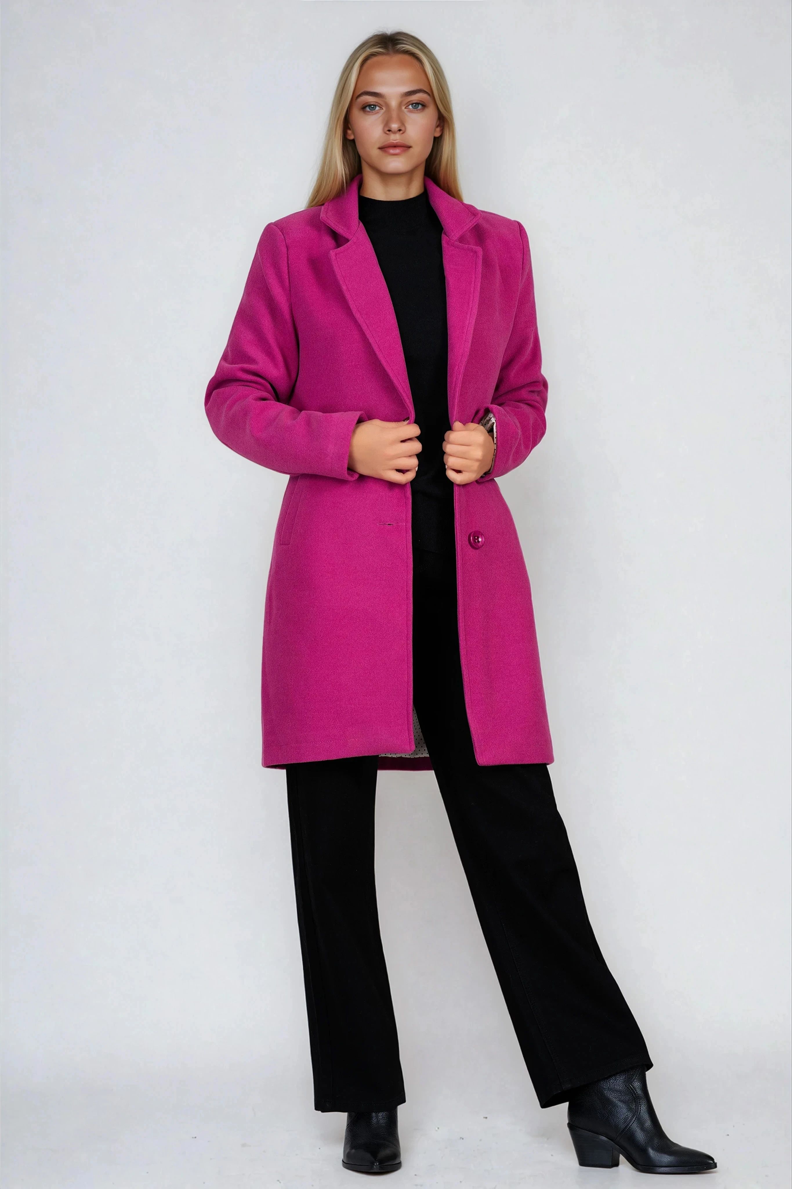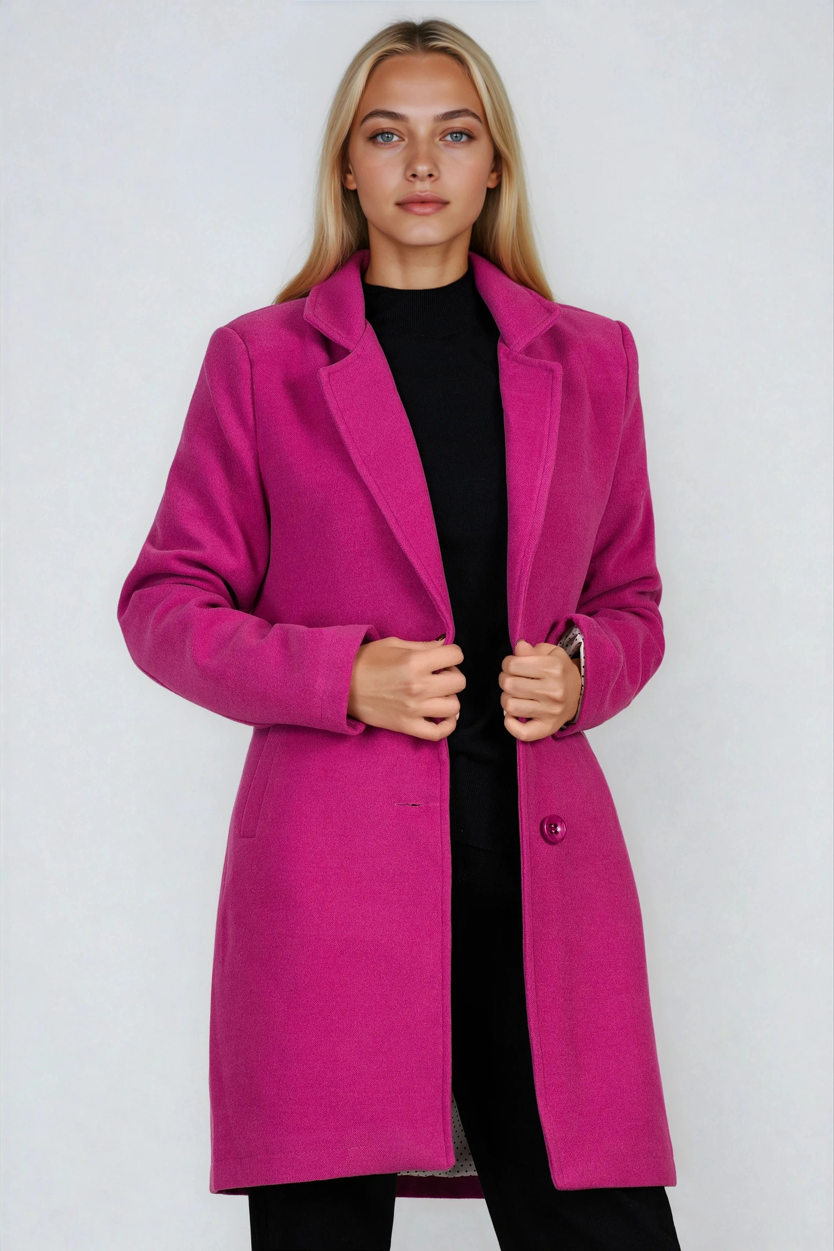 Елегантно и практично палто в цикламен нюанс, изработено от качествена вълнена смес. Вталената кройка подчертава силуета, докато класическите ревери и закопчаването с две копчета осигуряват стил и комфорт. Моделът е подходящ за есенно-зимния сезон и лесно се комбинира с делови и ежедневни визии. Произведено в България.