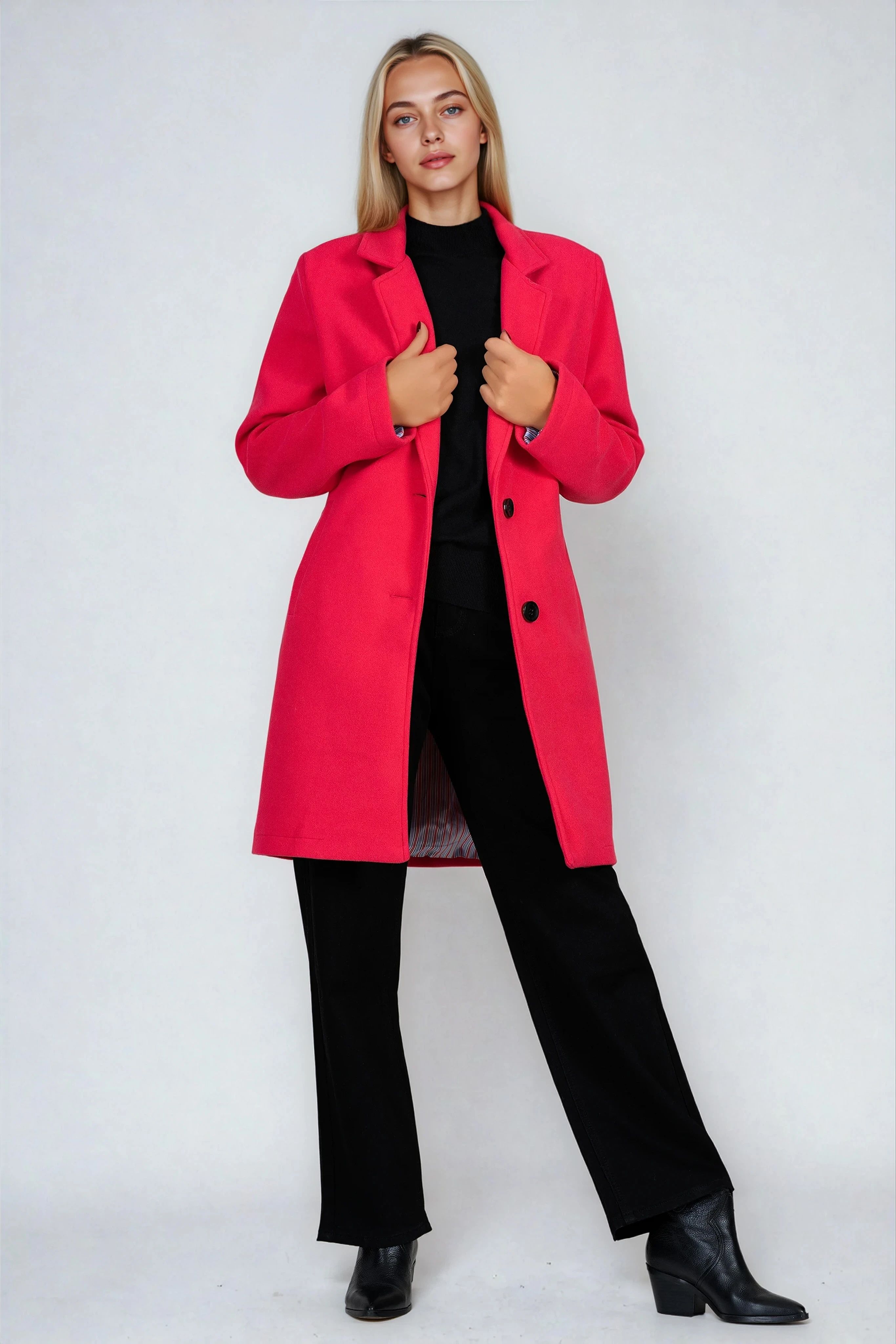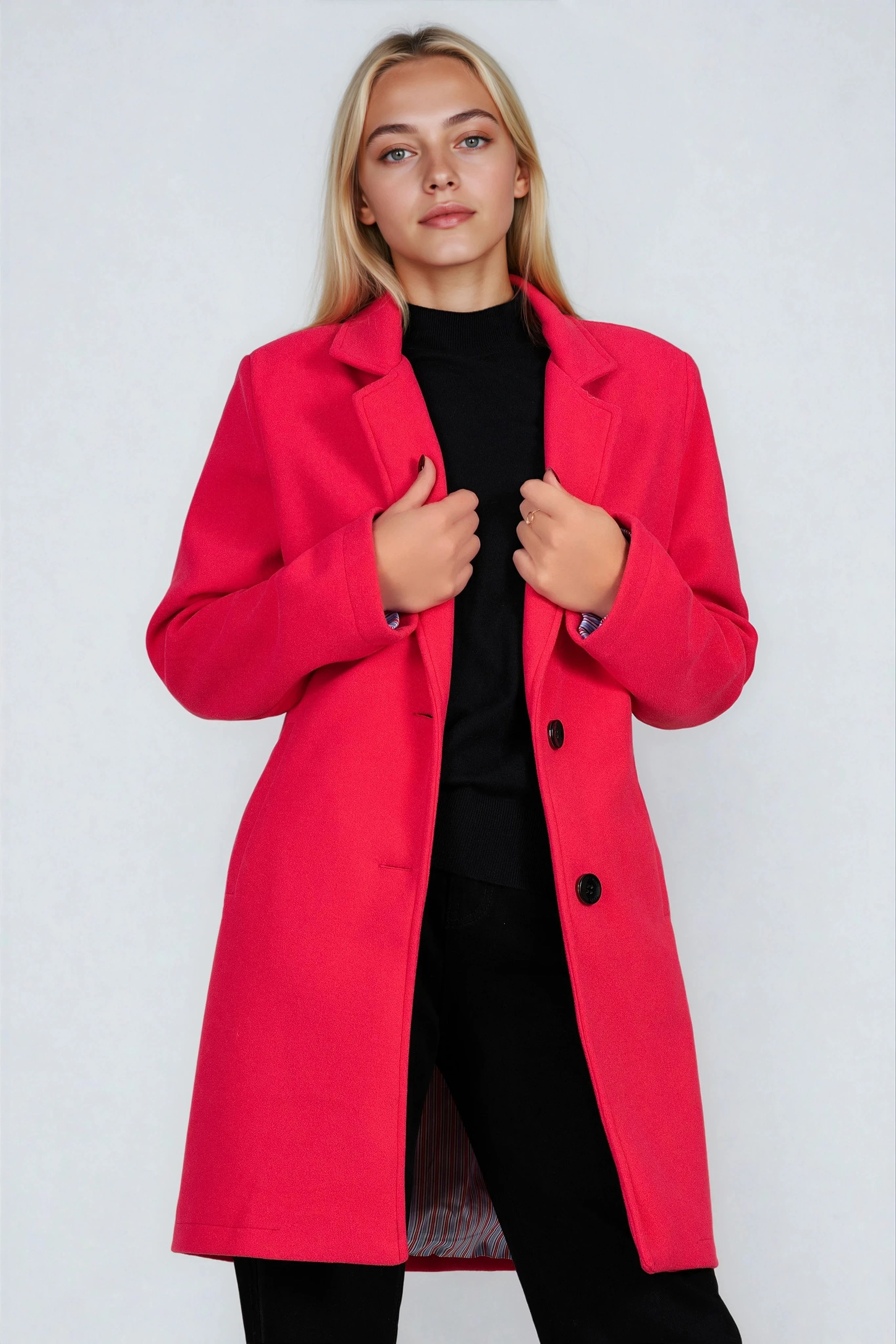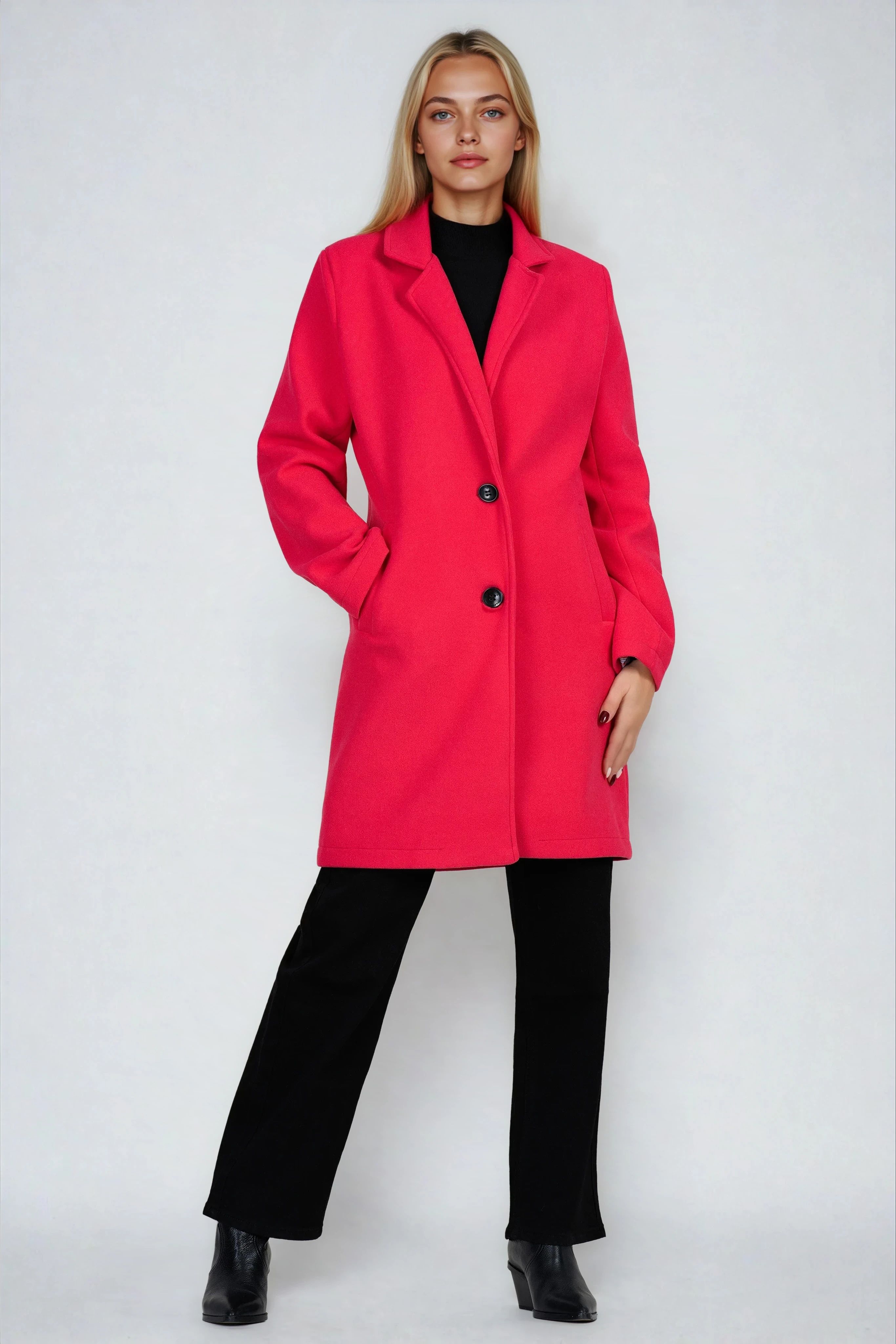 Елегантно и практично палто в коралов нюанс, изработено от качествена вълнена смес. Вталената кройка подчертава силуета, докато класическите ревери и закопчаването с две копчета осигуряват стил и комфорт. Моделът е подходящ за есенно-зимния сезон и лесно се комбинира с делови и ежедневни визии. Произведено в България.