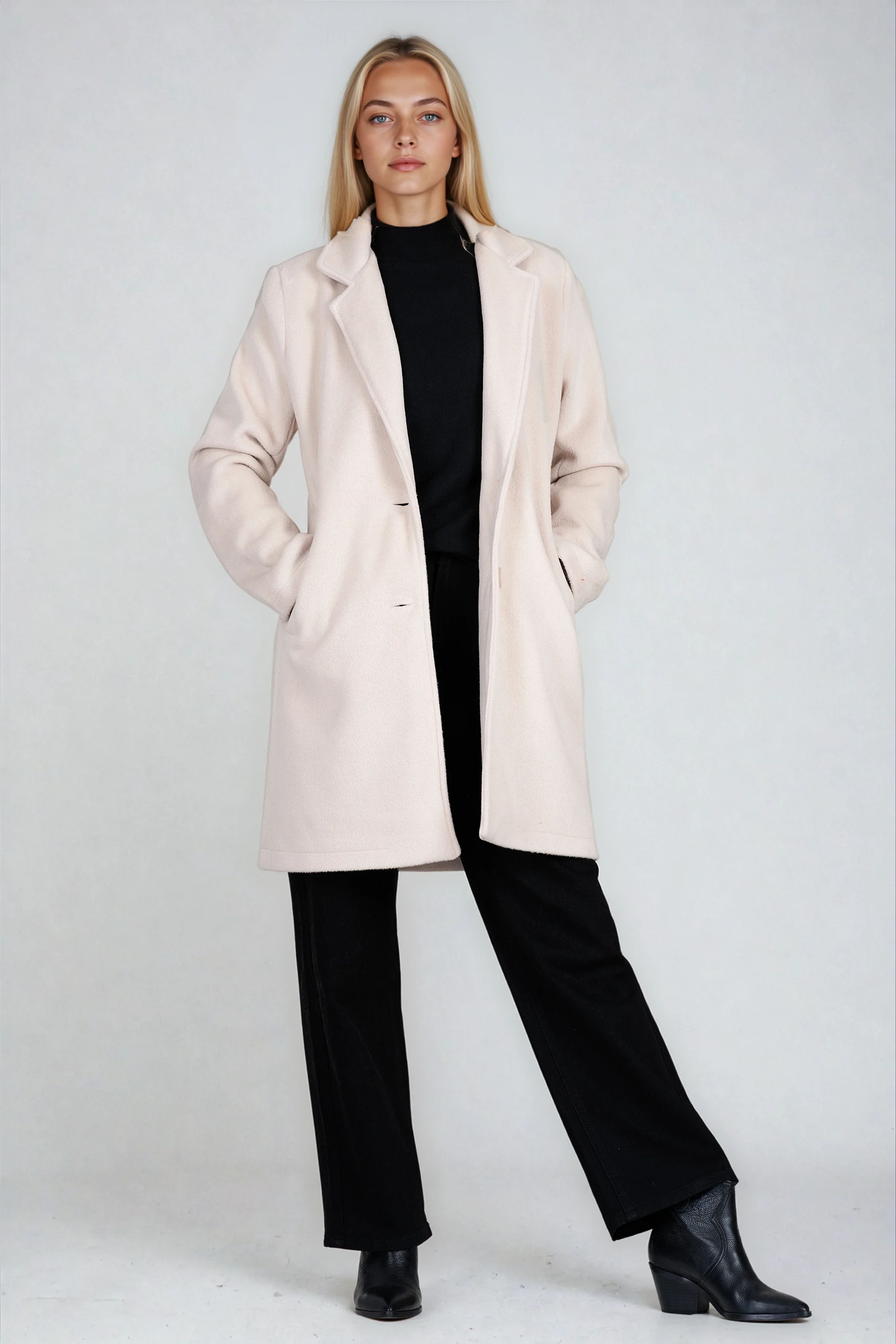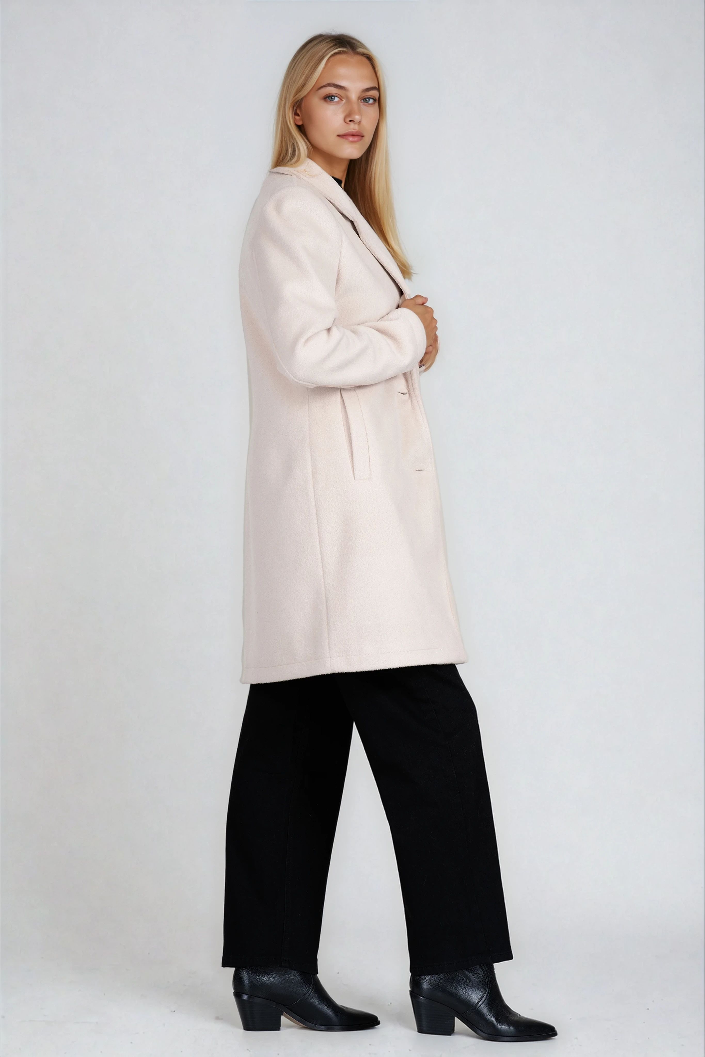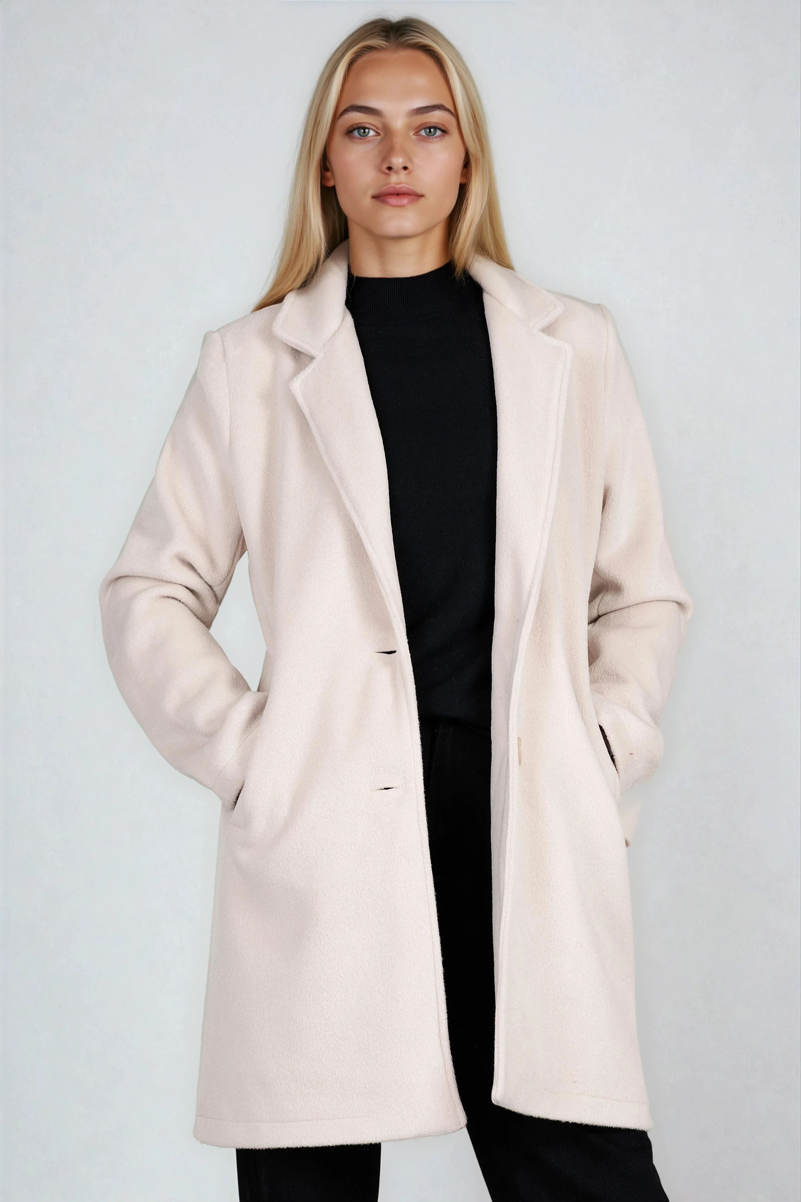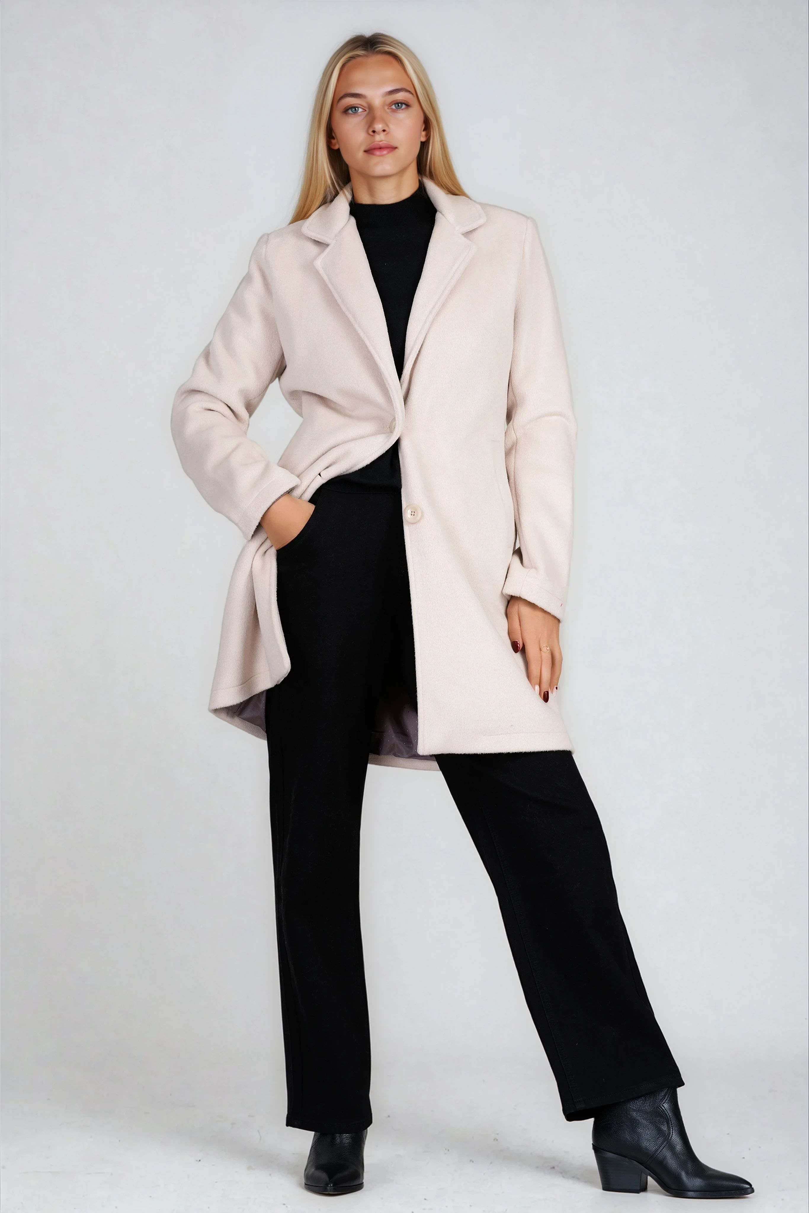 Елегантно и практично палто в светлобежов нюанс, изработено от качествена вълнена смес. Вталената кройка подчертава силуета, докато класическите ревери и закопчаването с две копчета осигуряват стил и комфорт. Моделът е подходящ за есенно-зимния сезон и лесно се комбинира с делови и ежедневни визии. Произведено в България.
