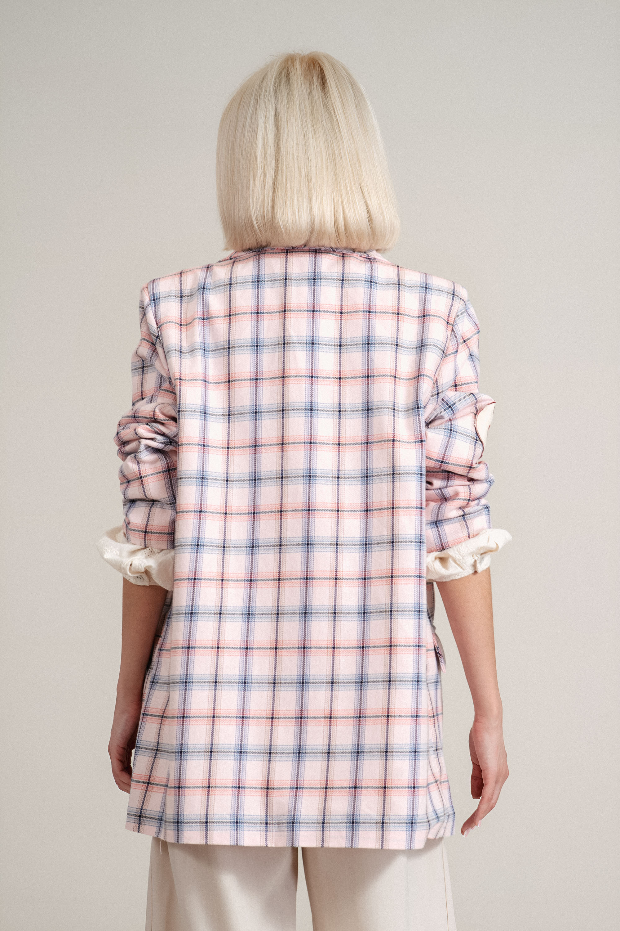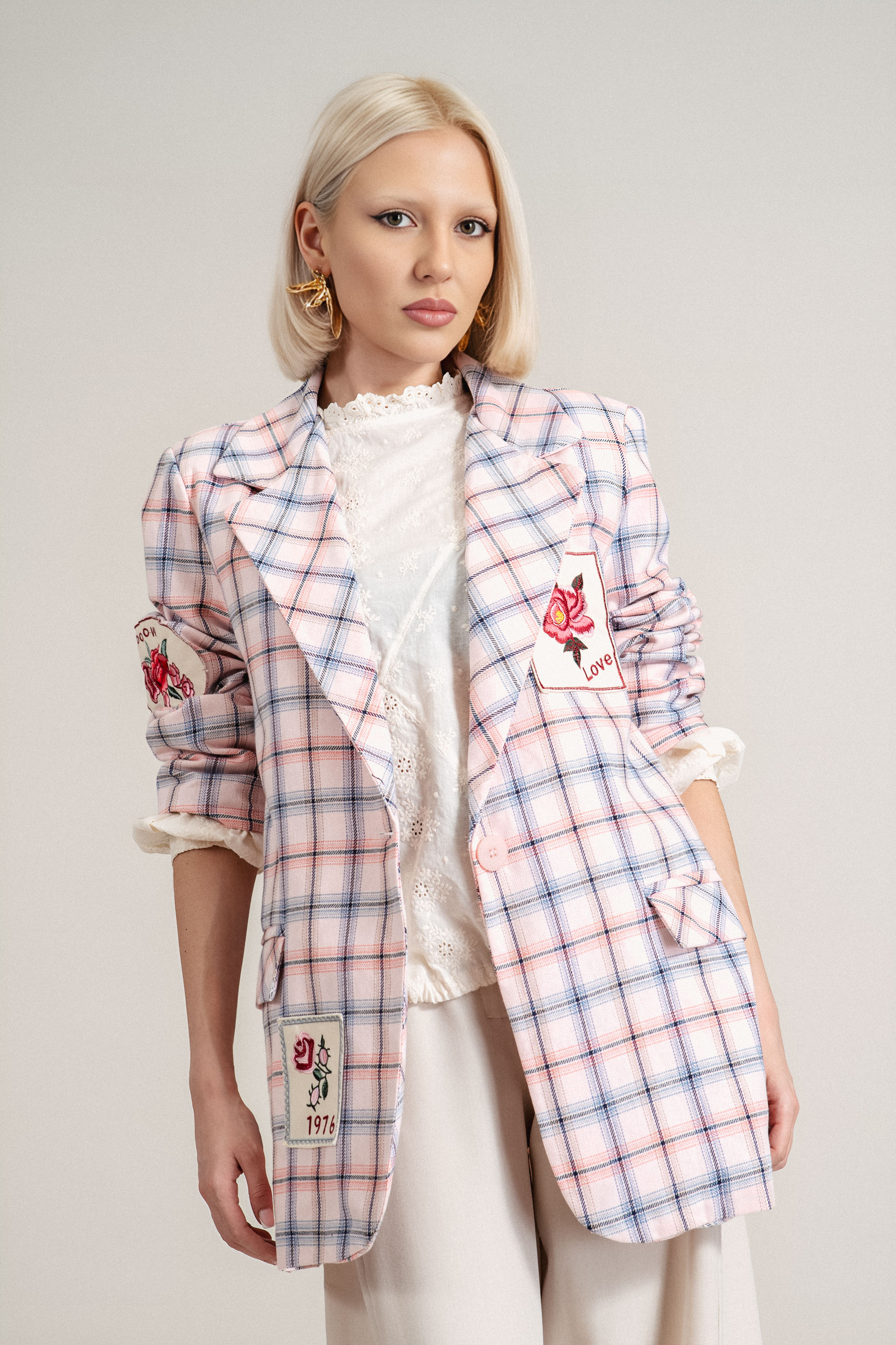 Стилно сако от памучна материя с елегантен принт каре в розово и синьо. Моделът е с класически ревер и две практични джобове с капаци, които подчертават изчистената линия на силуета. Декоративните бродирани емблеми на цветя добавят свеж акцент и придават индивидуалност на дизайна. Леката памучна материя осигурява комфорт при носене и прави модела подходящ за пролетно-летния сезон. Отличен избор за елегантни ежедневни визии или стилни офис комбинации.