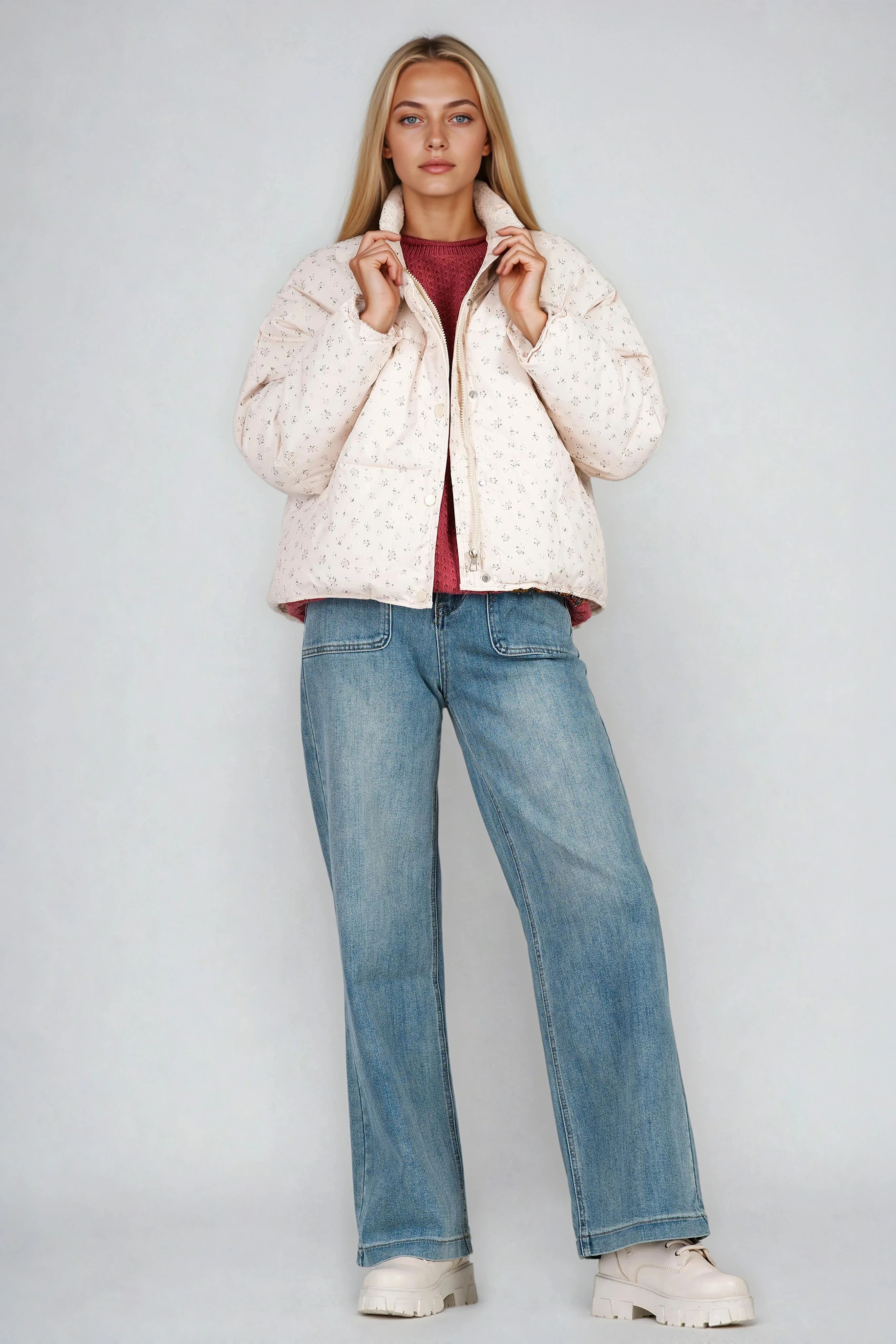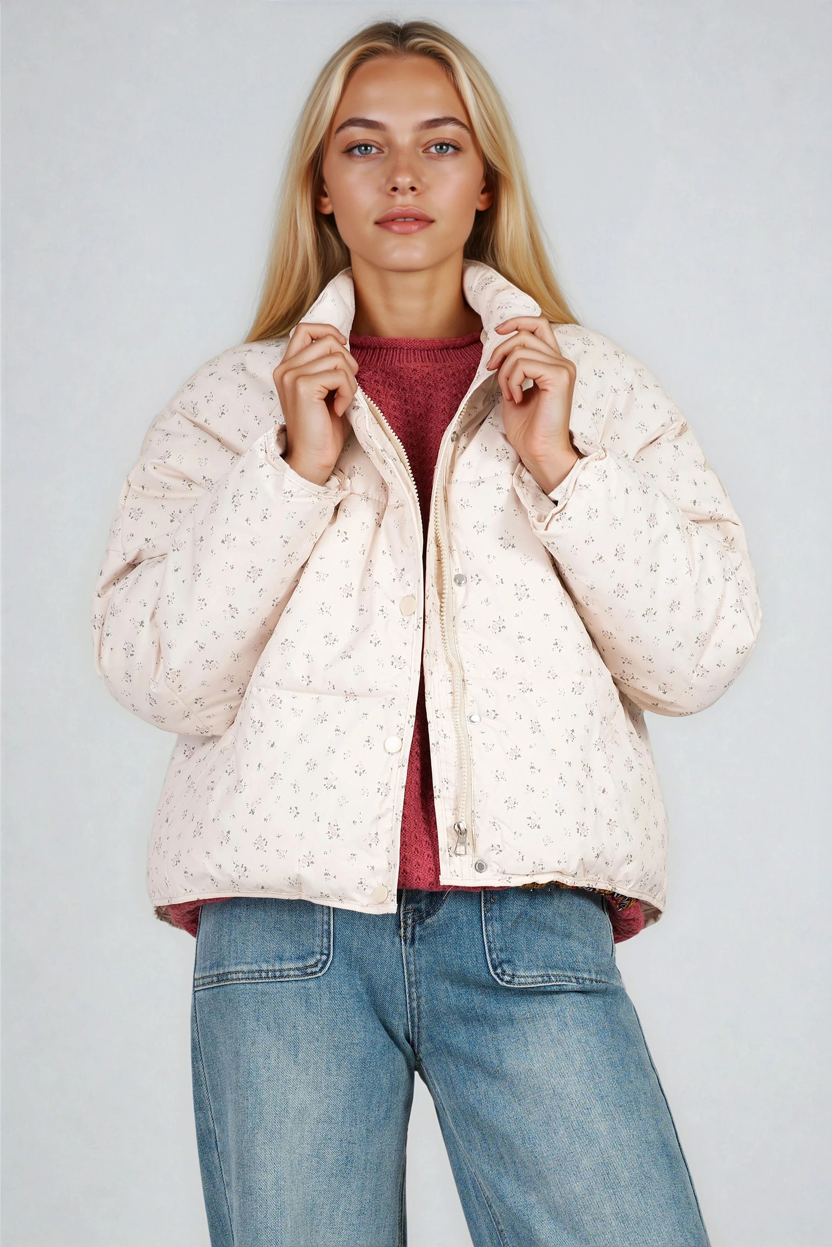 Модерно късо яке тип бомбър със ситен флорален принт. Дизайнът включва качулка, джобове, тик-так копчета и цип за практичност и защита. Кройката е свободна и подходяща за ежедневието, а меката материя създава усещане за лекота и комфорт. Перфектно допълнение към градския стил през зимата.
