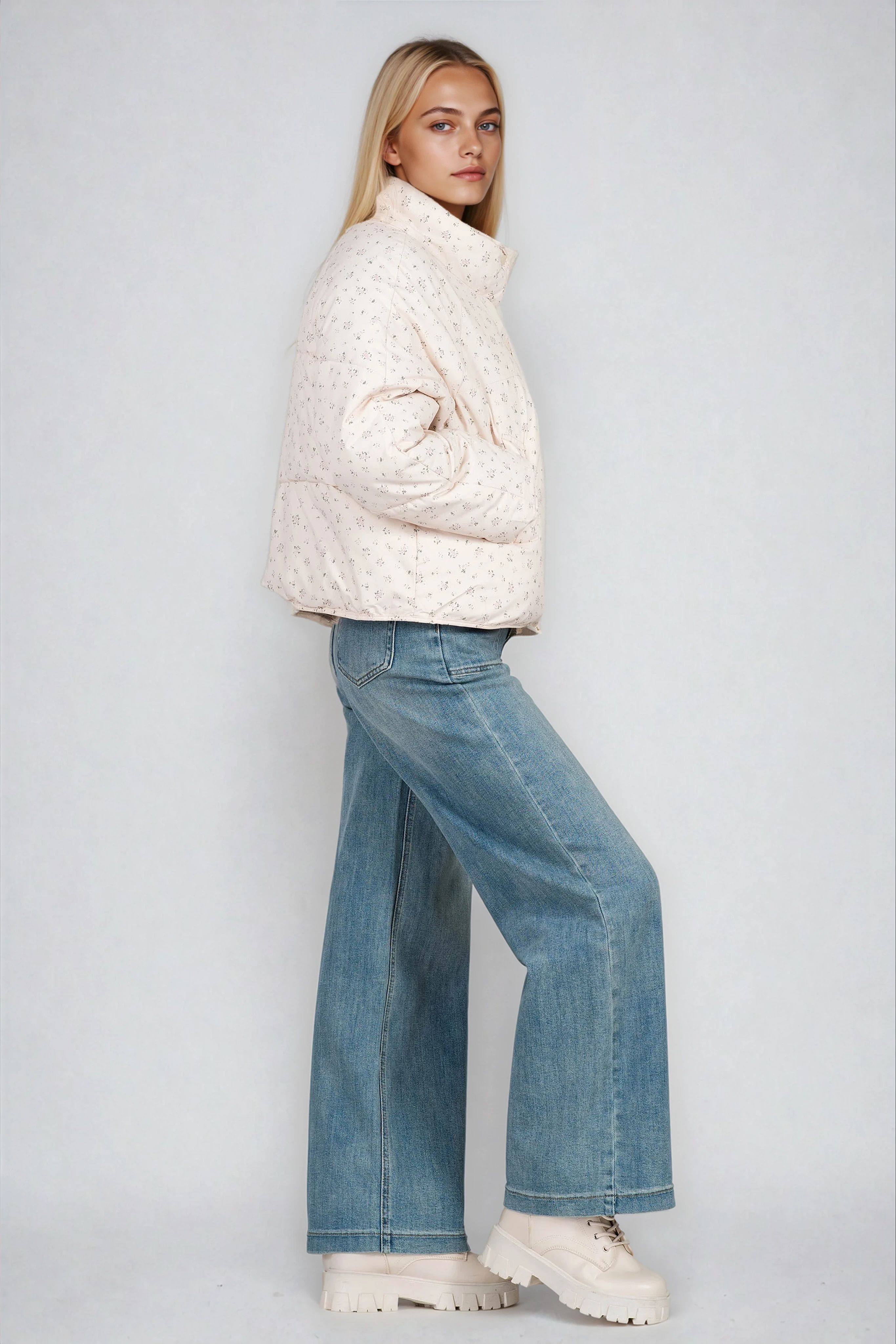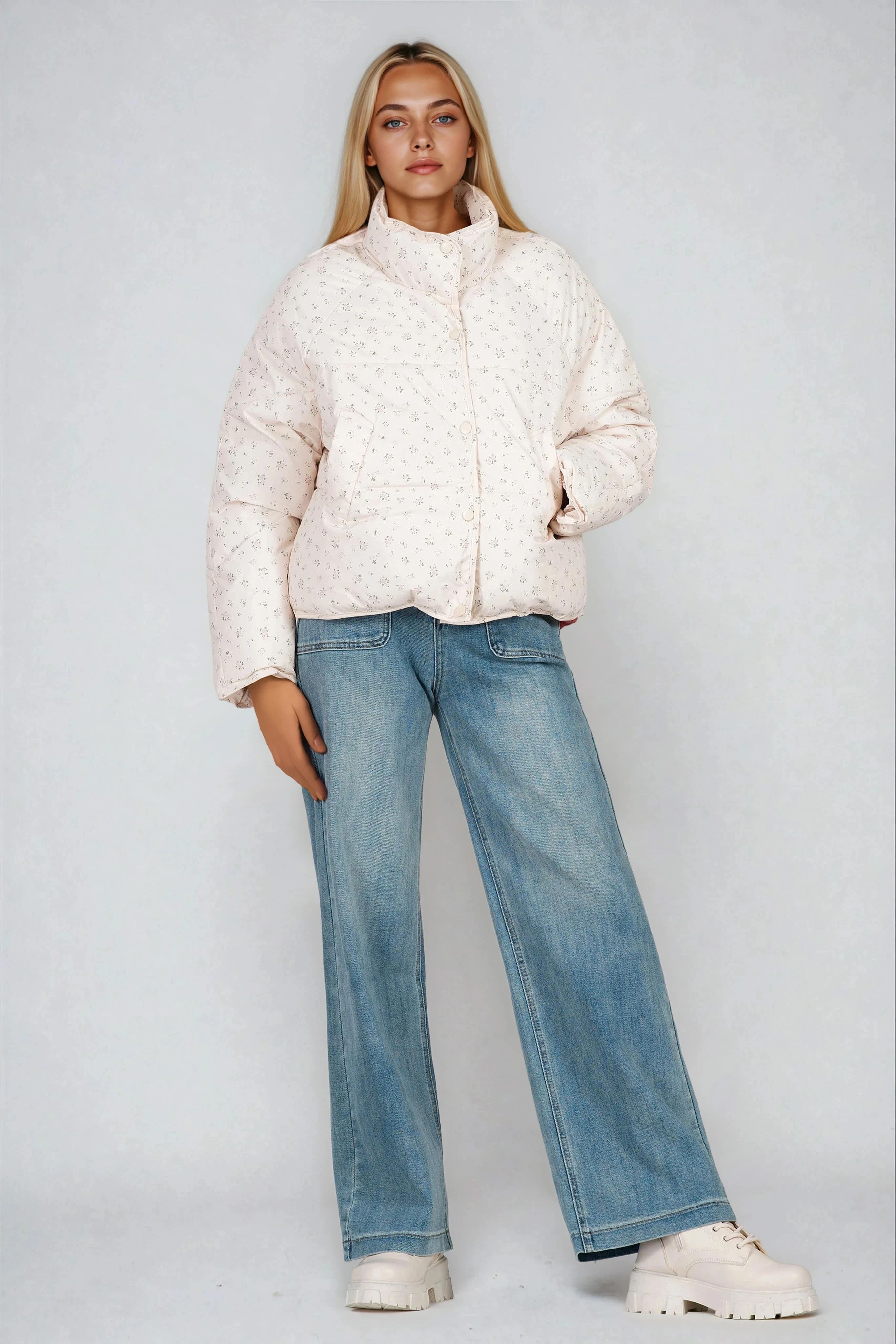 Дамско късо яке тип бомбър в цвят екрю с принт ситни цветя