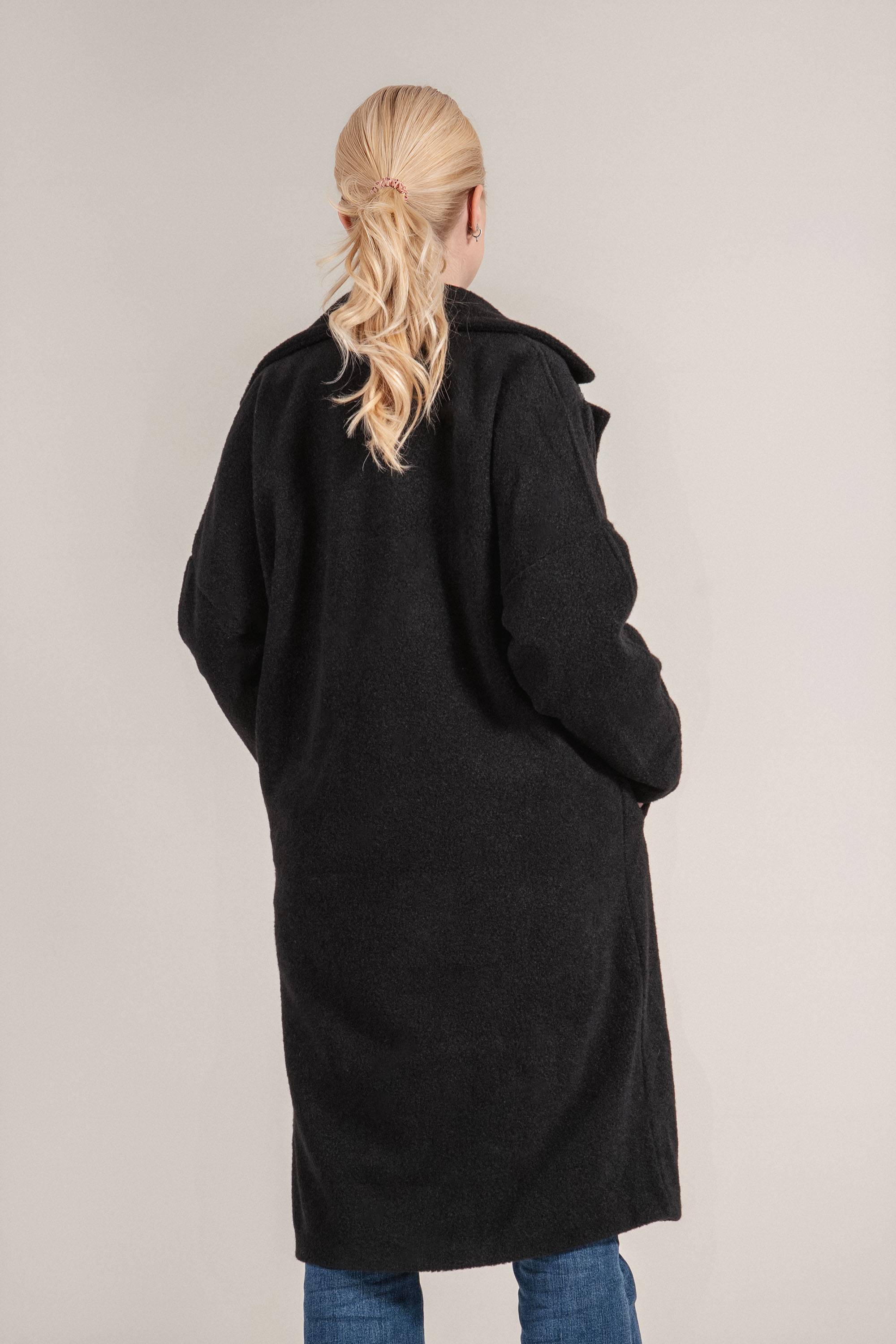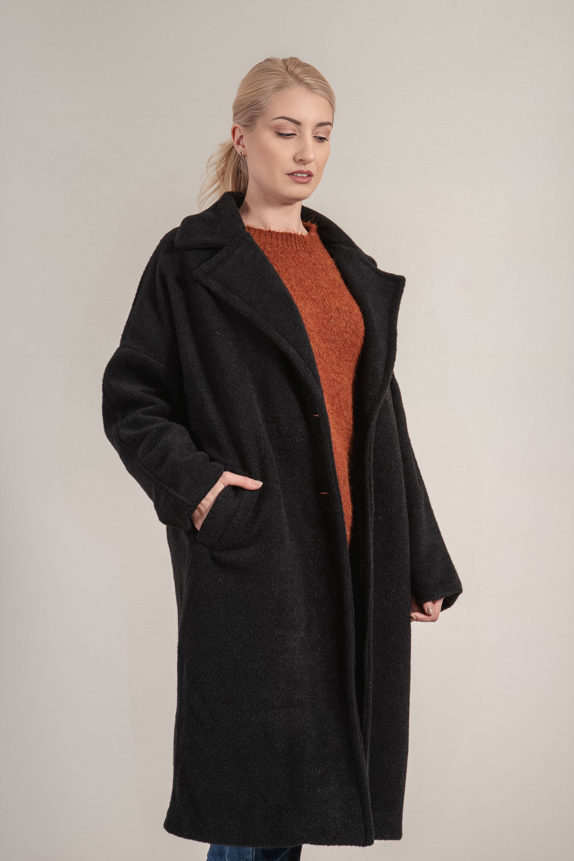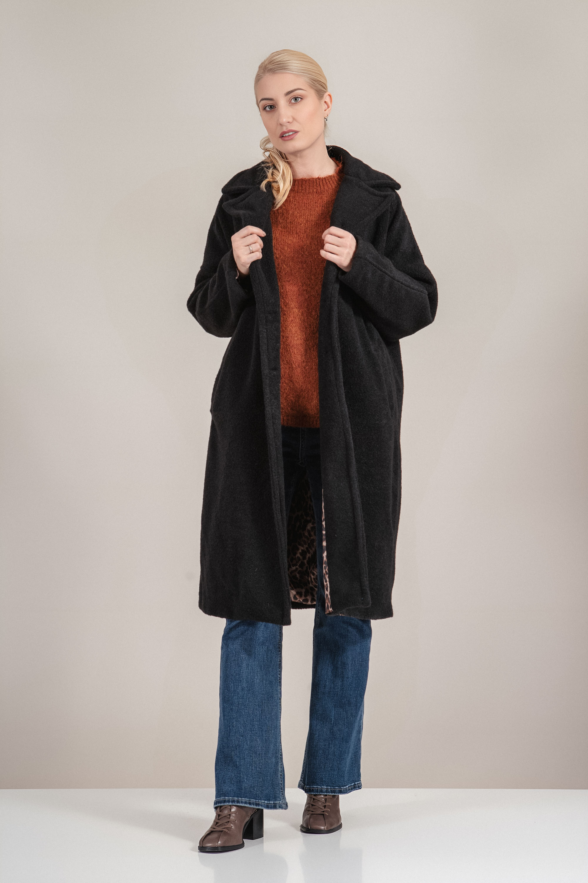 Това черно палто впечатлява с класическата си визия отвън и неочаквания акцент отвътре – стилен леопардов хастар. Кройката е издължена, с изчистен силует, подходящ за ежедневна и делова визия. Материята е плътна и подходяща за есенно-зимния сезон. Закопчаването е едноредово, а двата копчета и скритите джобове допълват елегантния завършек.