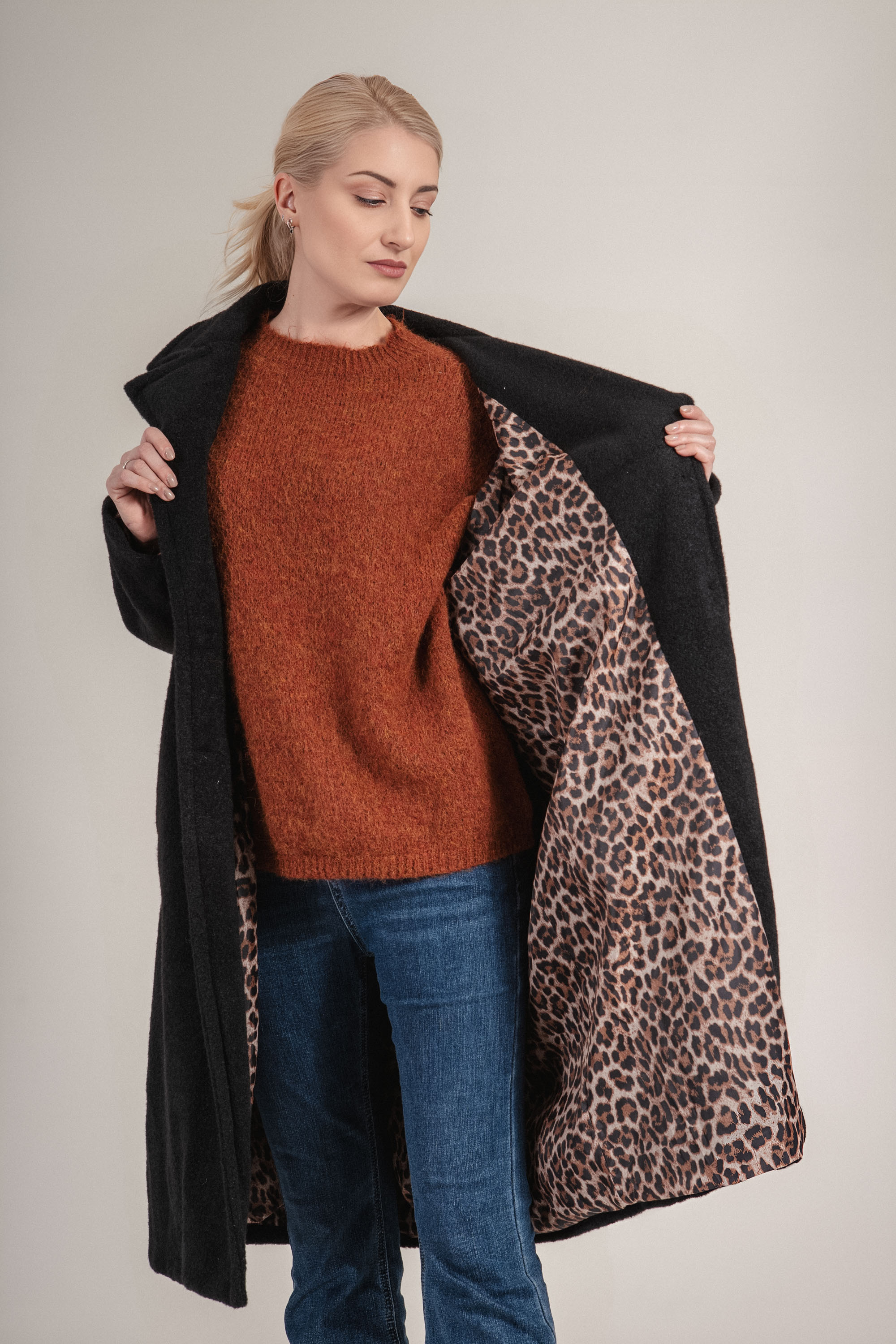 Дамско меко черно палто с леопардов хастар и класическа линия