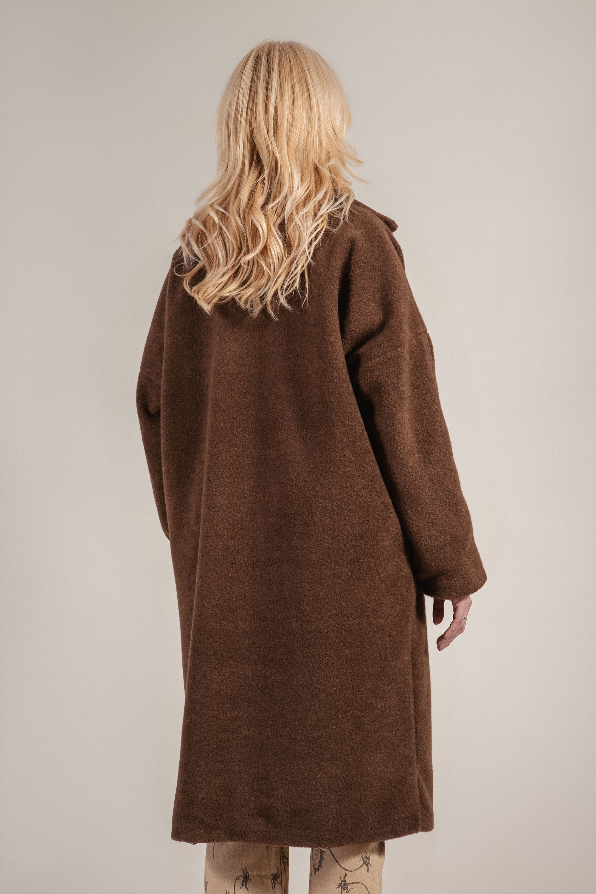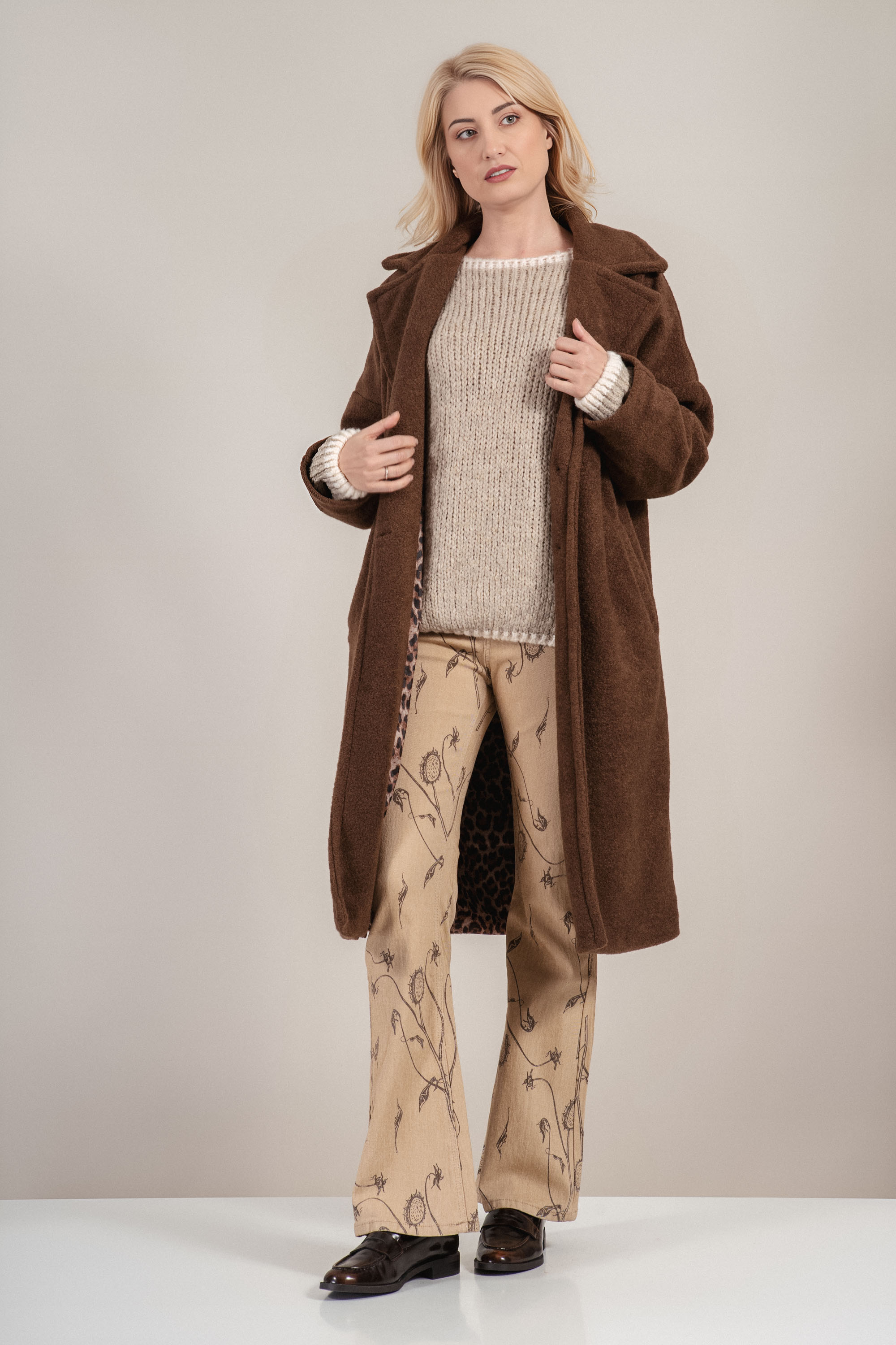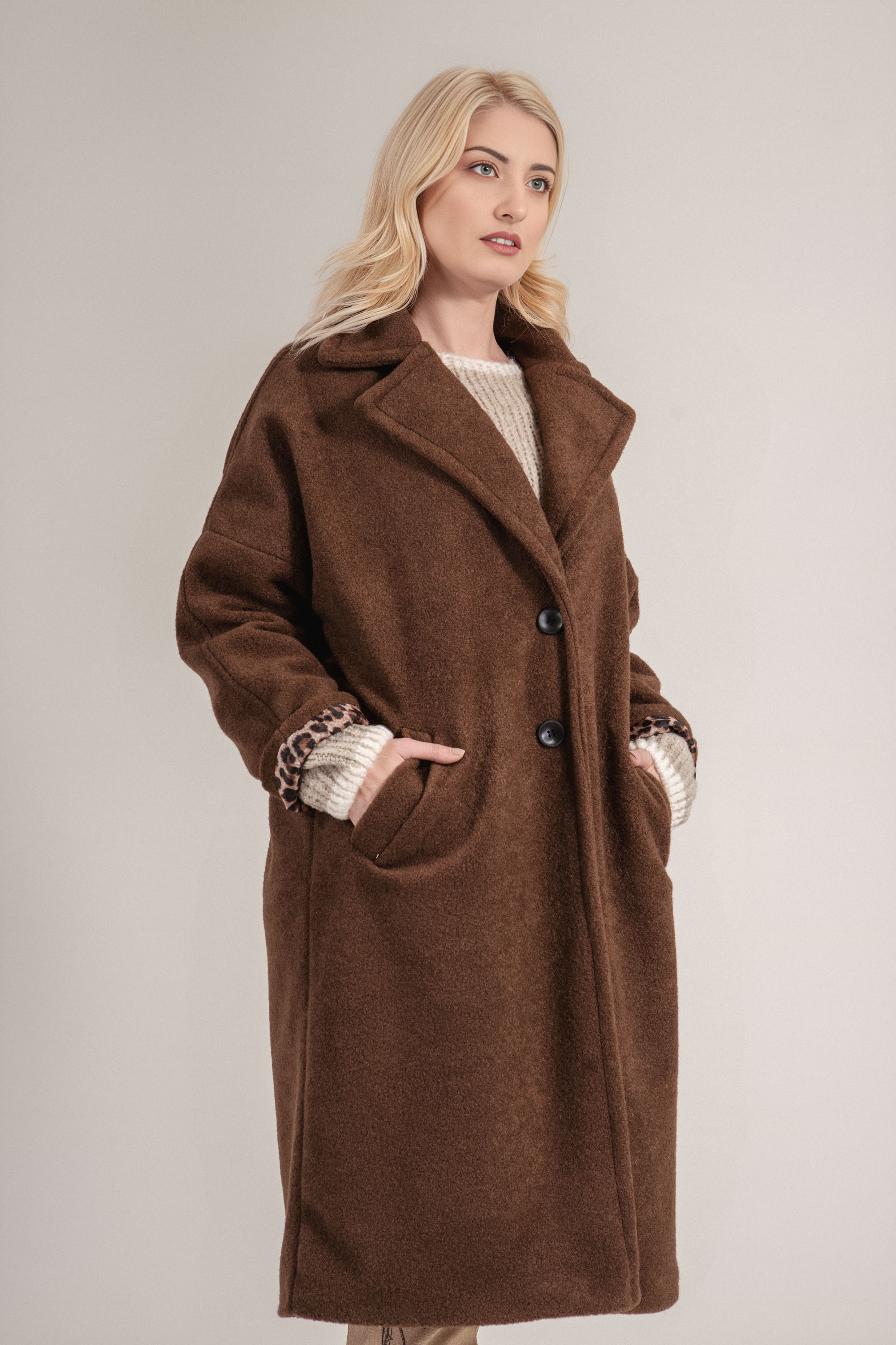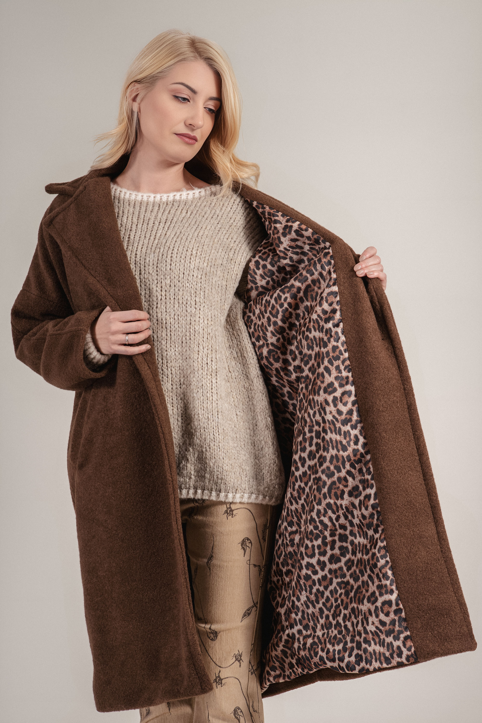 Това кафяво палто впечатлява с класическата си визия отвън и неочаквания акцент отвътре – стилен леопардов хастар. Кройката е издължена, с изчистен силует, подходящ за ежедневна и делова визия. Материята е плътна и подходяща за есенно-зимния сезон. Закопчаването е едноредово, а двата копчета и скритите джобове допълват елегантния завършек.