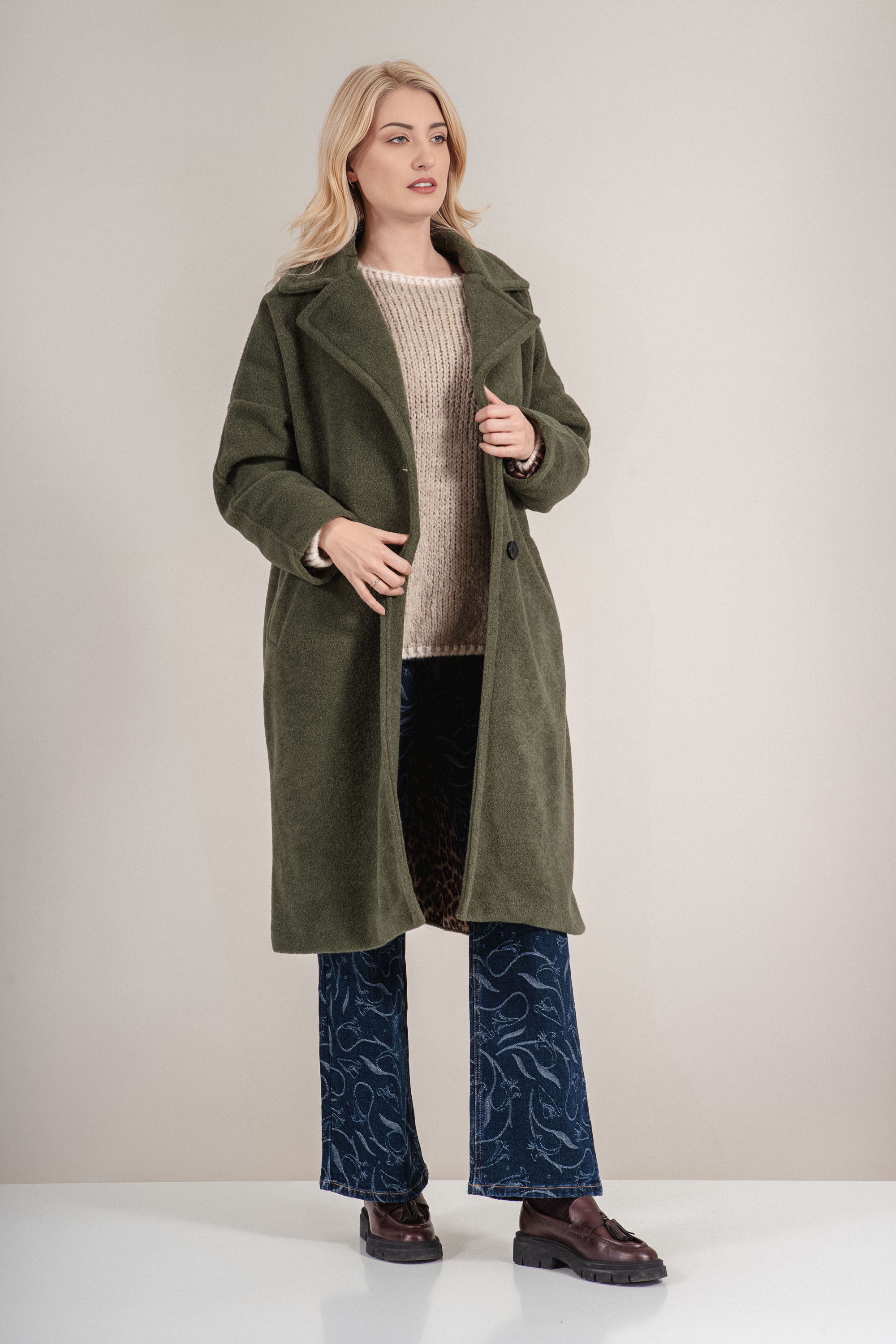 Това зелено палто впечатлява с класическата си визия отвън и неочаквания акцент отвътре – стилен леопардов хастар. Кройката е издължена, с изчистен силует, подходящ за ежедневна и делова визия. Материята е плътна и подходяща за есенно-зимния сезон. Закопчаването е едноредово, а двата копчета и скритите джобове допълват елегантния завършек.