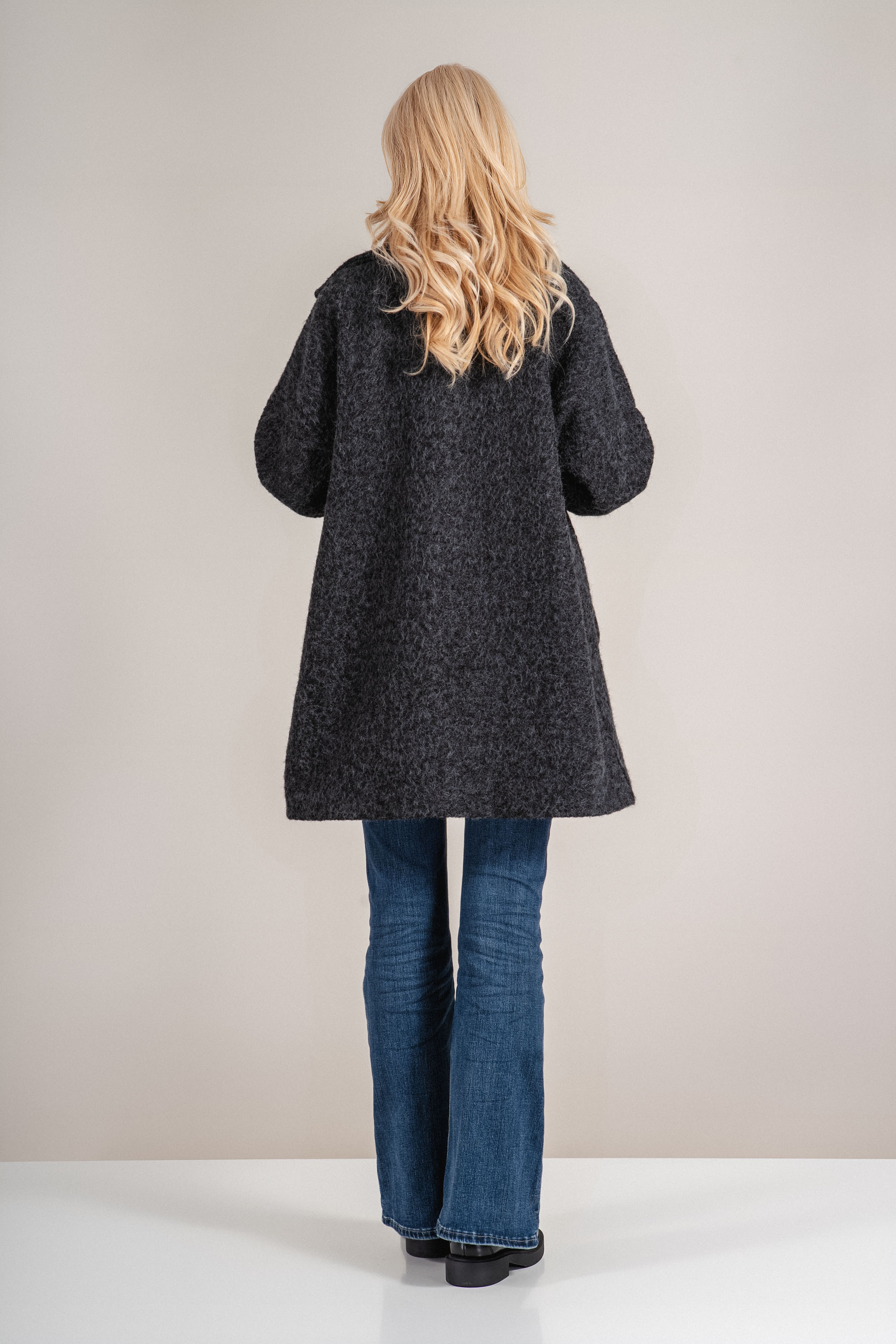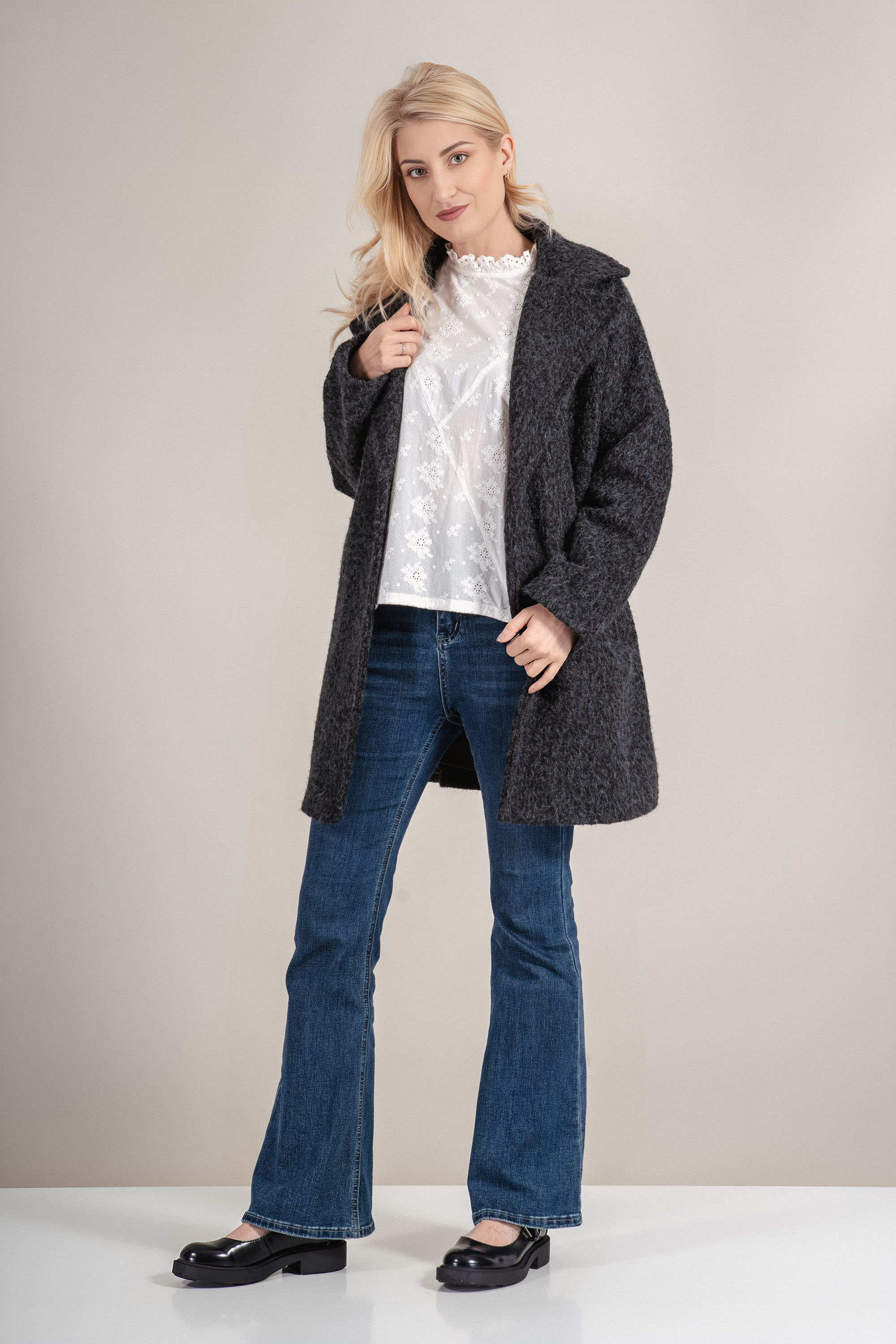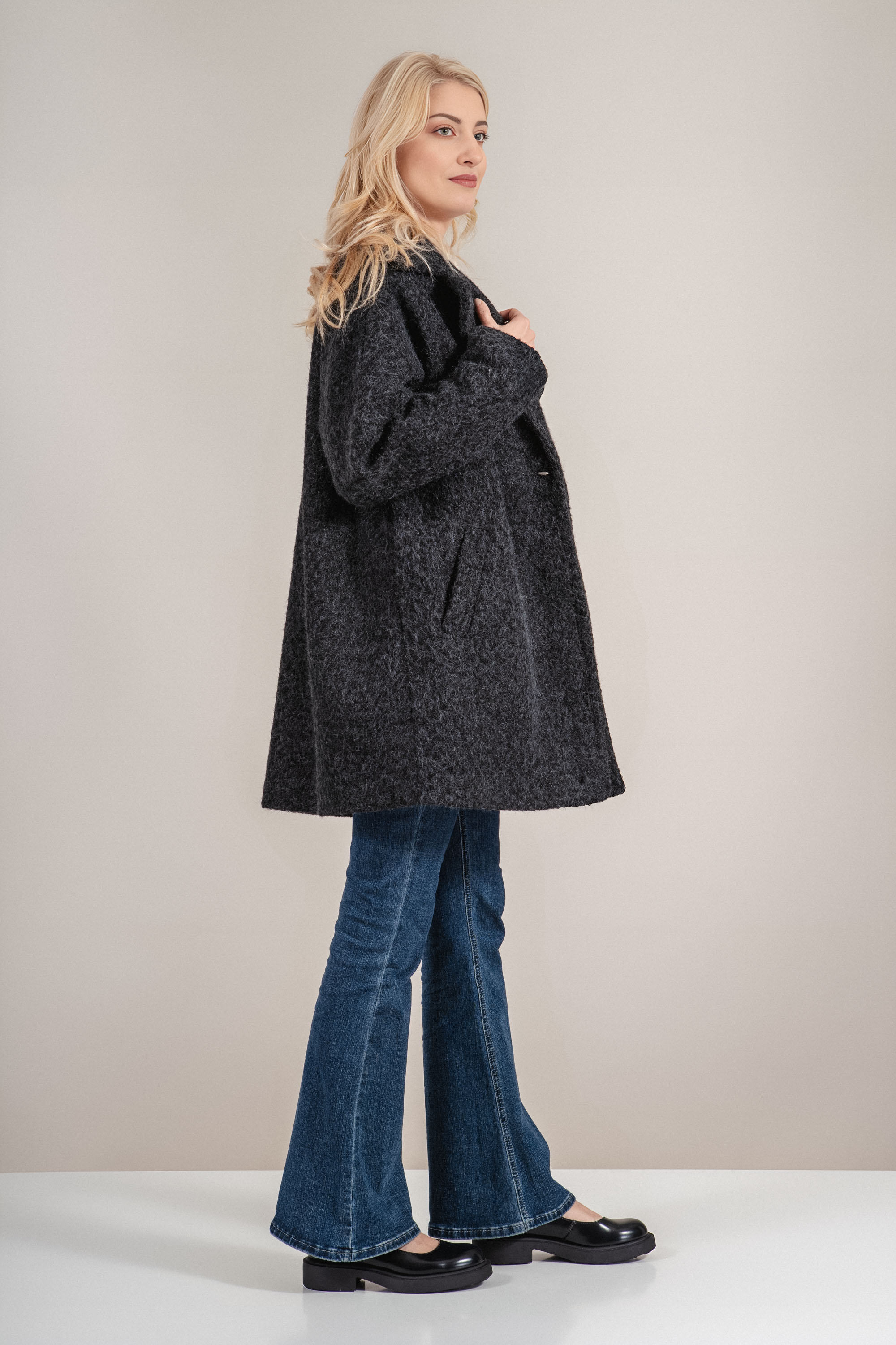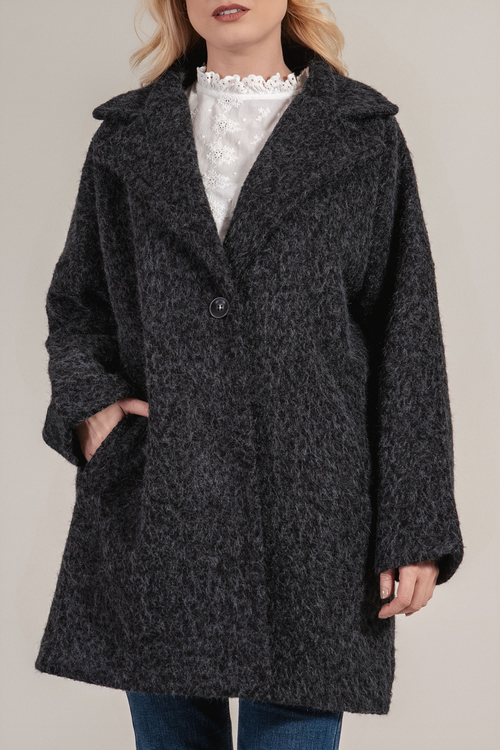Палтото впечатлява с модерна и мека текстура, съчетаваща визуален комфорт с топлина. Кройката е леко свободна, което позволява наслояване с пуловери или жилетки. Дължината е подходяща за хладните месеци, а черният цвят се комбинира лесно с разнообразни визии. С елегантнa реверна яка и практични джобове, този модел е отличен избор за ежедневна елегантност.