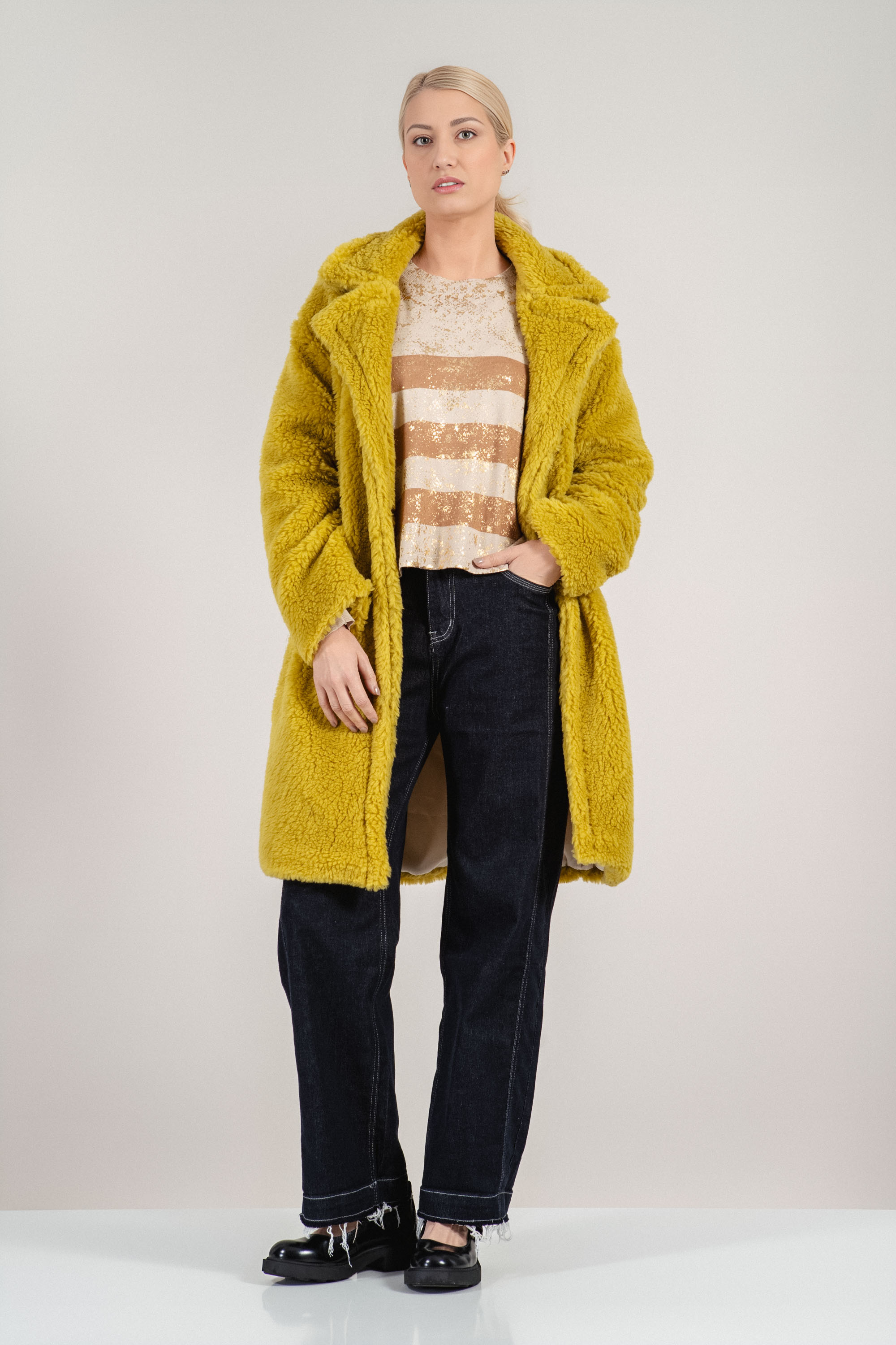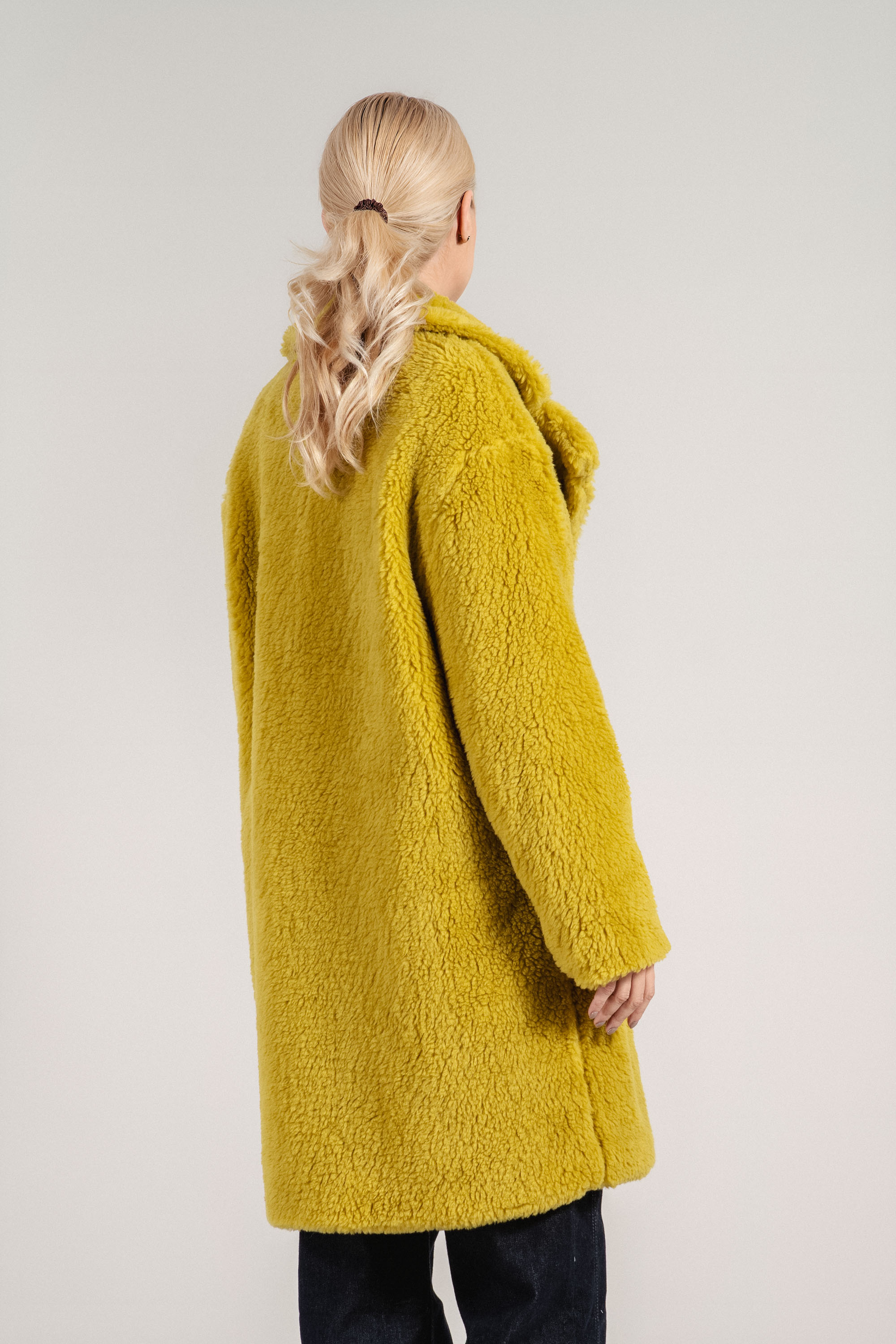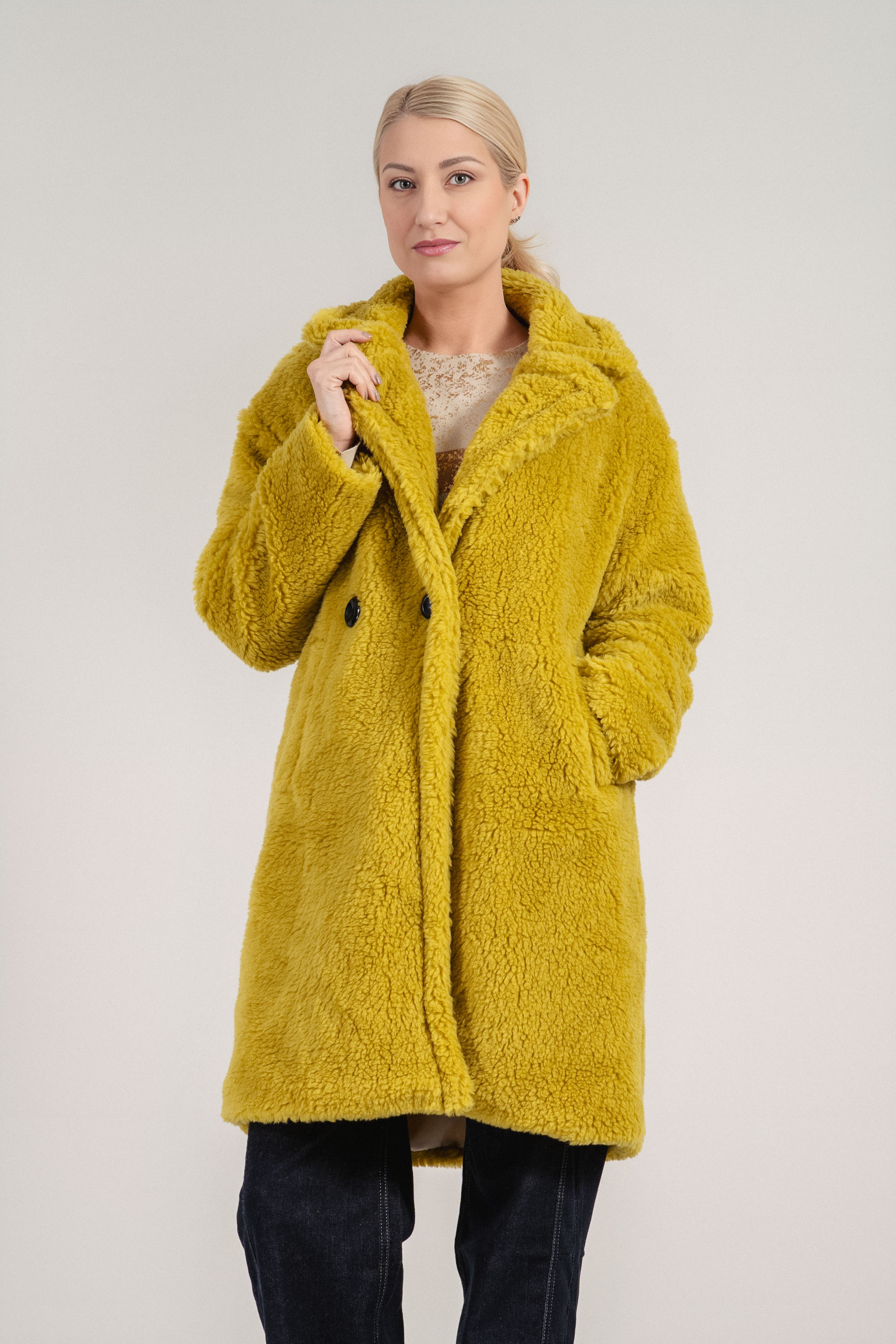 Стилно палто в свеж зелен цвят, което ще внесе цвят и елегантност в ежедневната визия. Изработено от пухкава материя с мек допир. Дългата кройка с подчертана талия и декоративна яка придават изразителен силует. Практични джобове и ефектни черни копчета завършват визията. Подходящо за есен и мека зима.