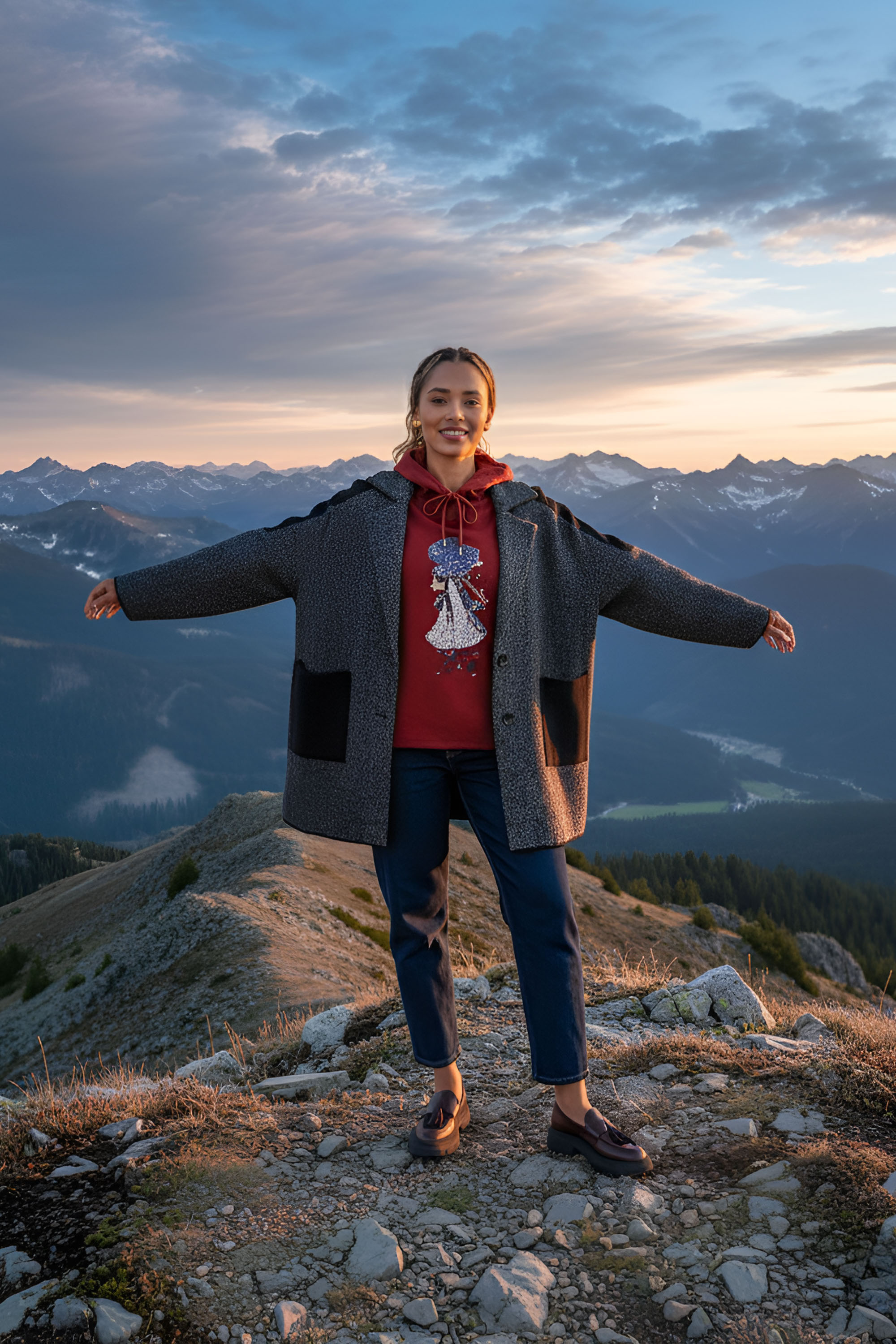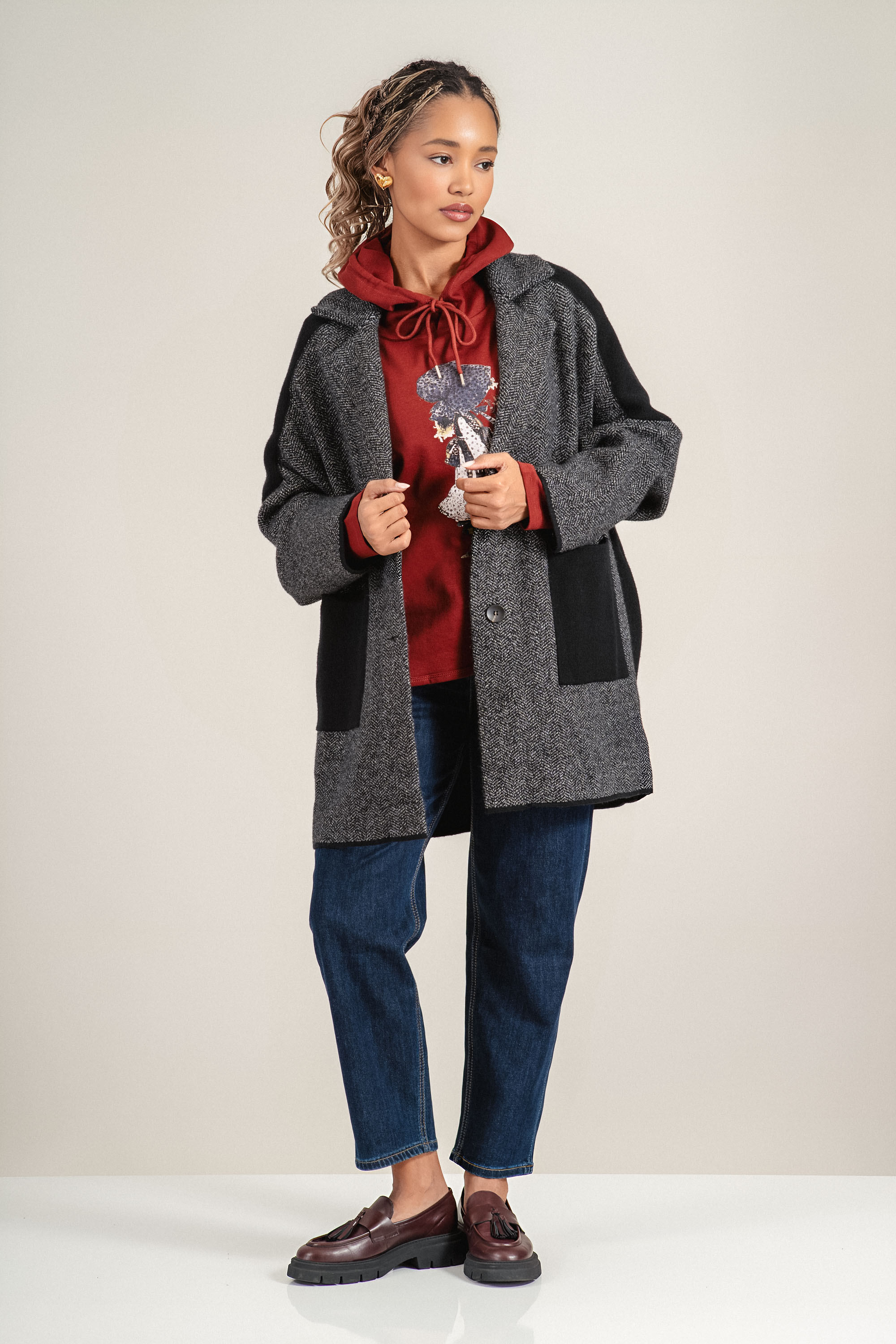 Това късо палто от меко плетиво е идеално за преходните сезони. Дизайнът включва класически ревери и два едноцветни джоба, които придават интересен акцент. Топлата материя и небрежно-елегантната кройка го правят подходящо за ежедневни визии в града.