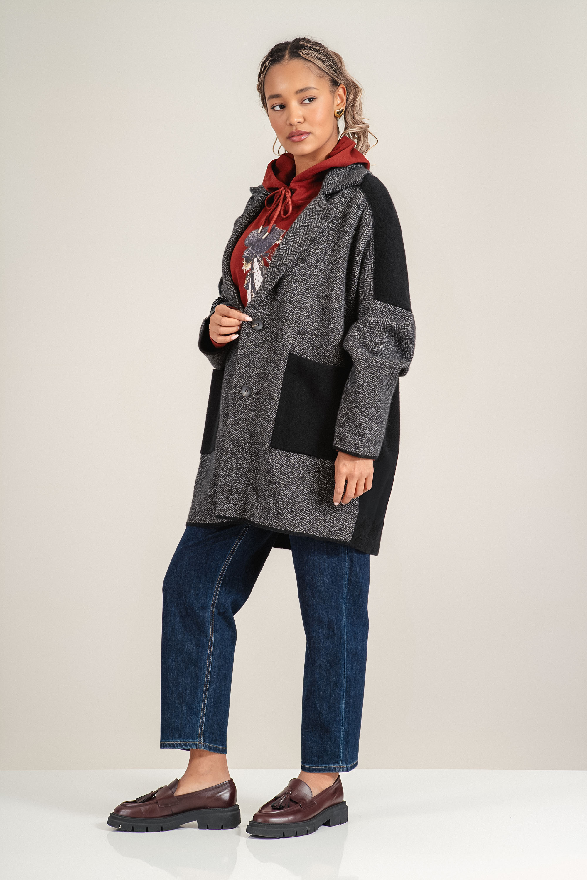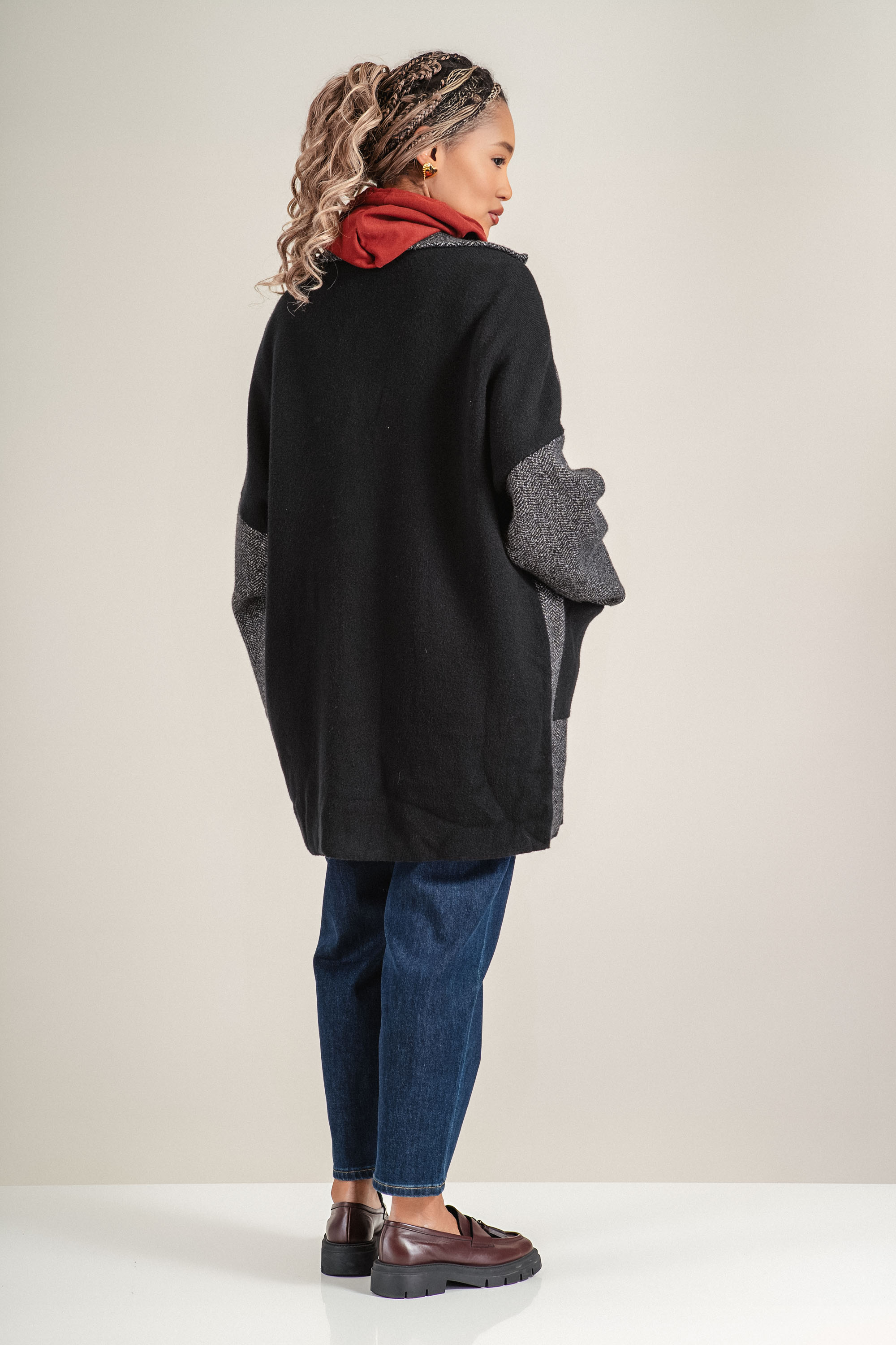 Дамско палто от плетиво в черно-бял меланж и контрастни джобове