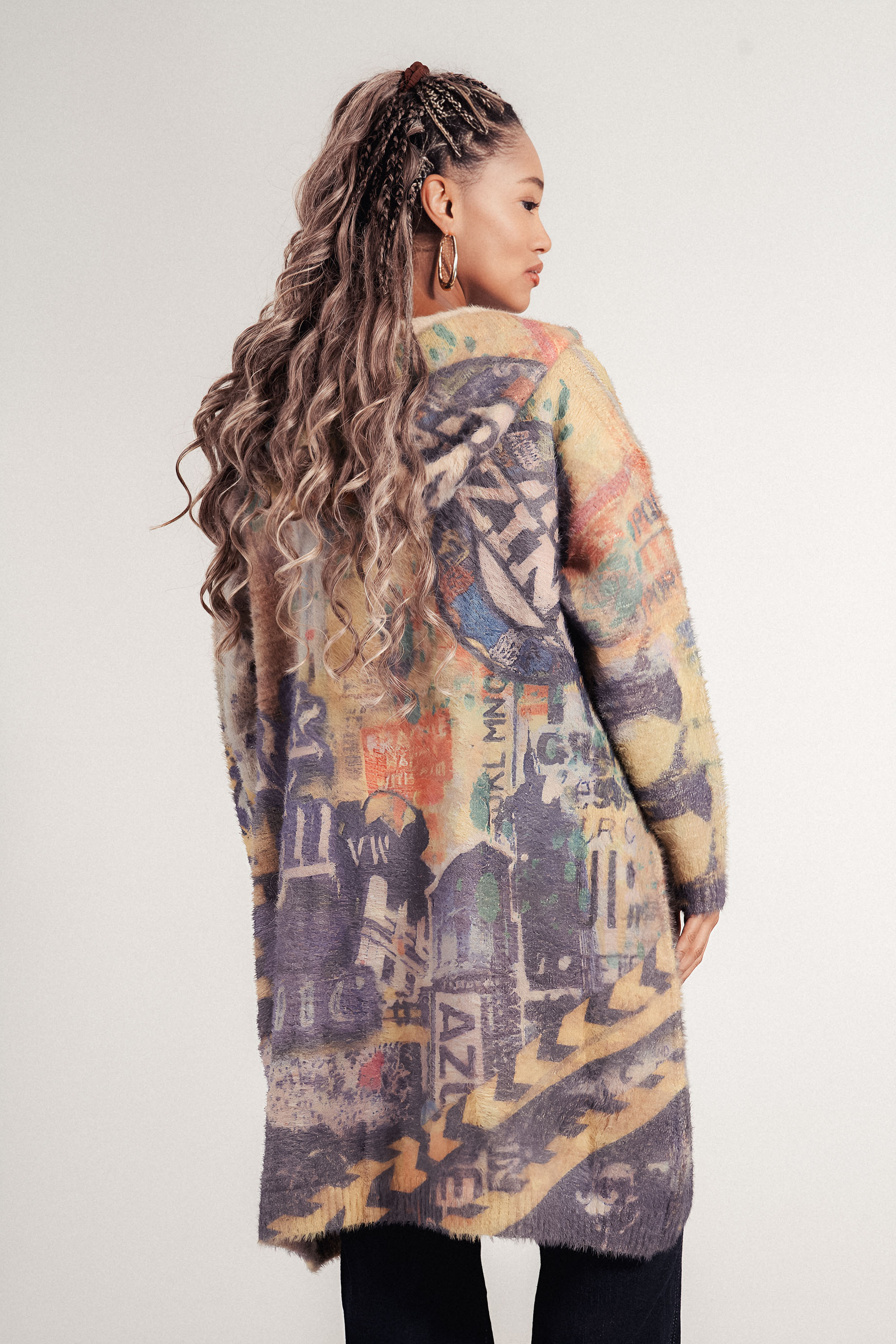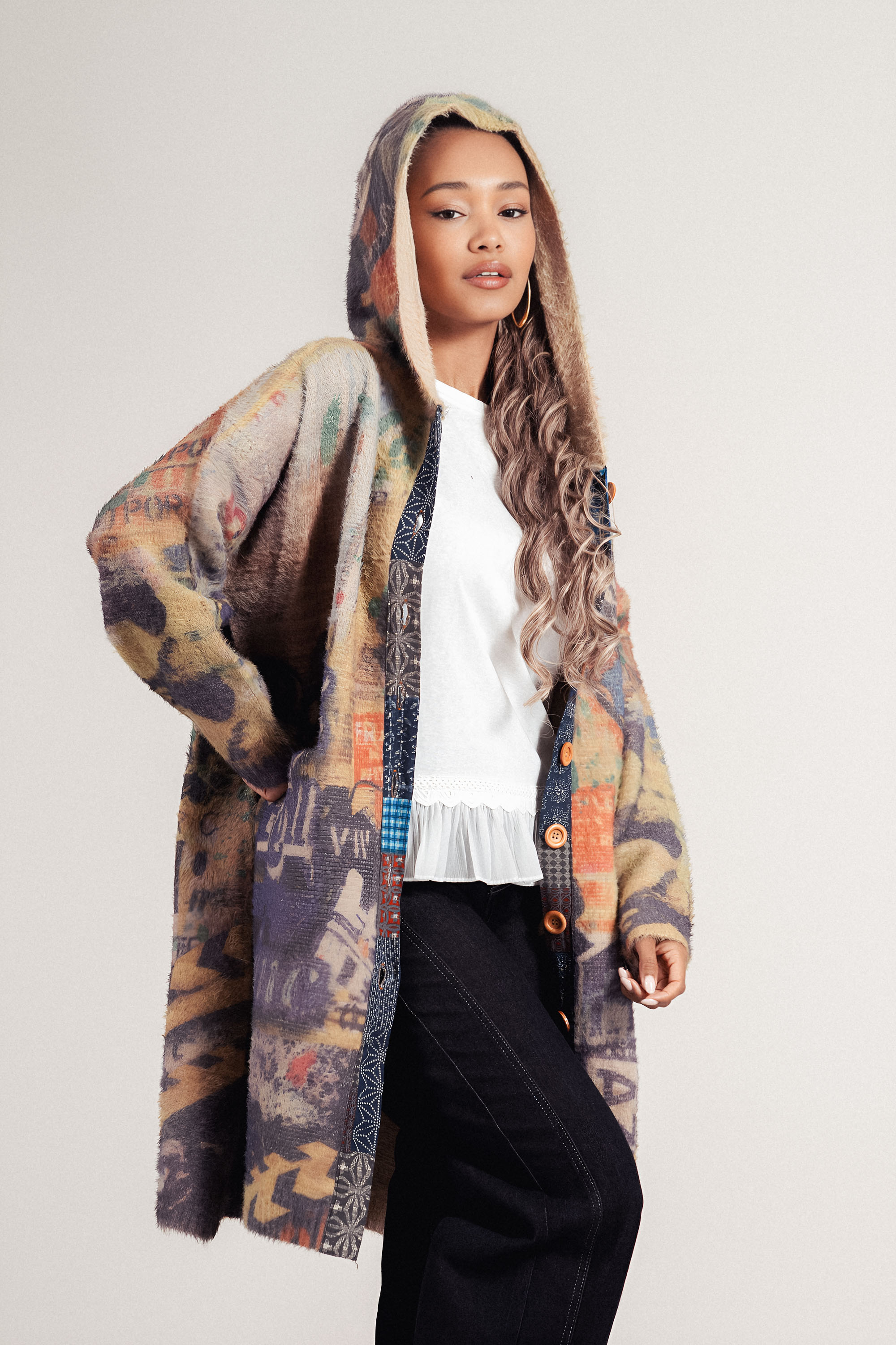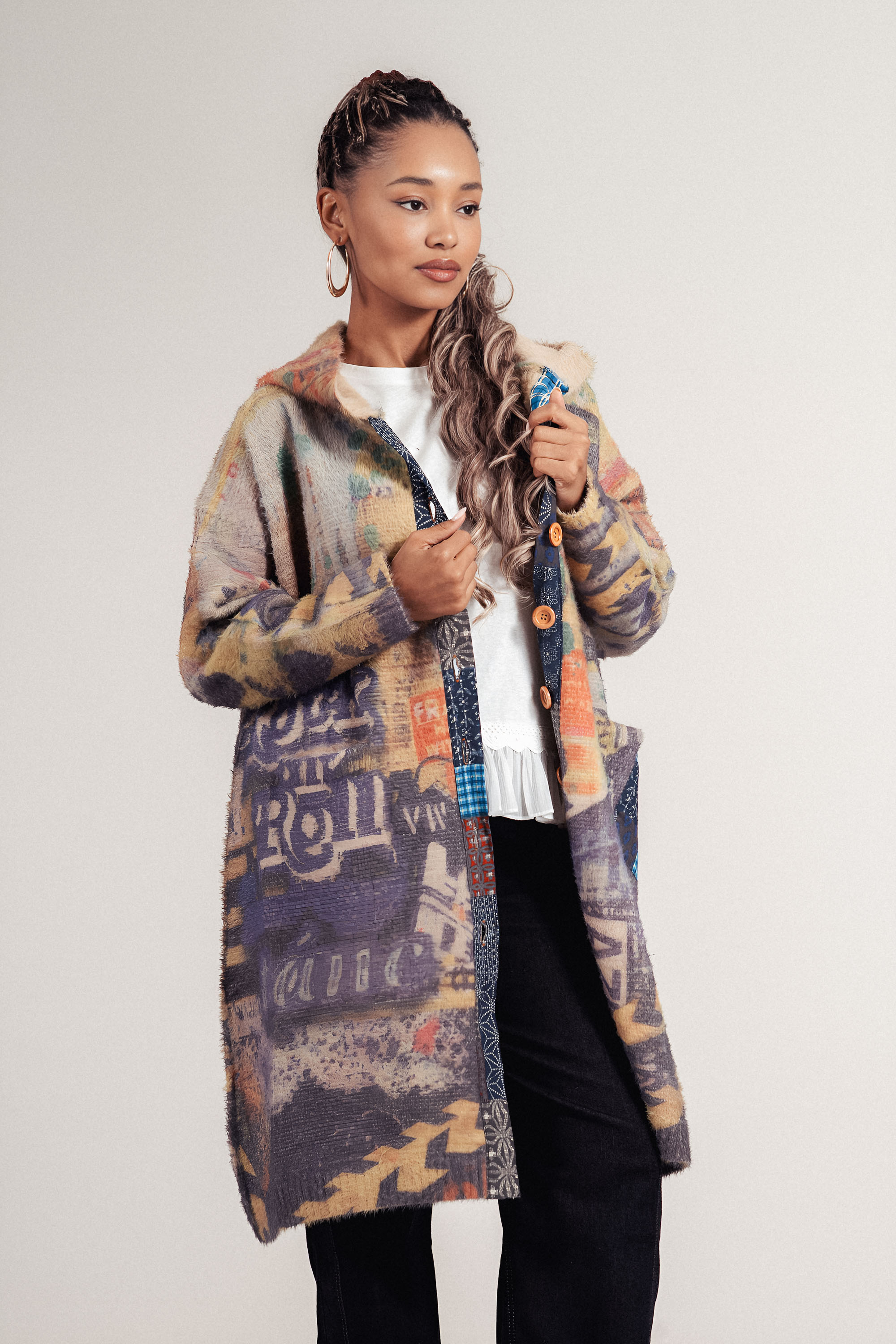 Топло и ефектно палто с артистичен цветен принт в лилави и жълти тонове. Моделът е със свободна кройка, качулка и два удобни джоба. Декорирано е с цветни копчета за модерен и нестандартен акцент. Подходящо за есен и зима, съчетава комфорт и стил за всяка фигура.