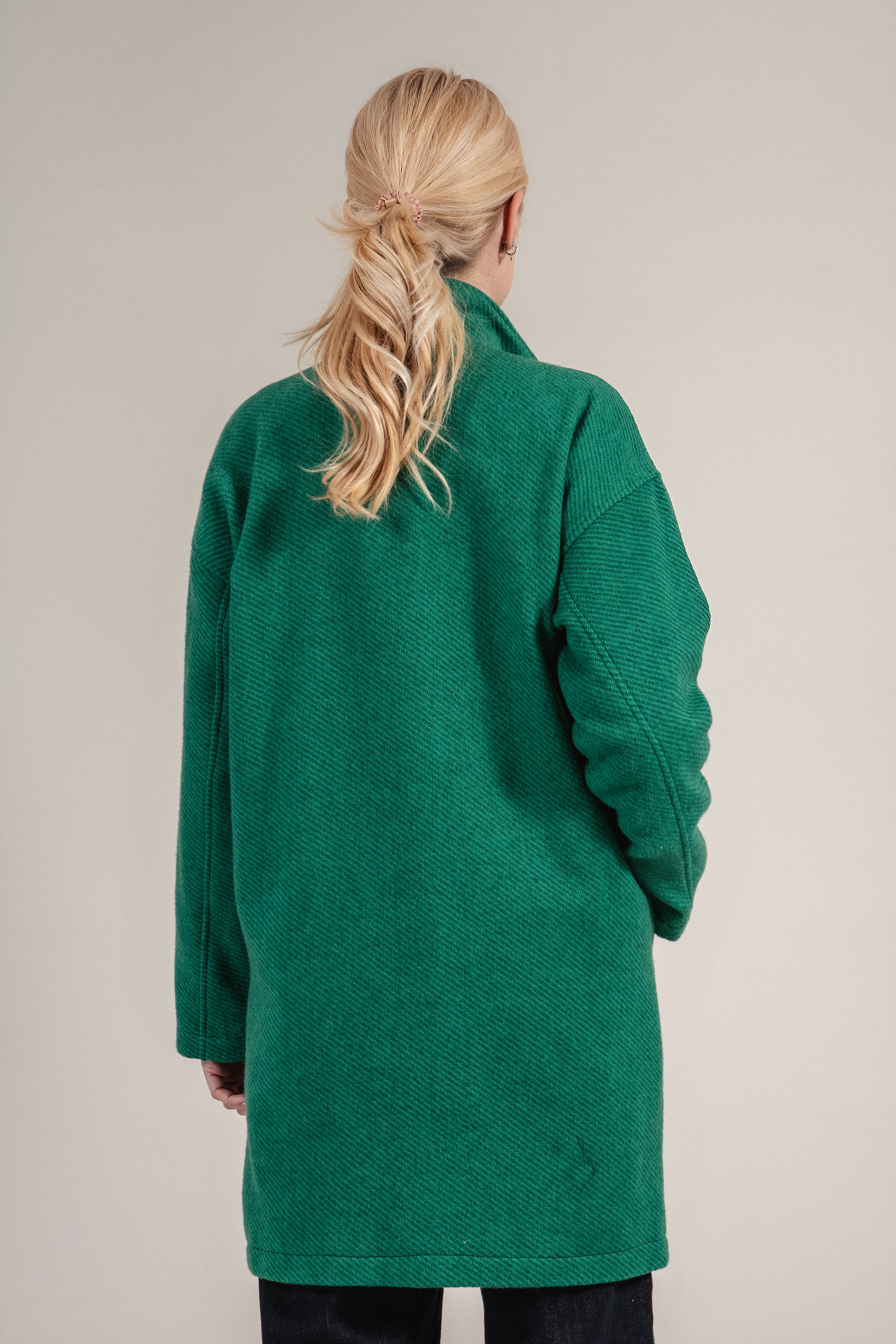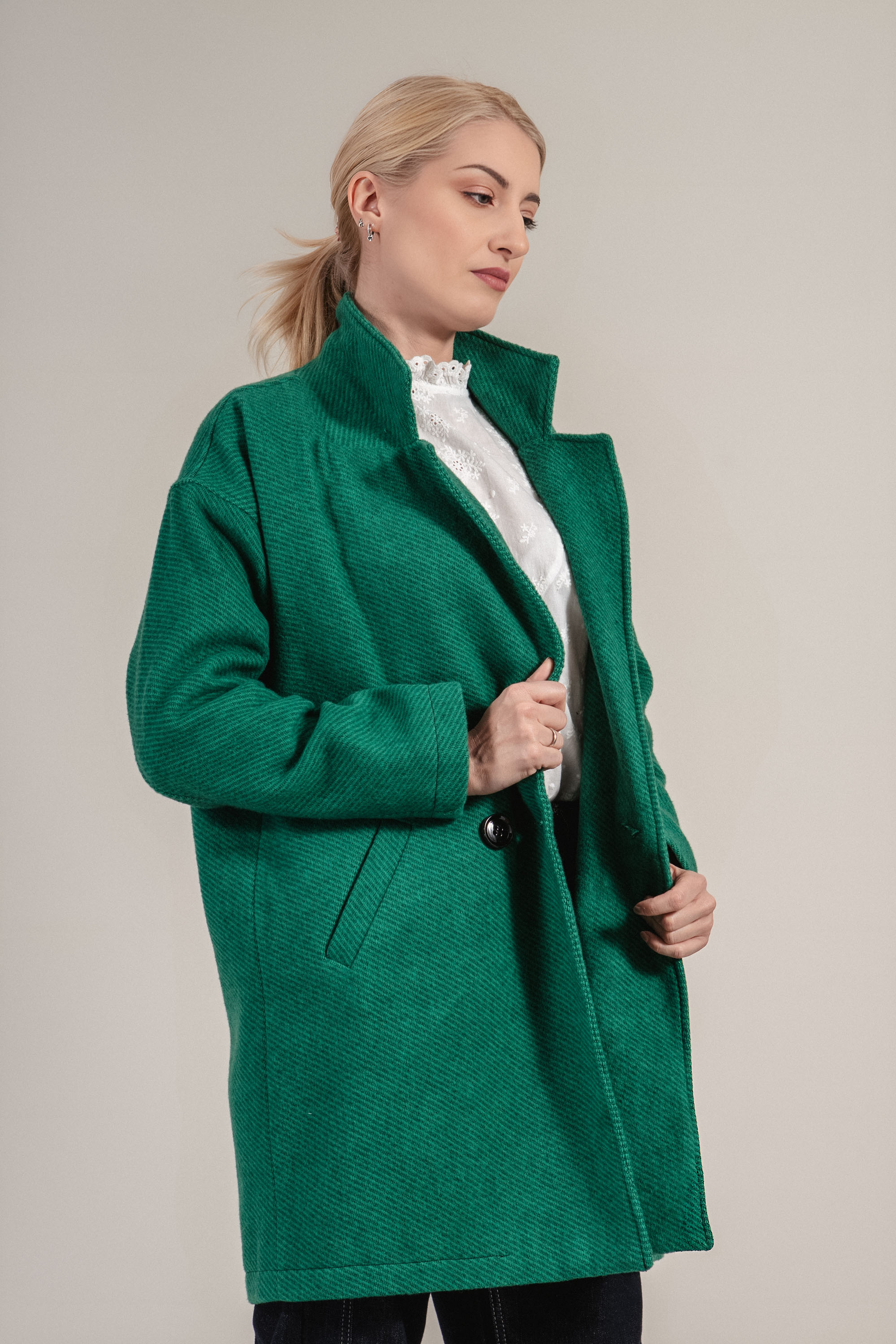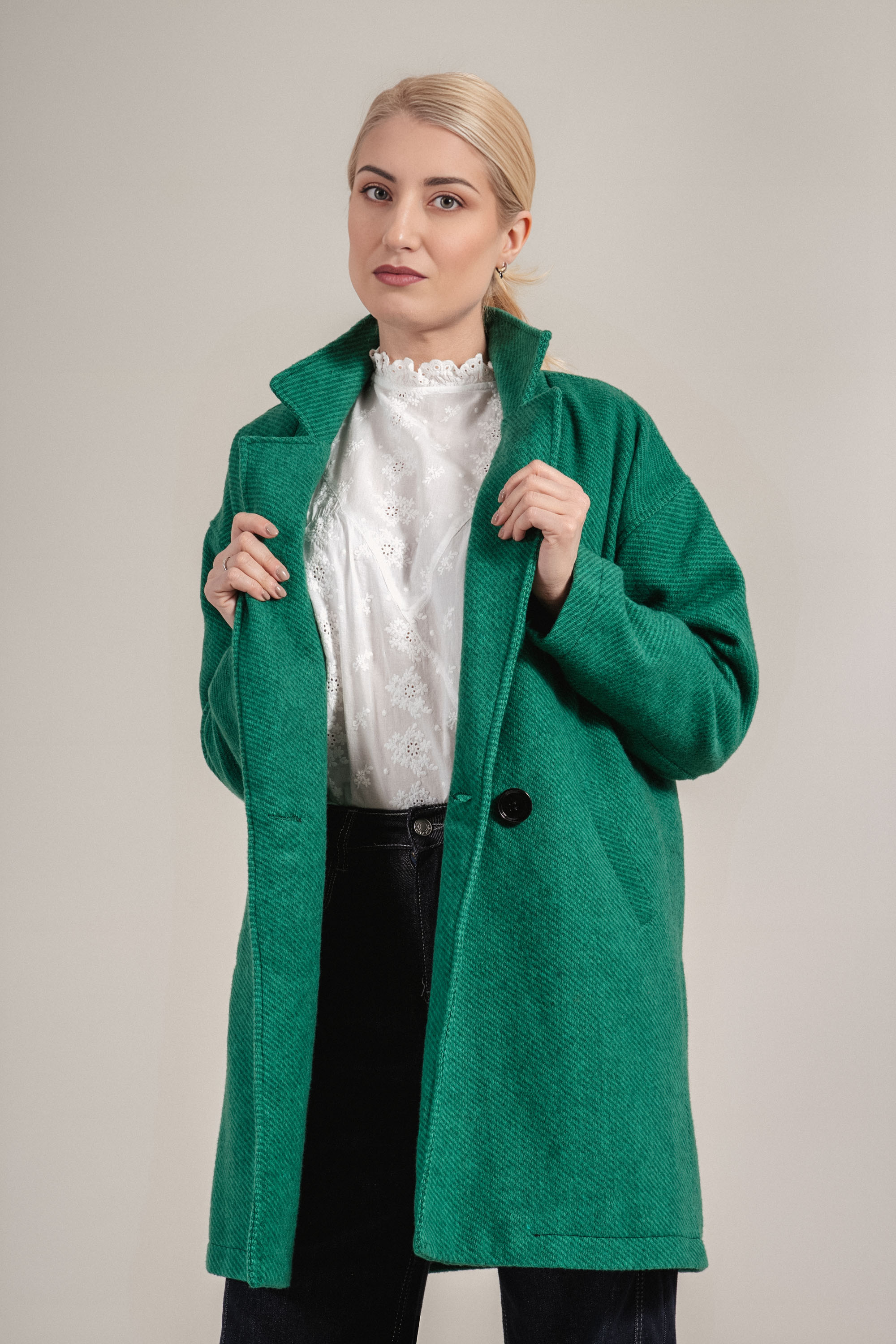Елегантно палто в зелен нюанс с изчистен дизайн и класическа ревер яка. Двуредното закопчаване подчертава фигурата. Произведено в България, този модел е чудесен избор за хладните месеци и се комбинира отлично с дънки или рокля.