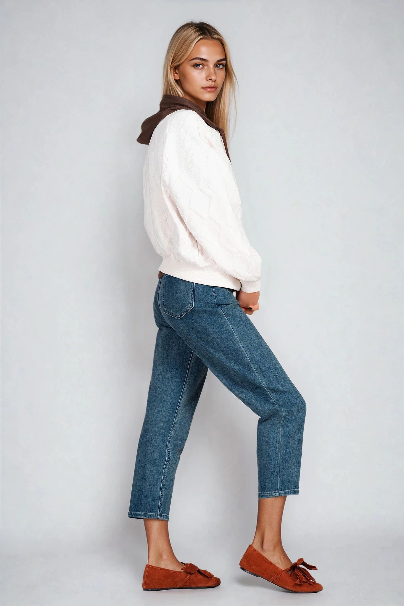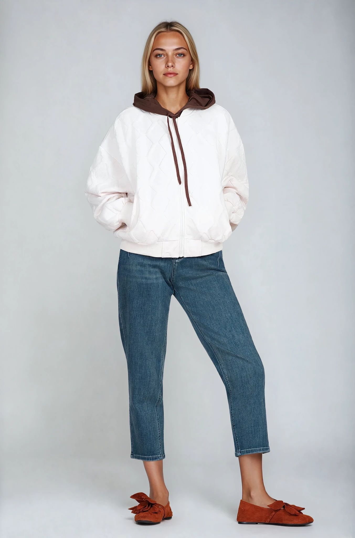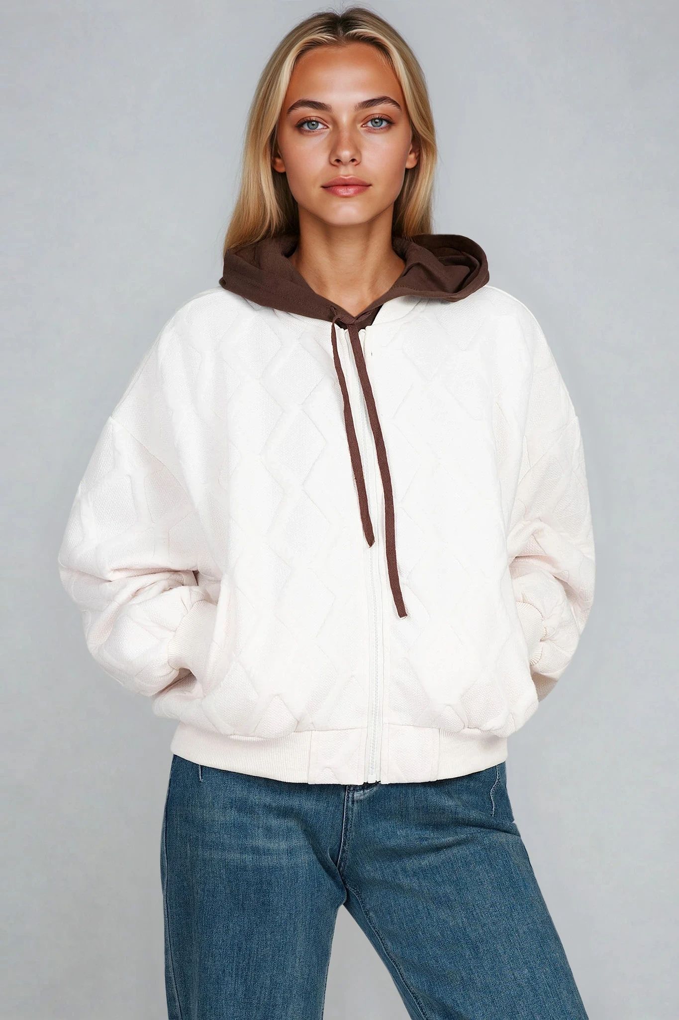 Леко пролетно-есенно яке с модерна бомбър визия и релефен ромбоиден десен. Изработено от мек памук с еластан, моделът предлага комфорт и свобода на движение. Дизайнът е завършен с ластик на ръкавите и в долната част, което подчертава спортно-елегантната му визия. Ципът отпред и неутралният цвят го правят лесно за комбиниране с различни стиловe.