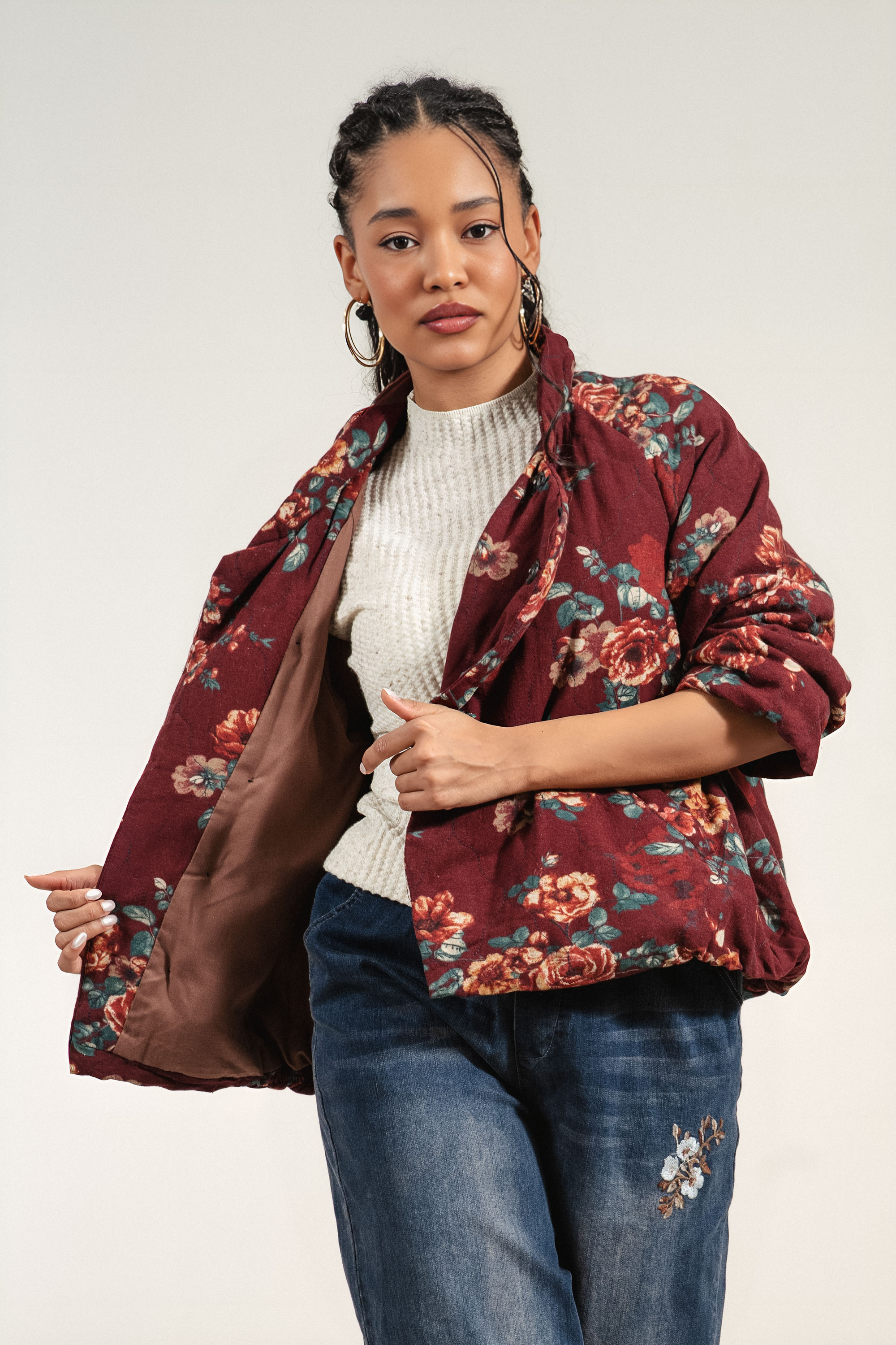 Това преходно яке в наситено бордо е декорирано с винтидж флорален принт в зелено и оранжево. Изработено от естествена материя с малко коноп за здравина и устойчивост. Моделът е с яка, джобове, ластични маншети за удобство. Закопчаването с тик-так копчета го прави лесно за носене през пролетта и есента.