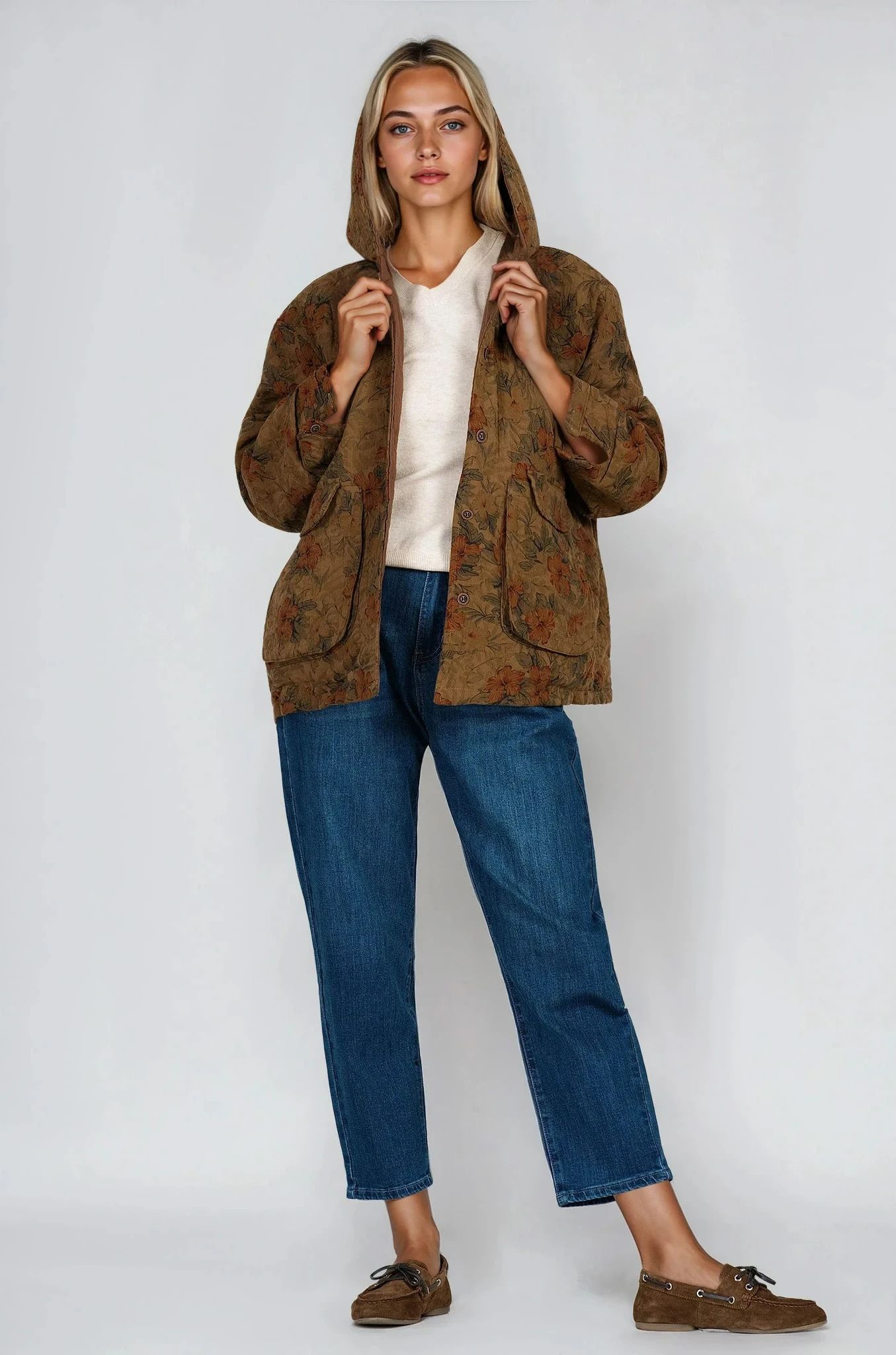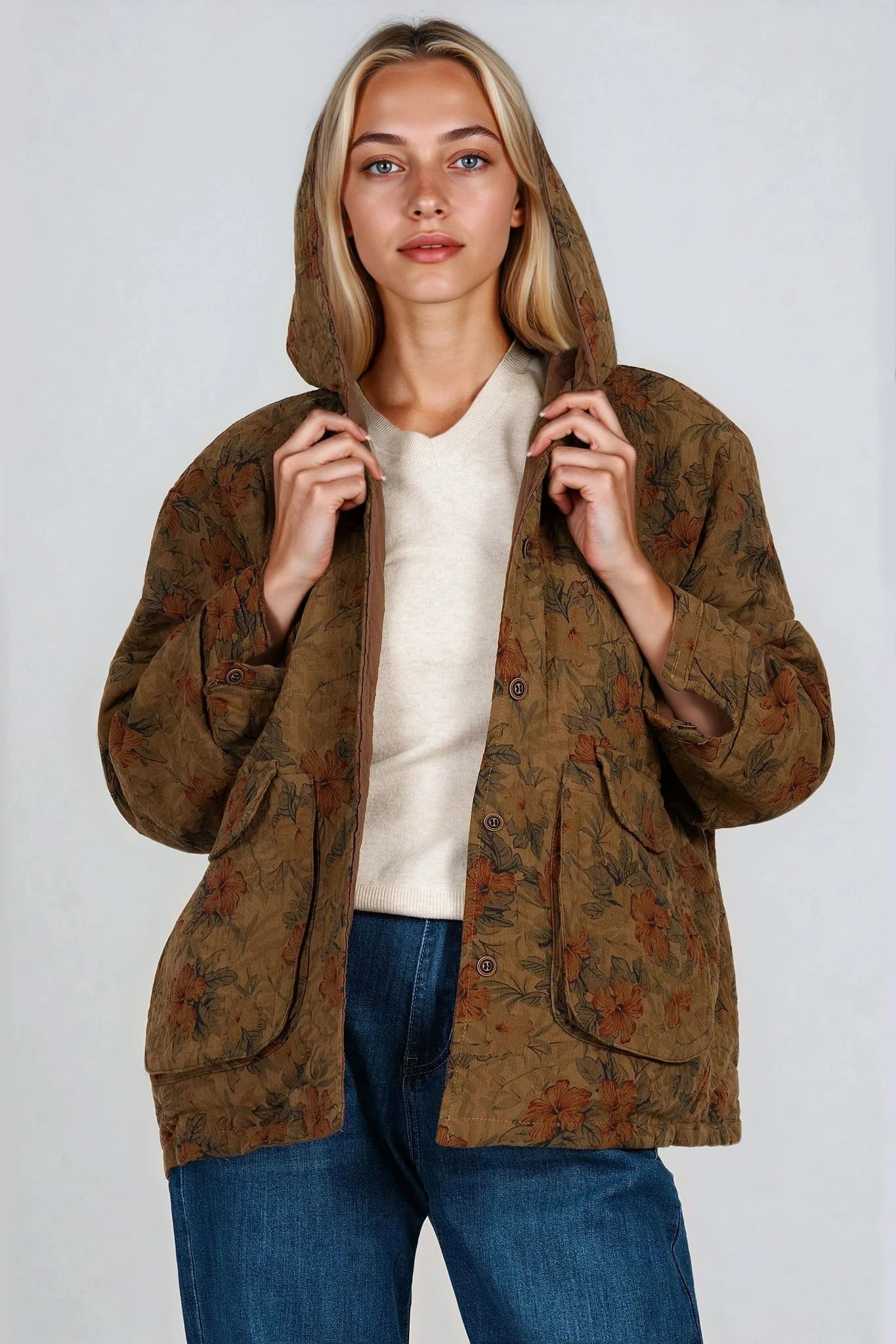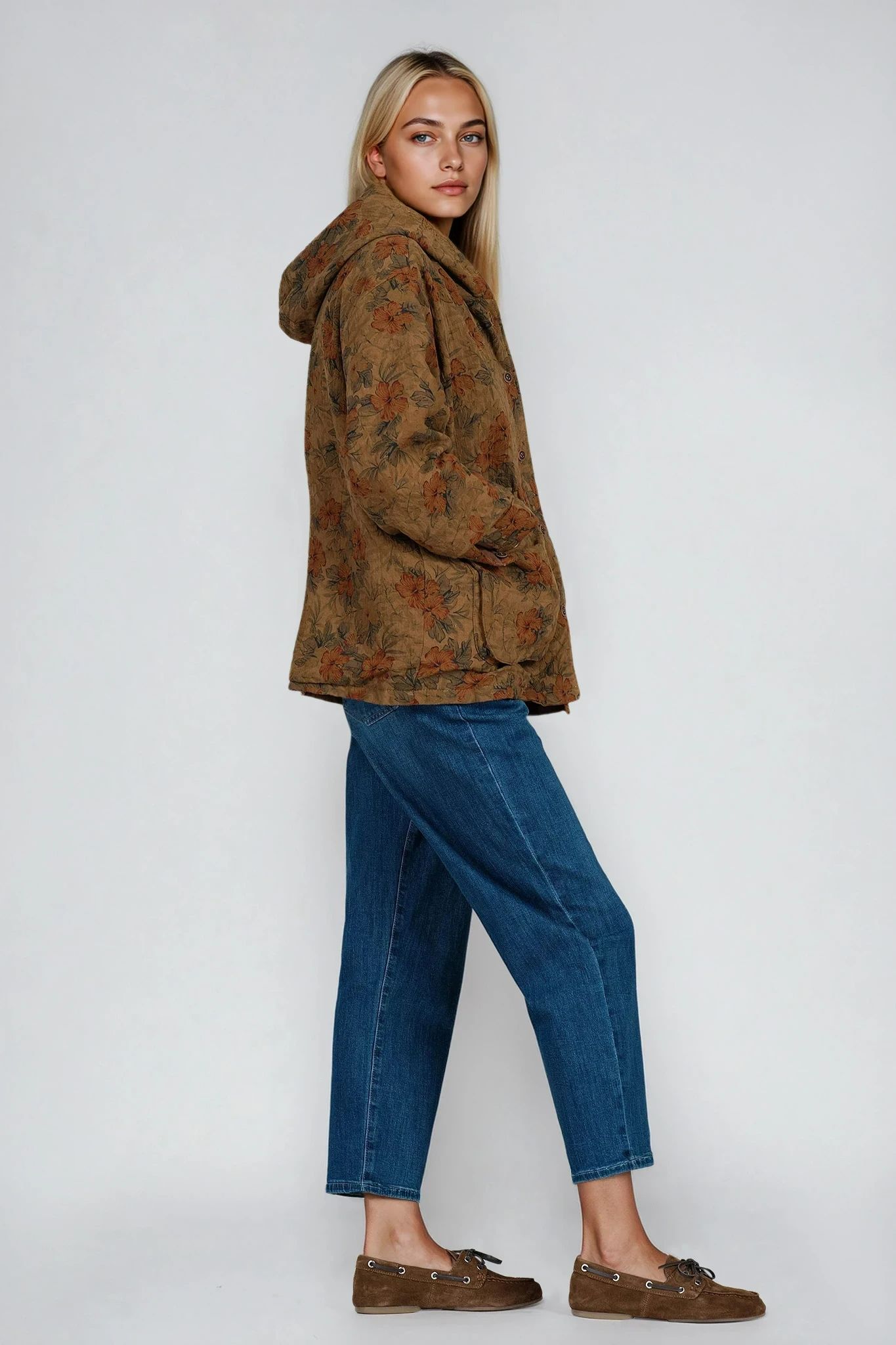 Това леко капитонирано яке е идеален избор за преходните сезони. Изработено от естествени материали, то съчетава практичност и стил с флорален принт в оранжево. Декорирано с качулка, джобове с капак и закопчаване с копчета, моделът предлага комфорт и функционалност във всяко ежедневие.