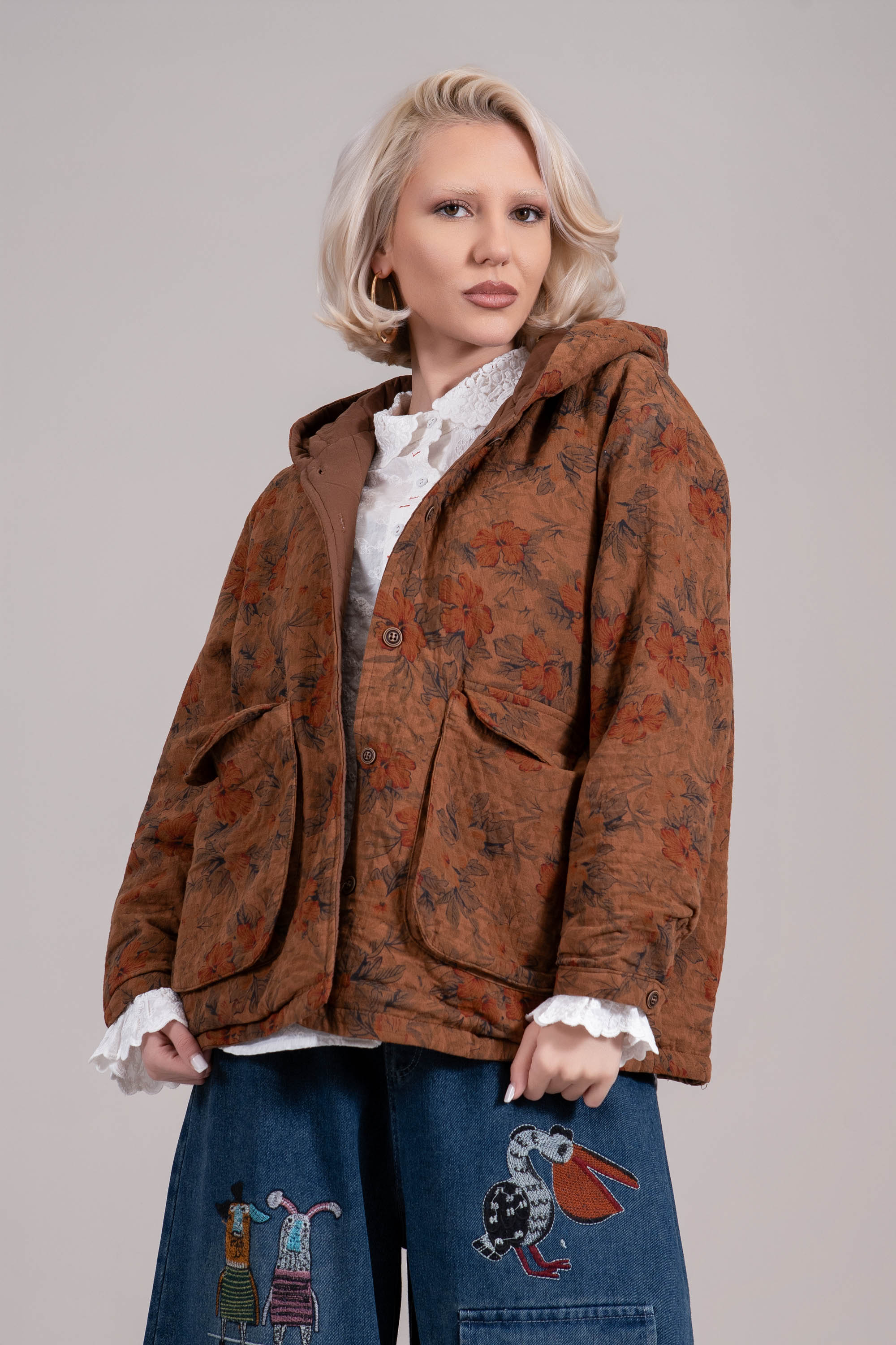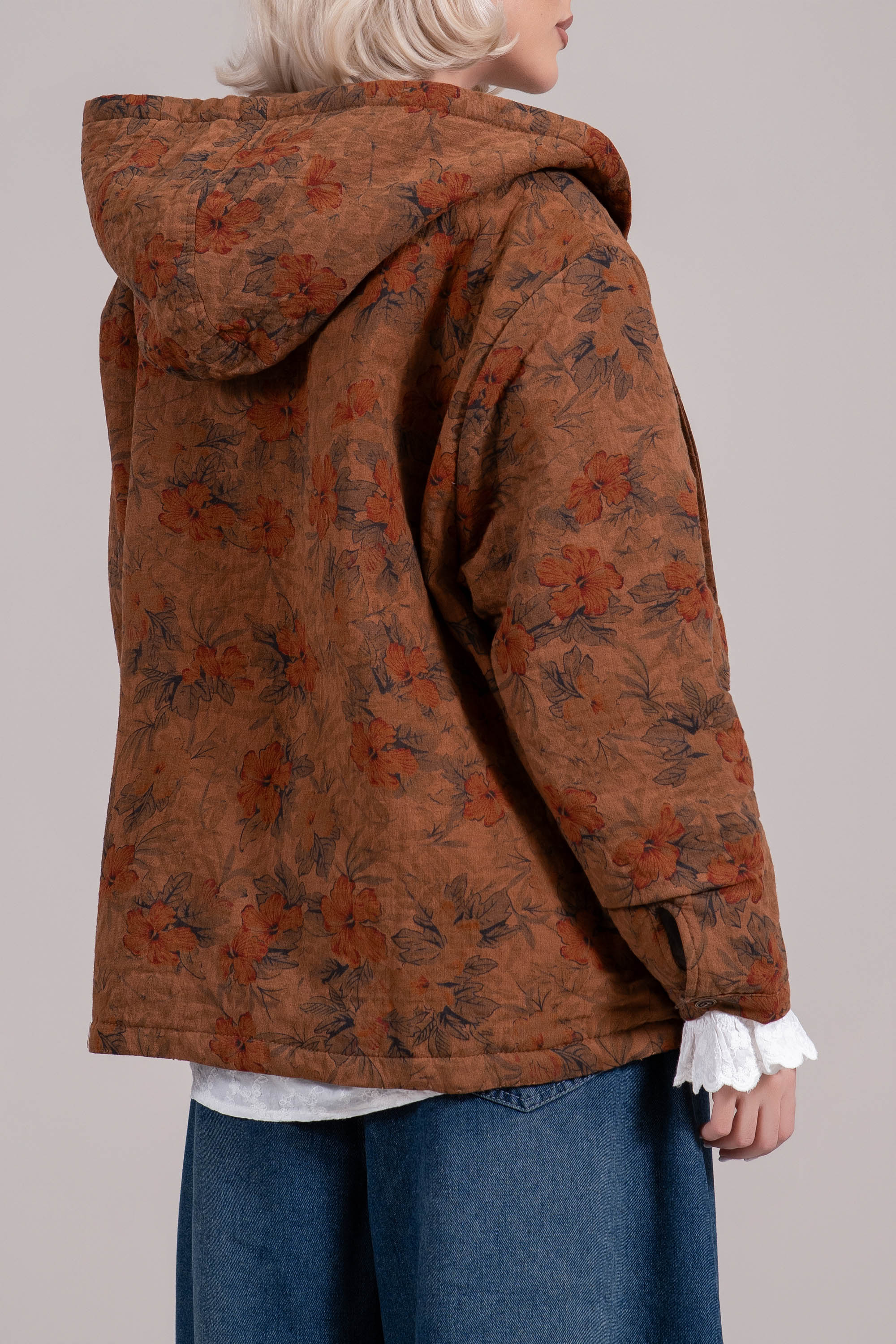 Дамско преходно яке от памук в кафяво с цветен принт и качулка