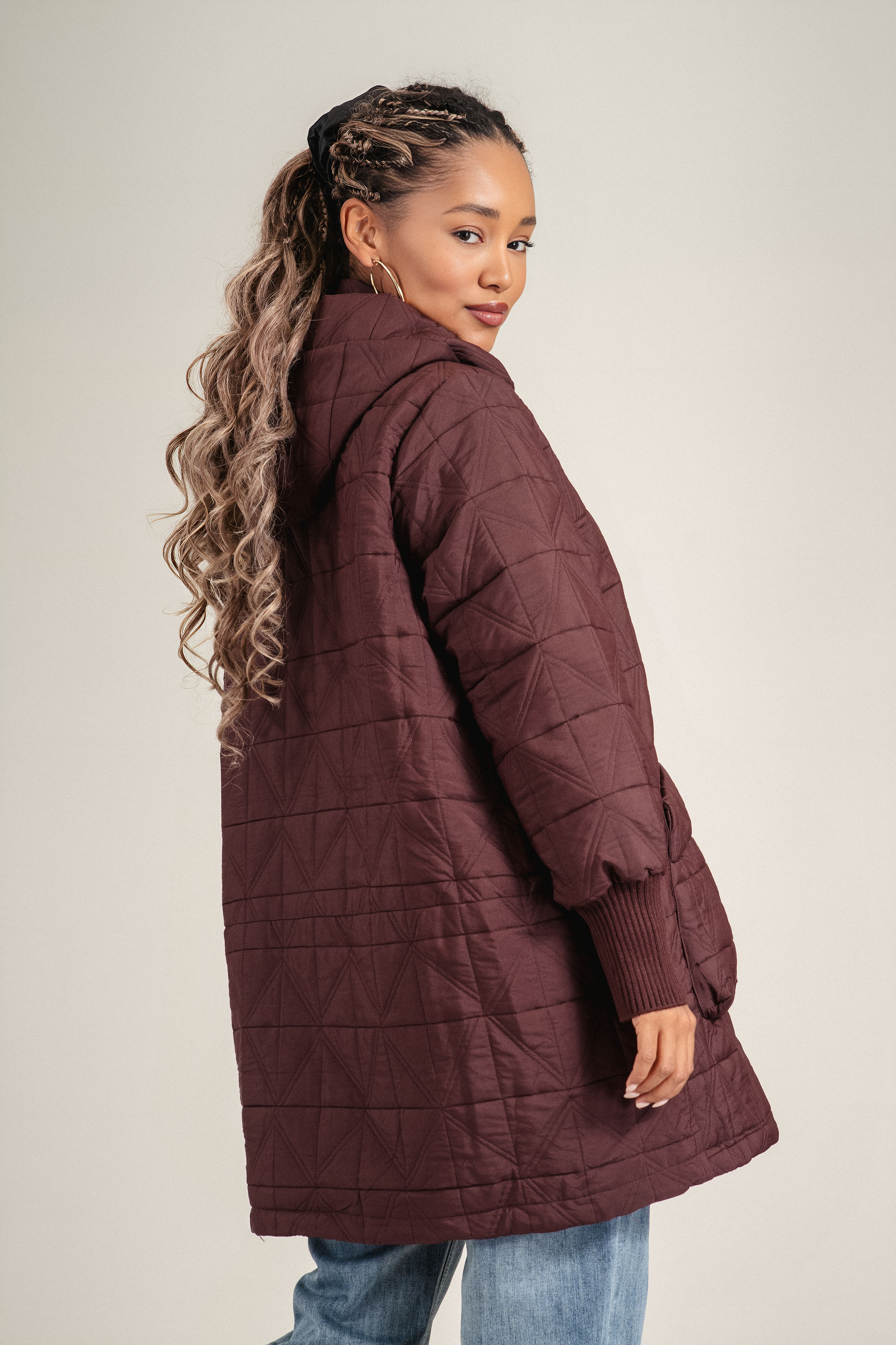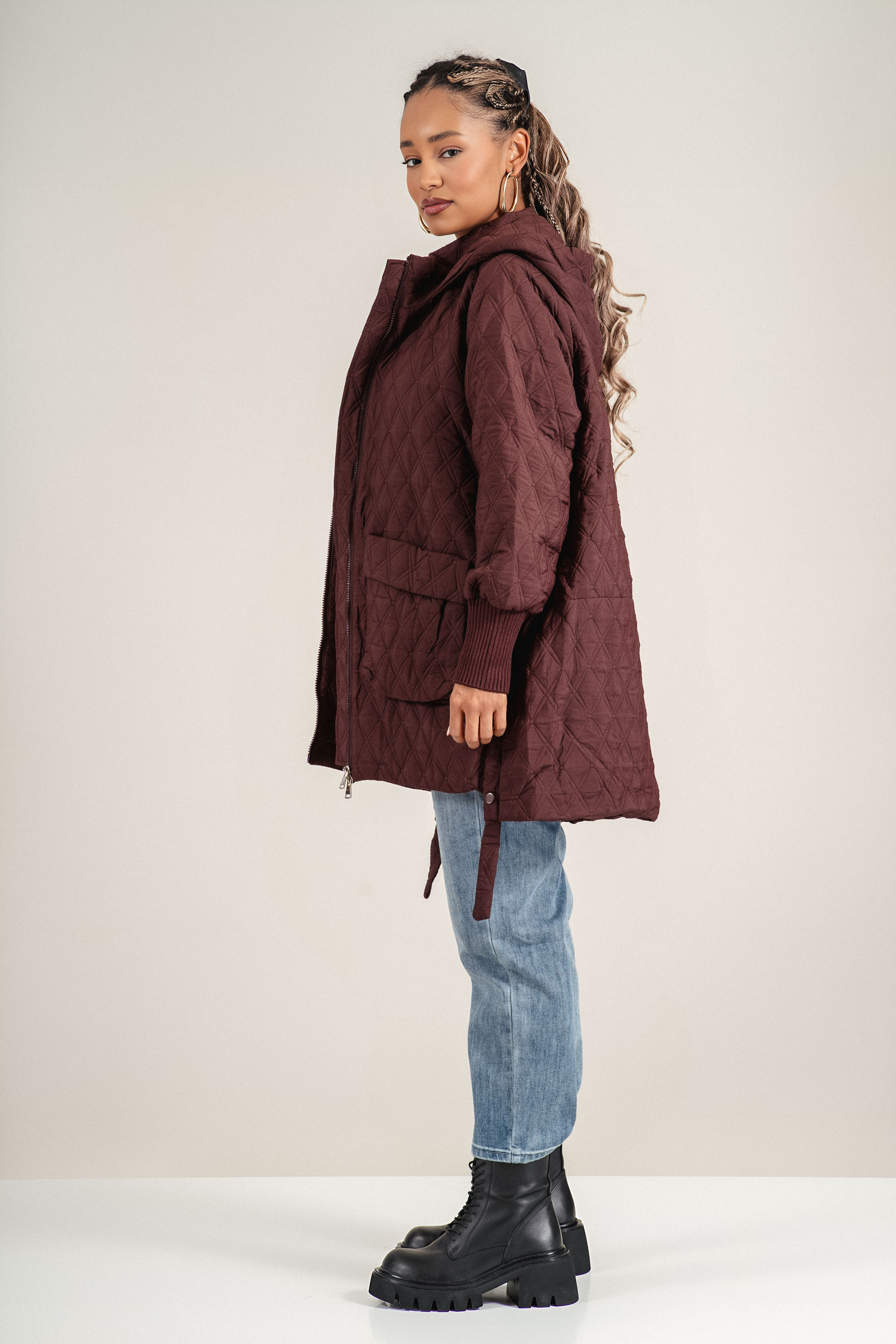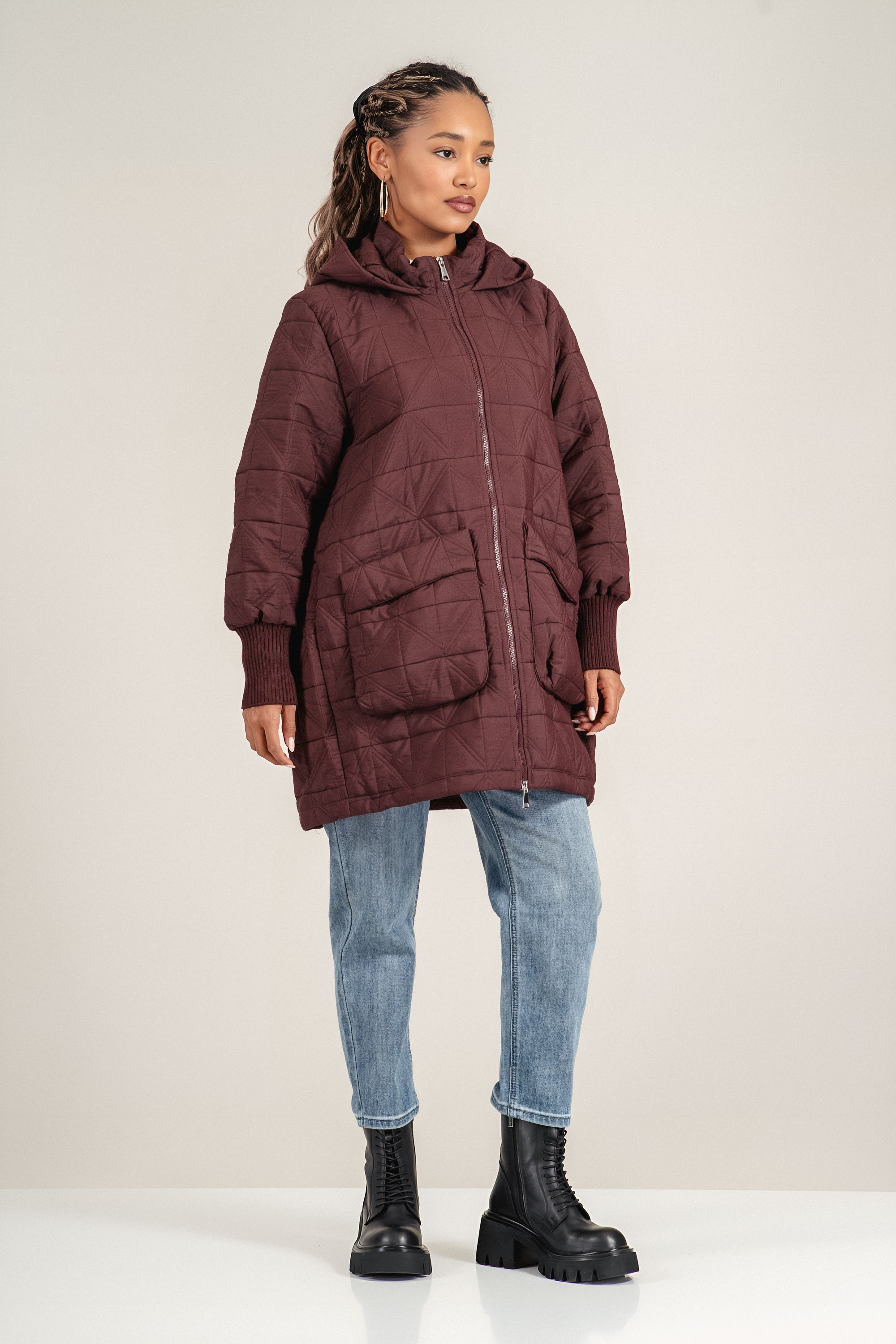 Удобно и практично яке с дължина до ханша, изработено лилав патладжанен цвят. Моделът разполага с качулка, цип и джобове. Капитонирано е на големи триъгълници .Подходящо за преходни сезони.