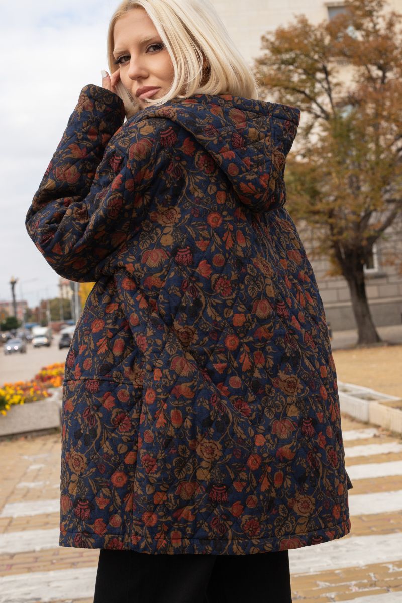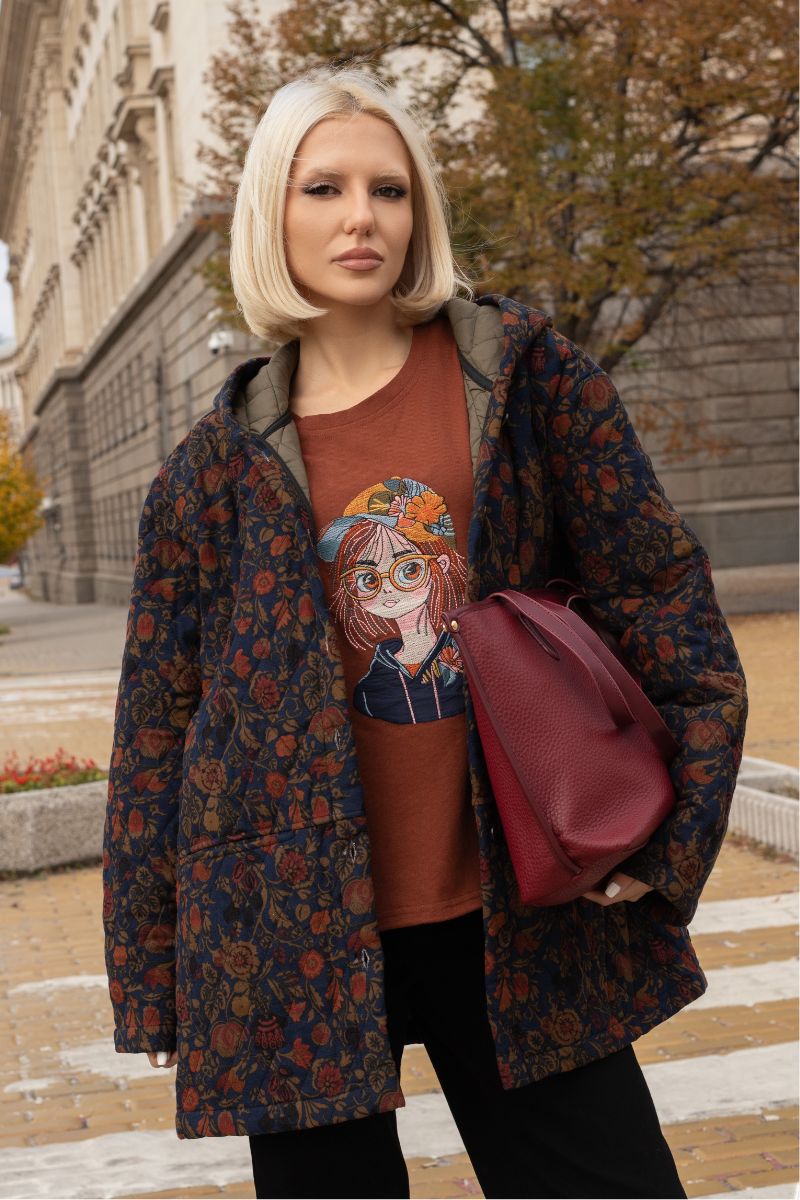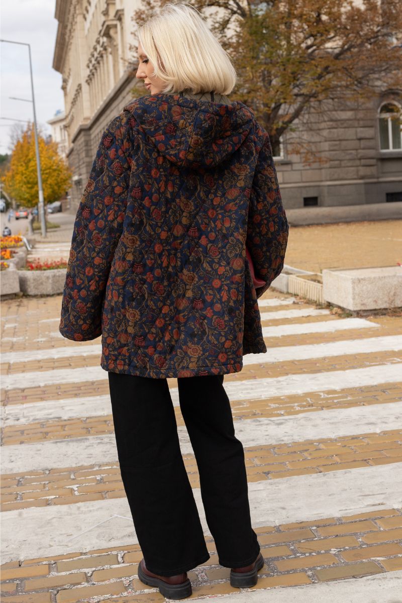 Дамско синьо преходно яке с качулка и флорален принт в червено и кафяво